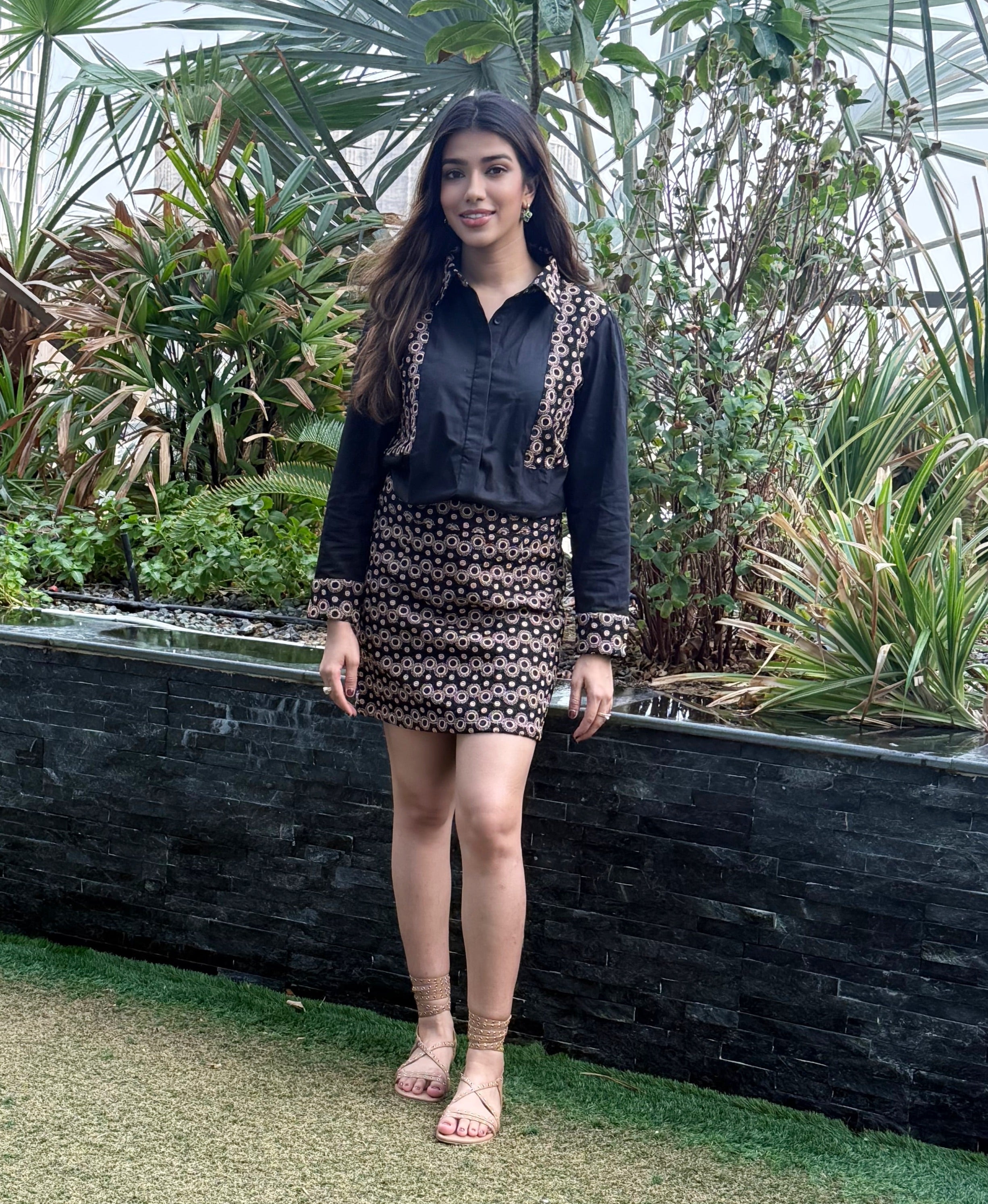 The Opulent Noir Co-ord is a bold statement in modern glamour. It features a structured black shirt with intricate circular embroidery along the collar, cuffs, and panels, paired with a matching embroidered mini skirt. This set strikes the perfect balance between elegance and edge. Designed for the confident woman, it’s a head-turning ensemble made for soirées, cocktails, and everything in between.