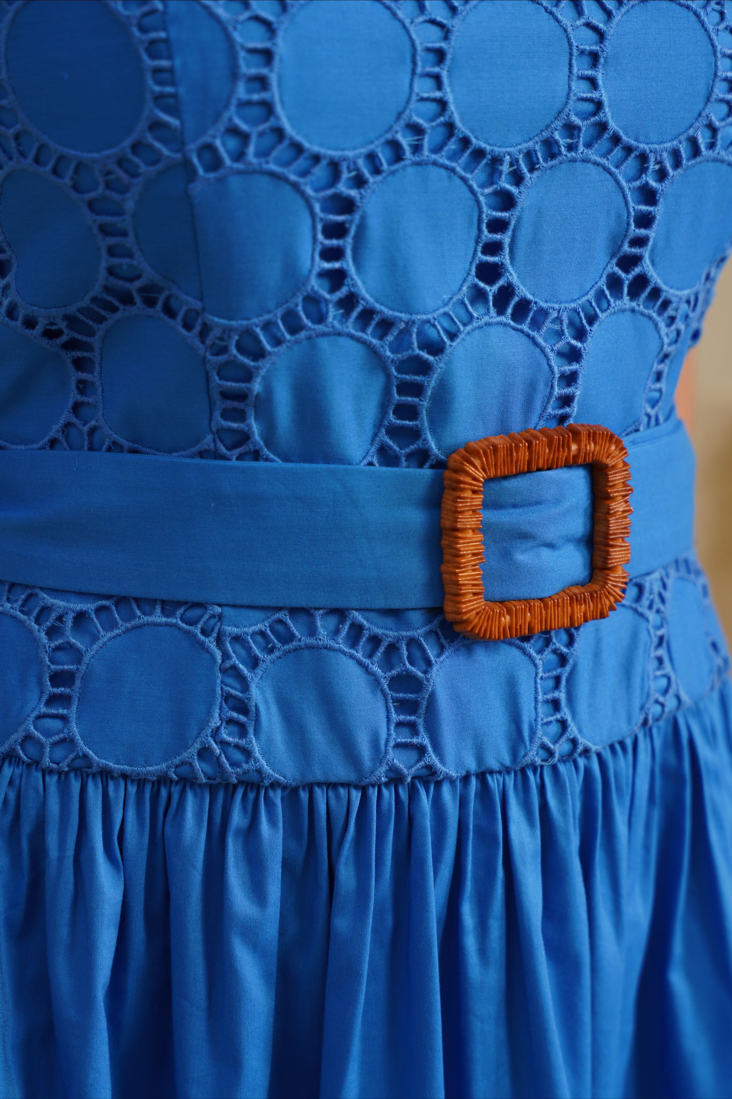 - Color: Striking blue with embroidery