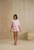 This Bloom Co-ord is a dreamy fusion of structure and femininity. Crafted in soft blush cotton with delicate floral embroidery, it features a relaxed button-down shirt with scalloped sleeves paired with matching shorts edged in lace-like cutwork. Effortlessly chic, this set is perfect for days that call for comfort with a touch of romance.