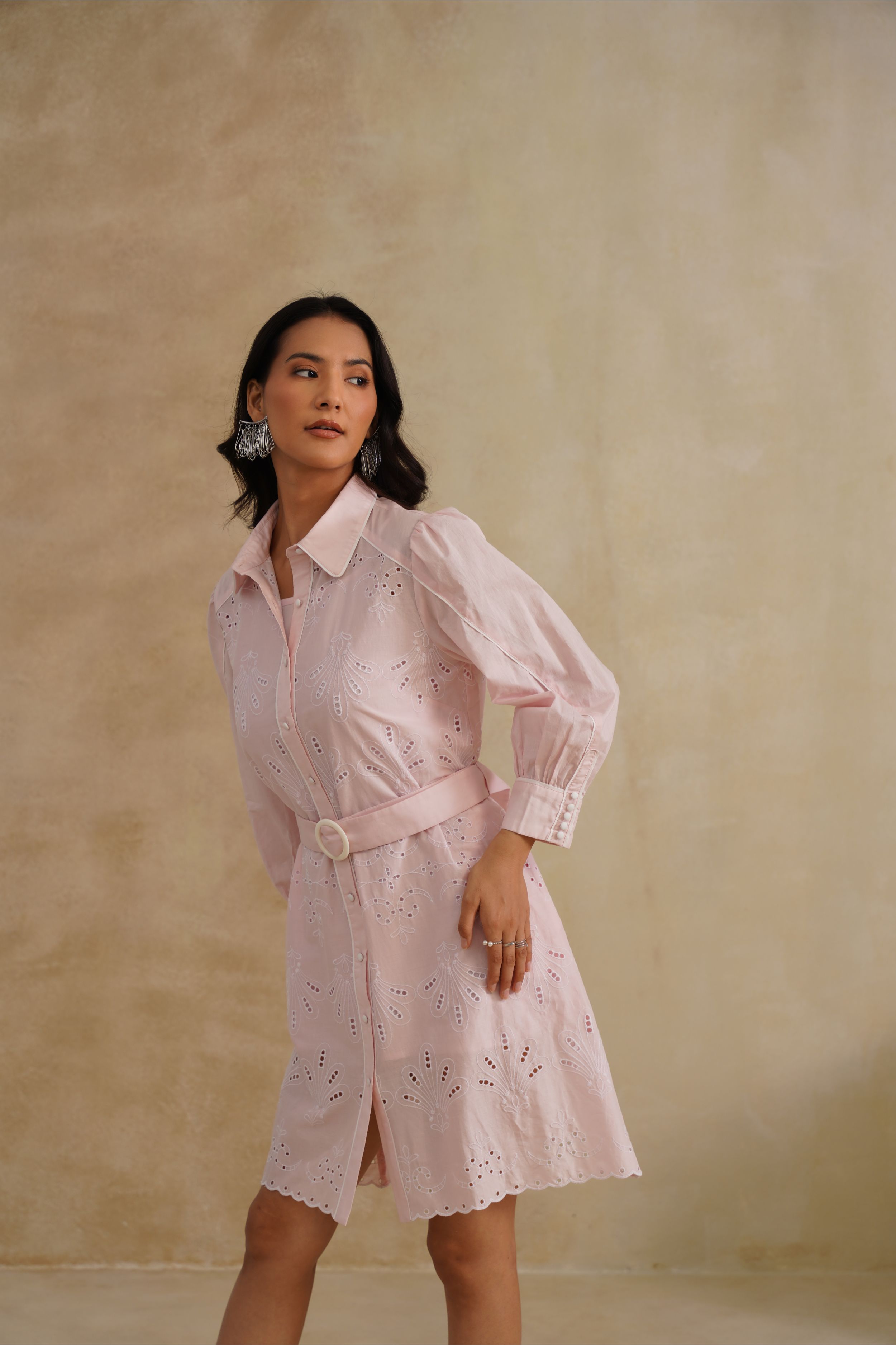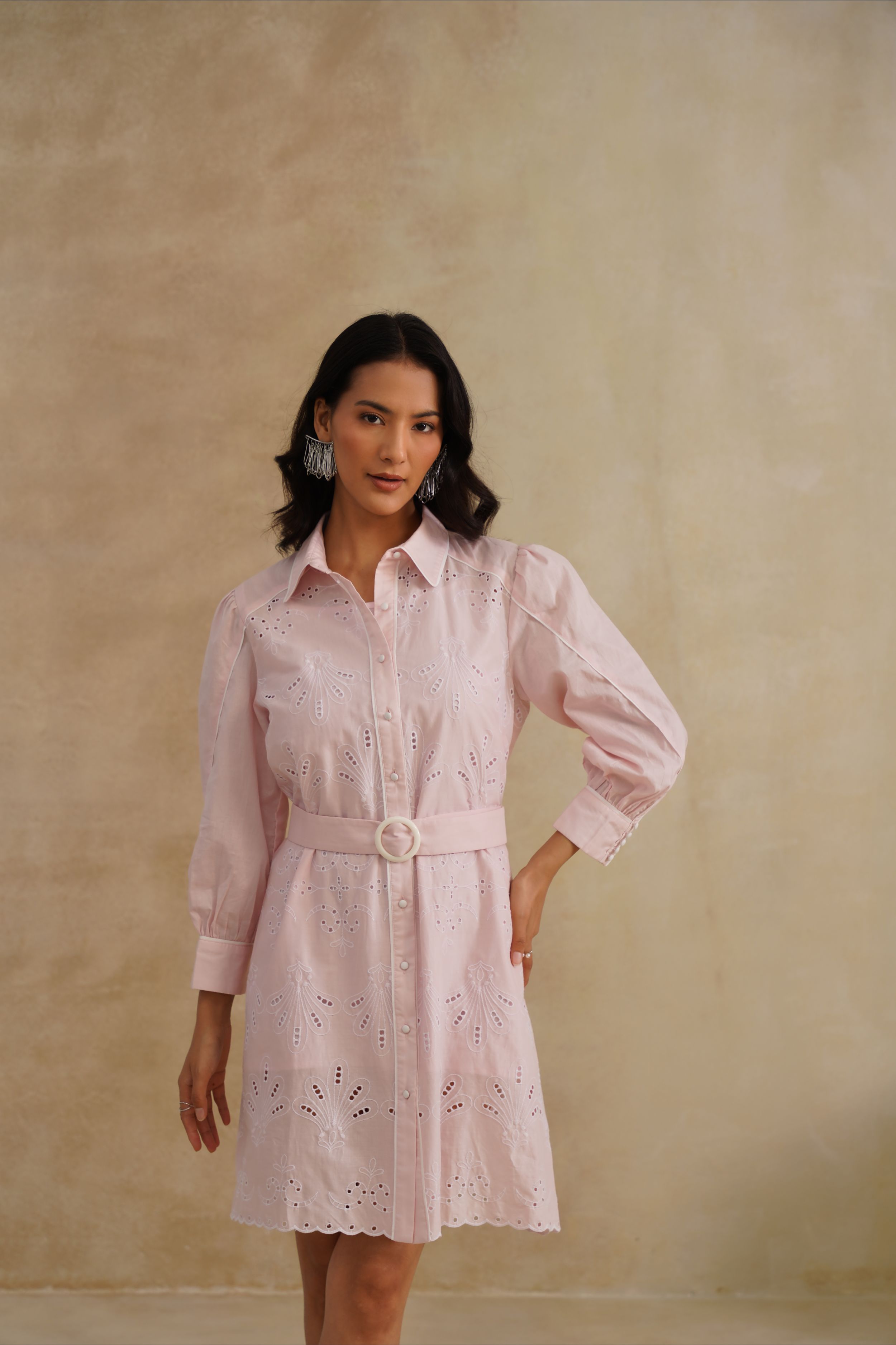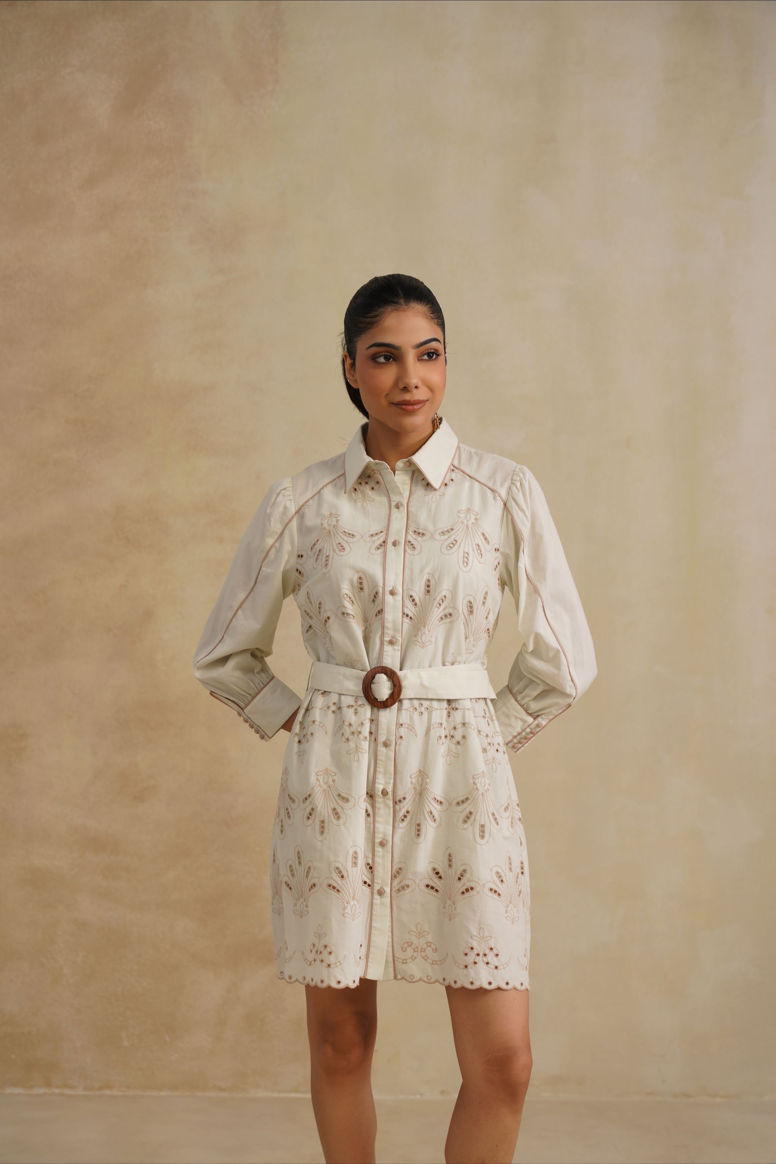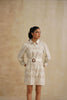 This Bloom Shirt Dress is a fresh take on timeless tailoring with a feminine twist. Crafted in embroidered cotton with delicate cutwork, it features a classic collared neckline, structured shoulders, and a belted waist that flatters the silhouette. Finished with scalloped hems and intricate floral motifs, this dress is where crisp elegance meets effortless charm.