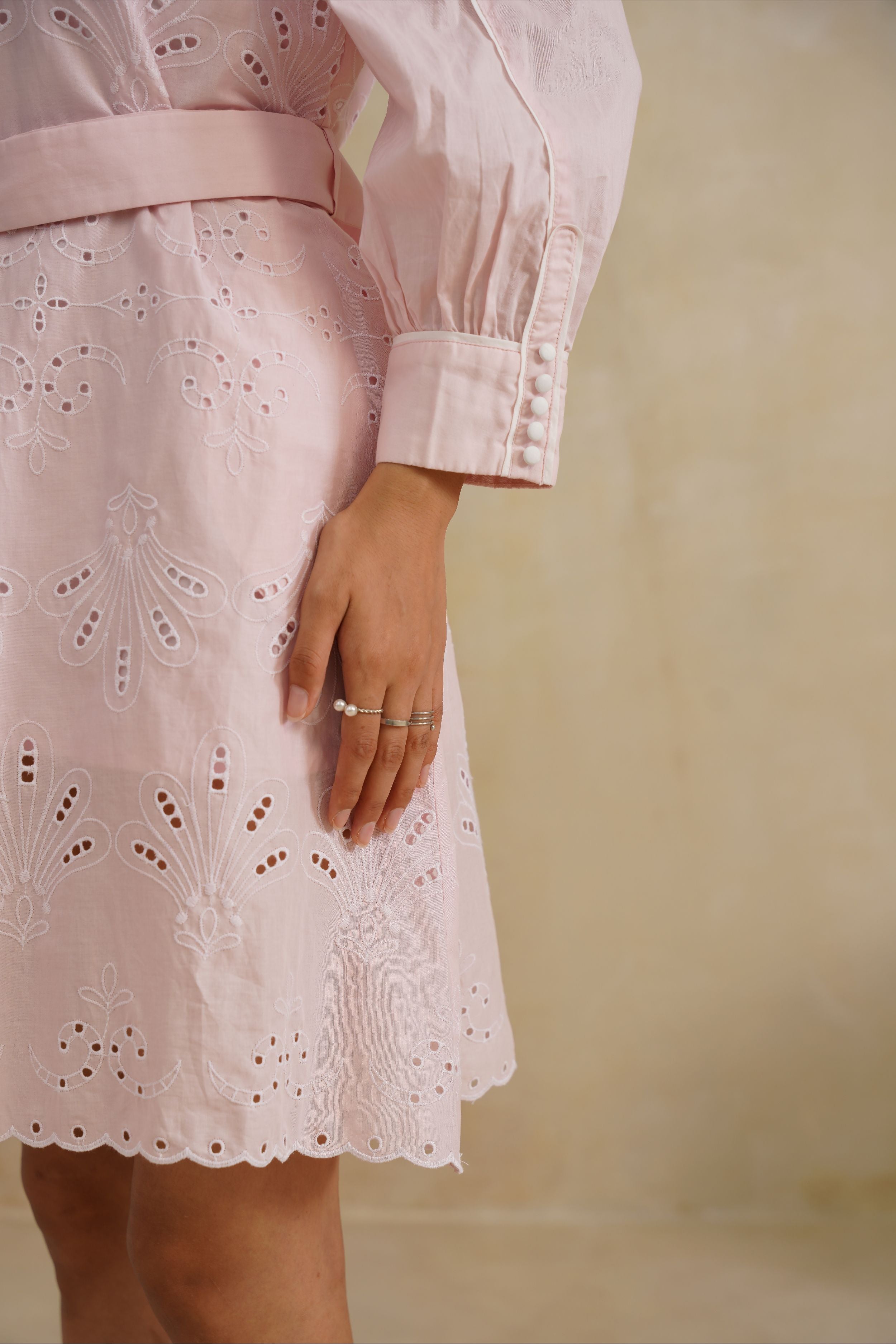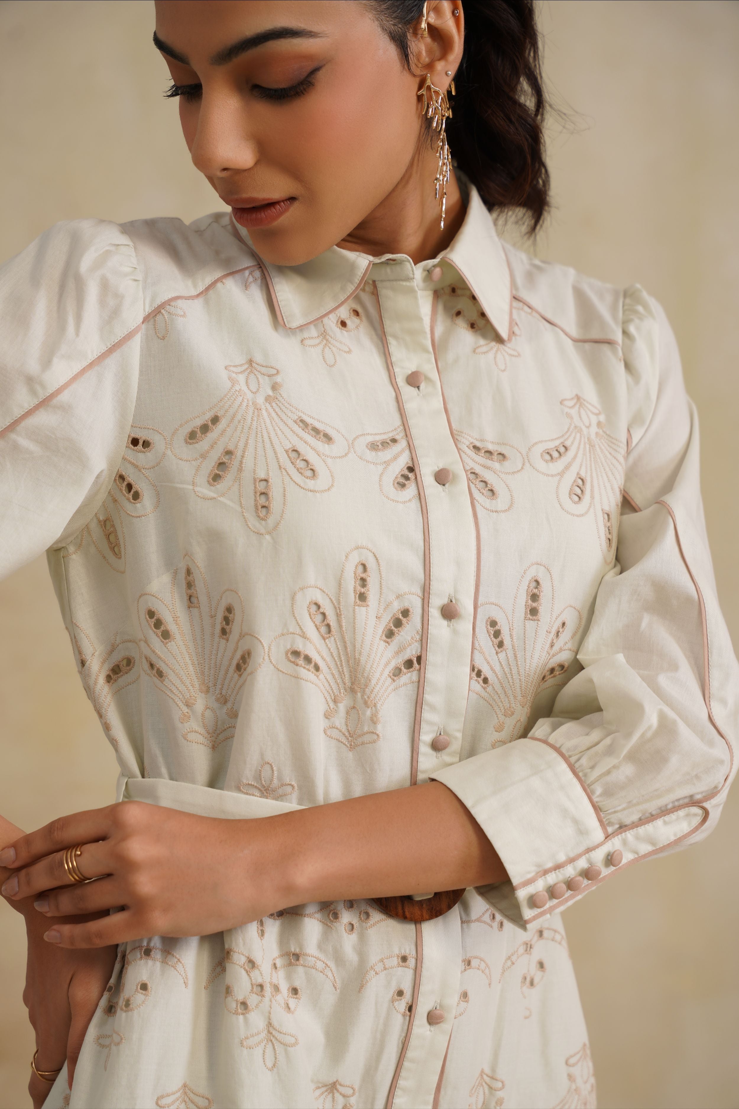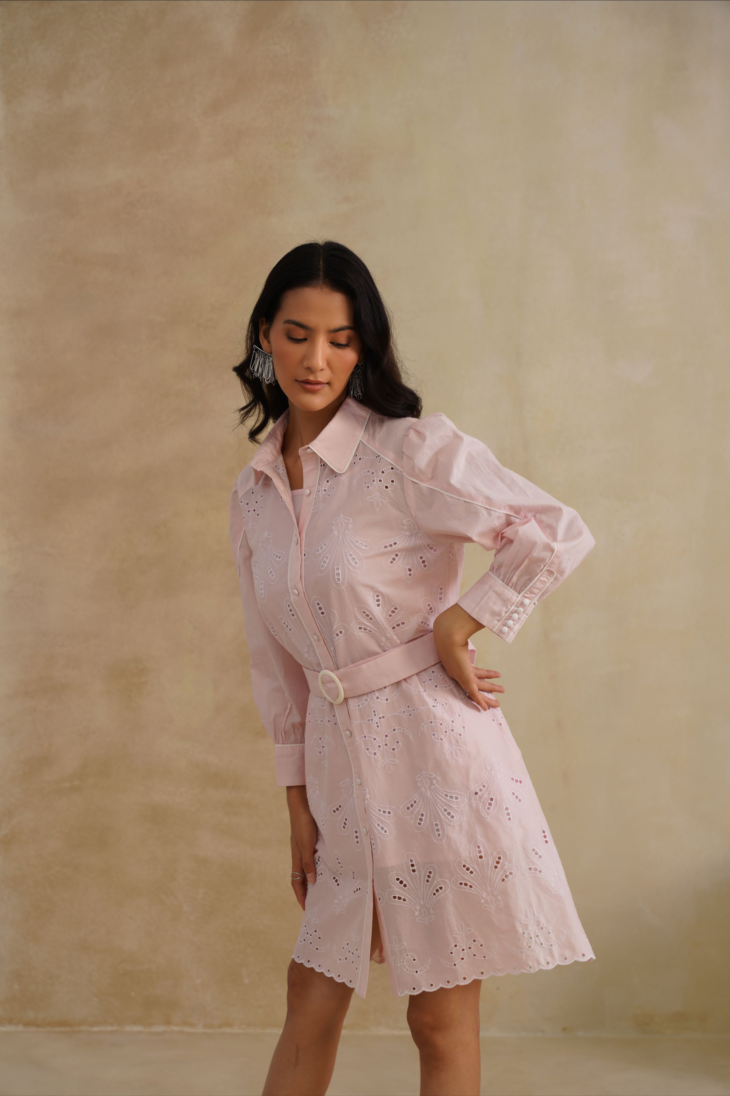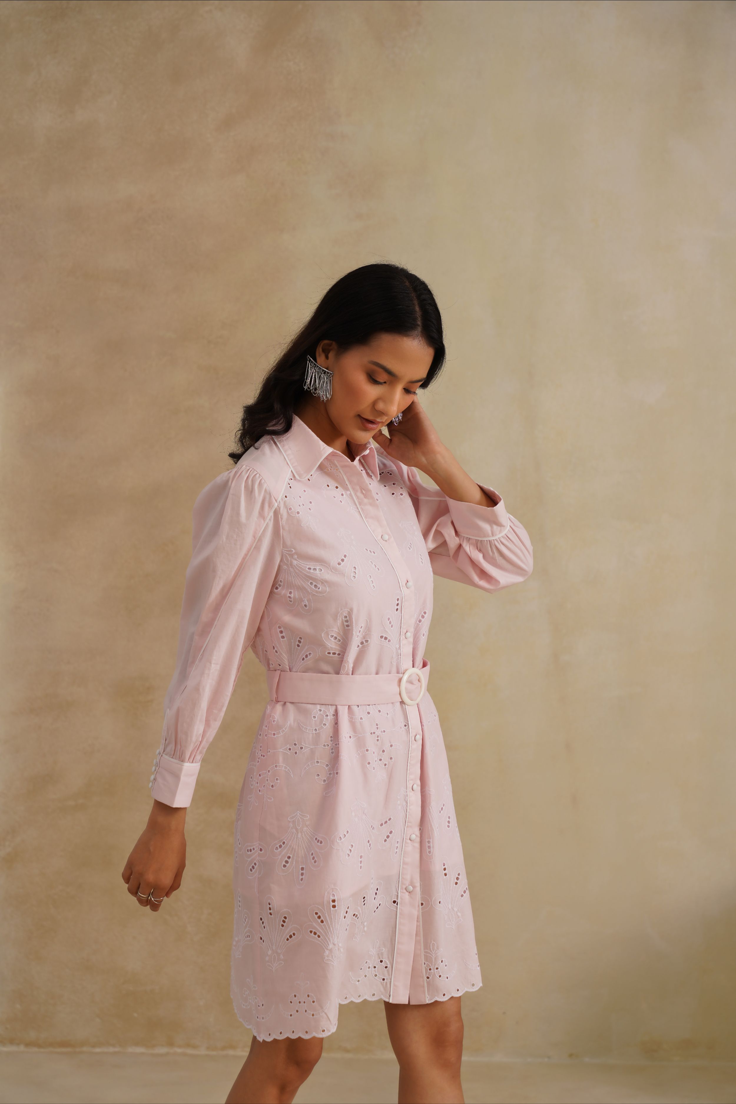 This Bloom Shirt Dress is a fresh take on timeless tailoring with a feminine twist. Crafted in embroidered cotton with delicate cutwork, it features a classic collared neckline, structured shoulders, and a belted waist that flatters the silhouette. Finished with scalloped hems and intricate floral motifs, this dress is where crisp elegance meets effortless charm.