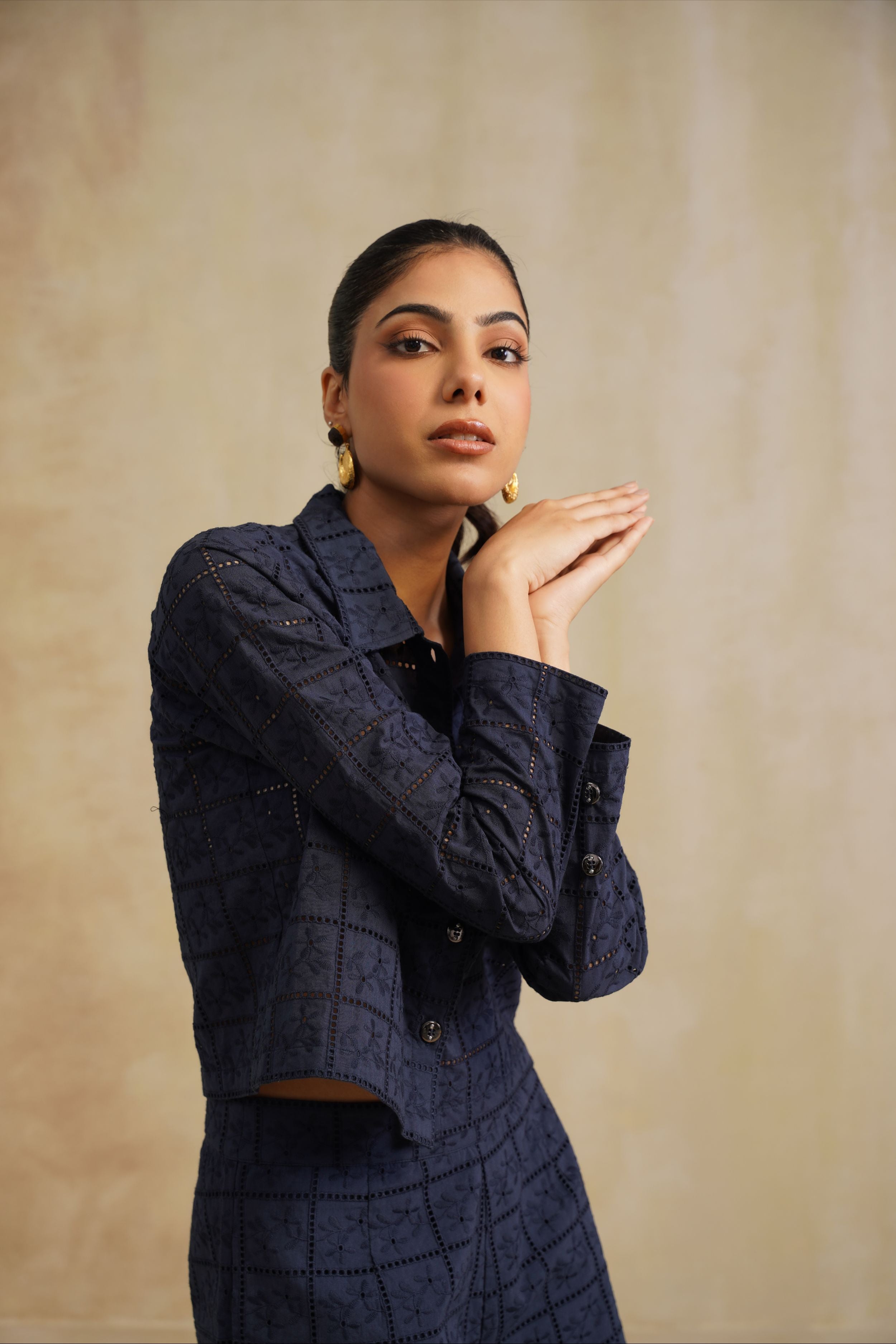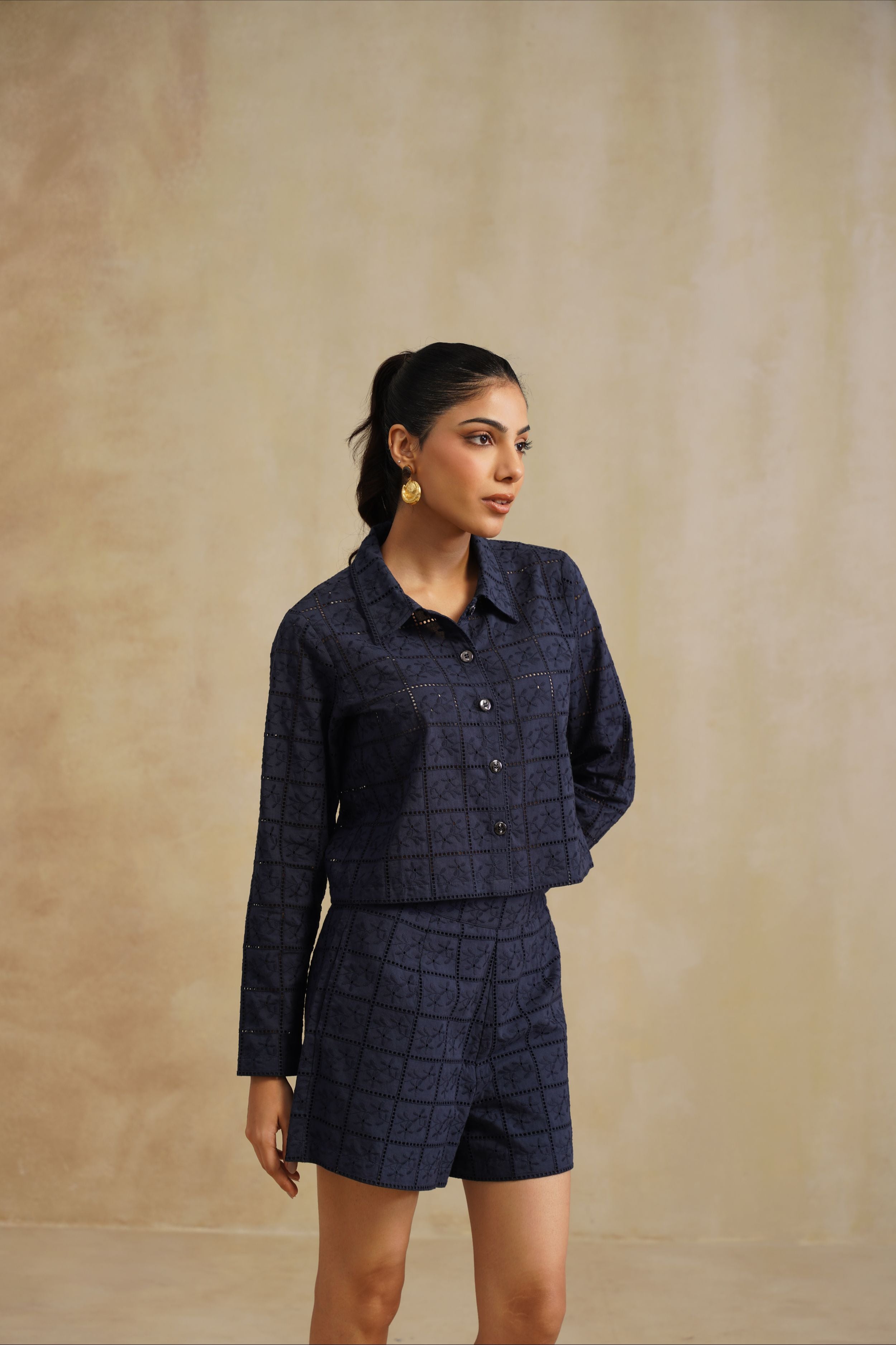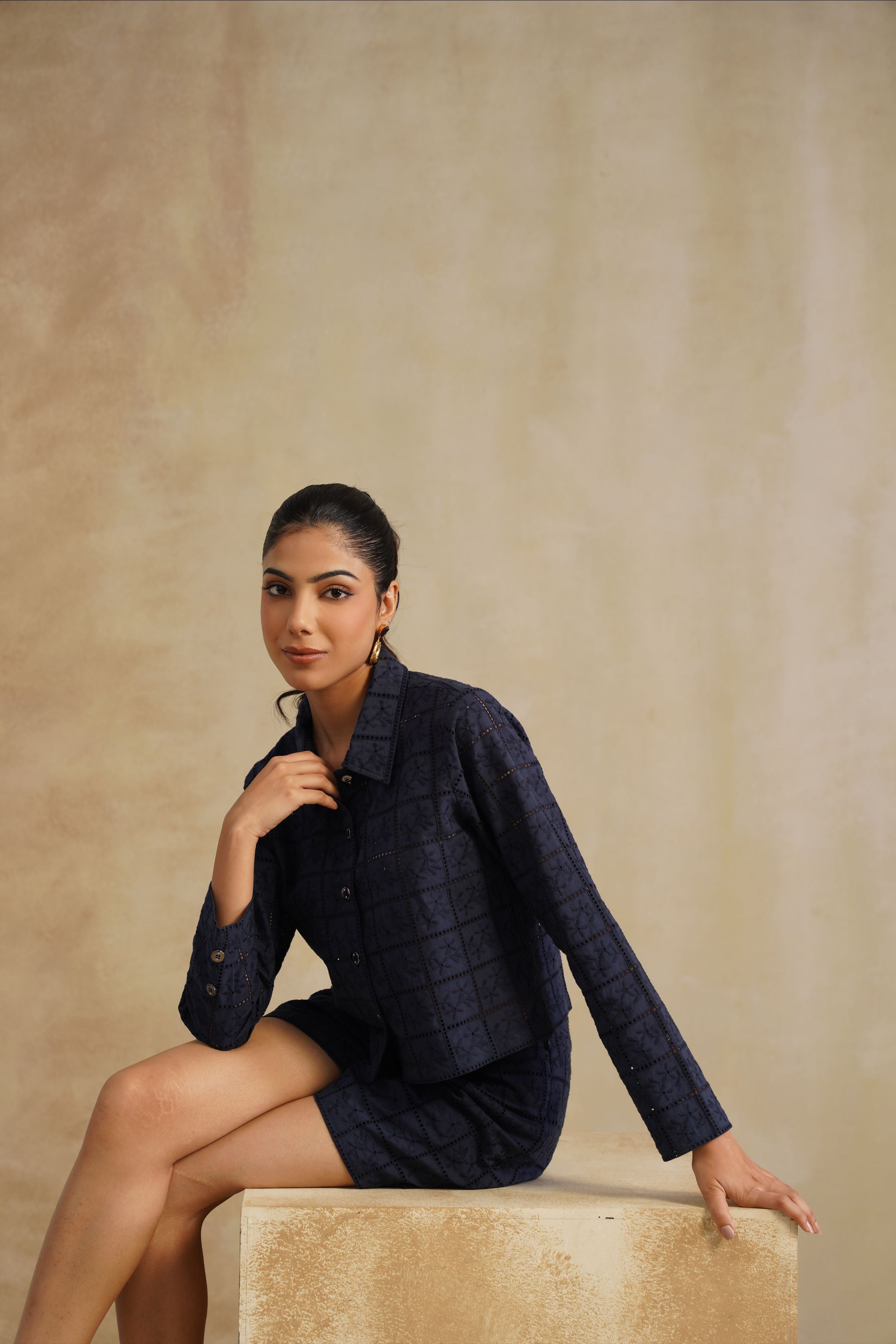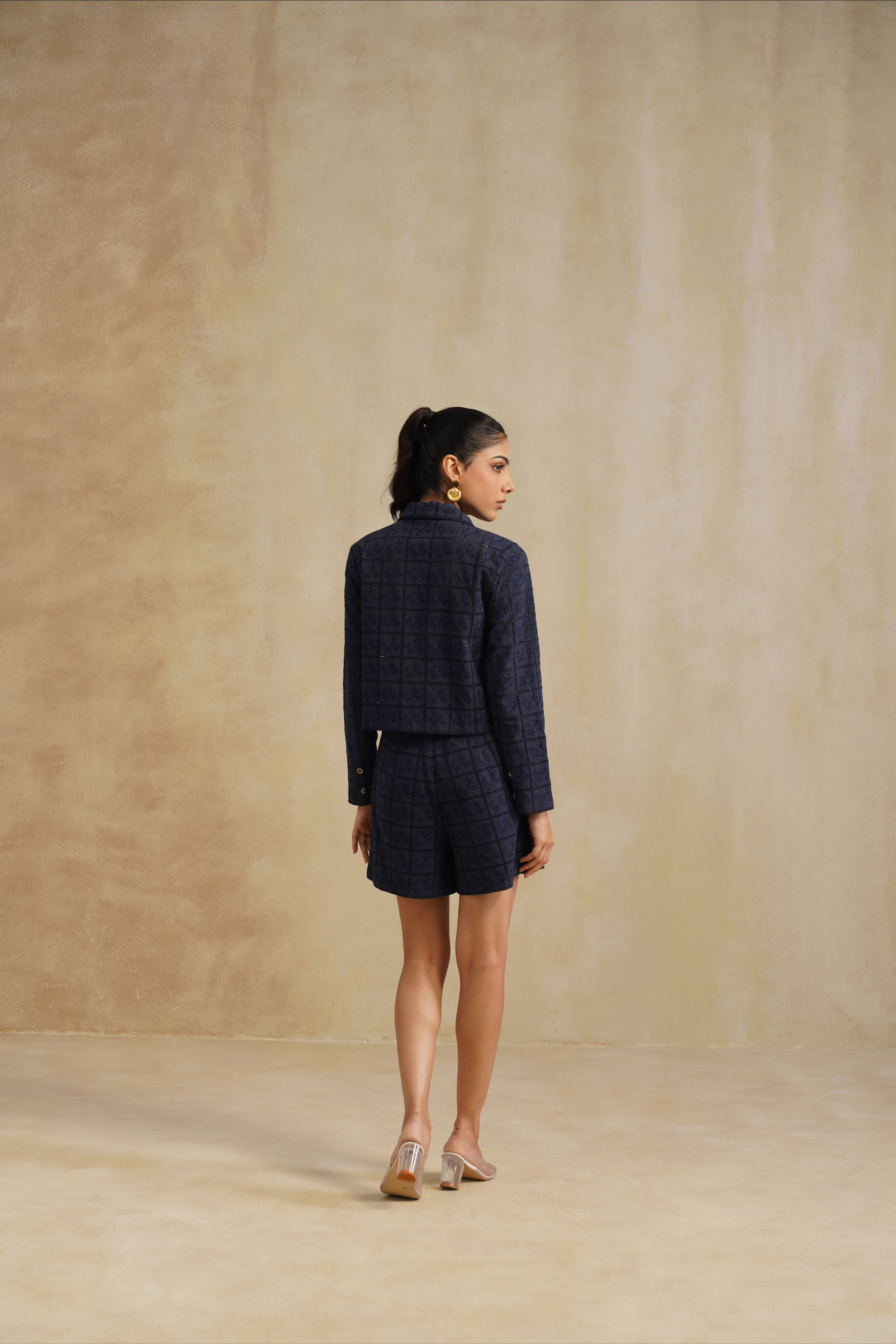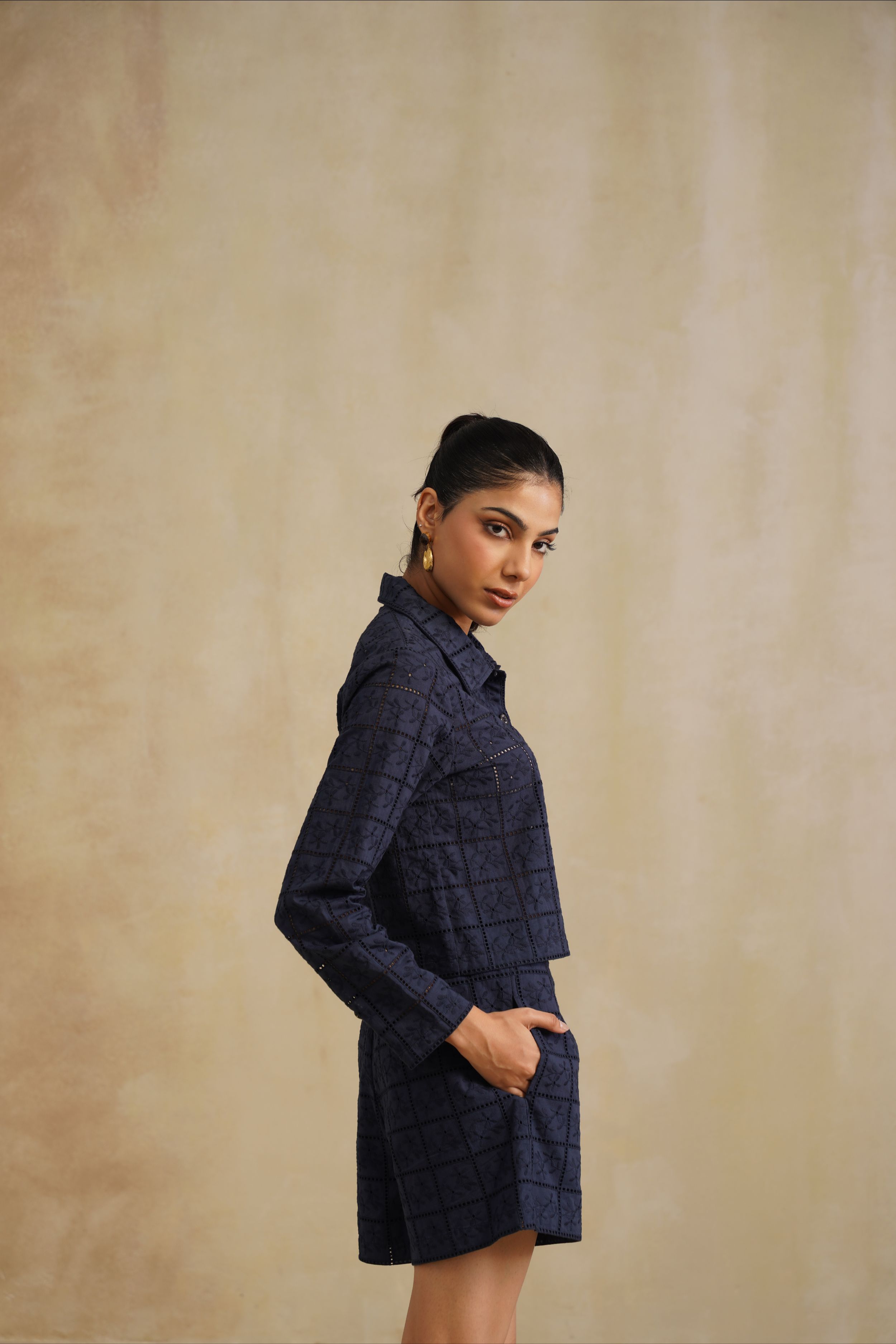 This timeless short shirt features checkered embroidred pattern for added depth, creating an elegant, sophisticated silhouette that's perfect for power dressing.