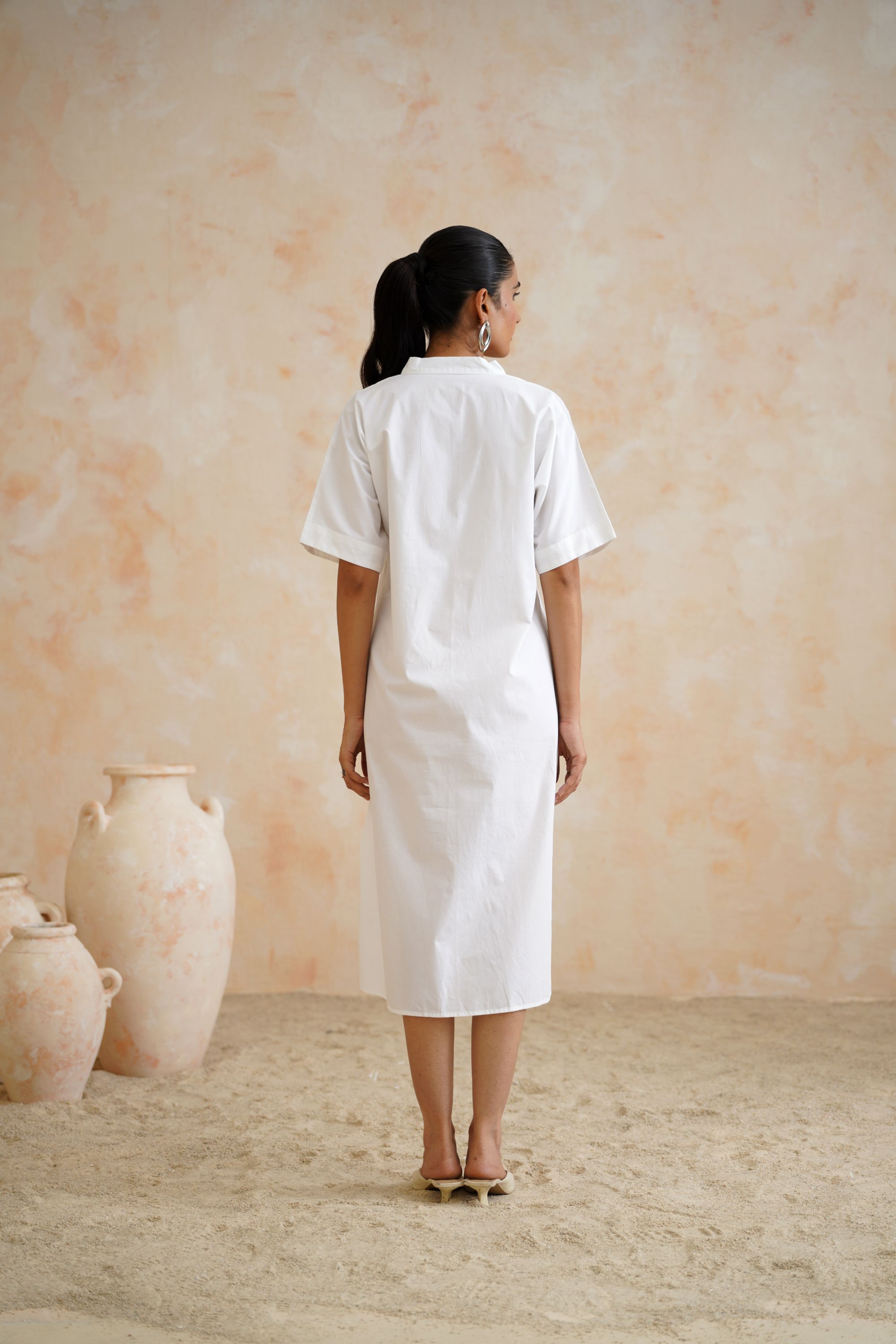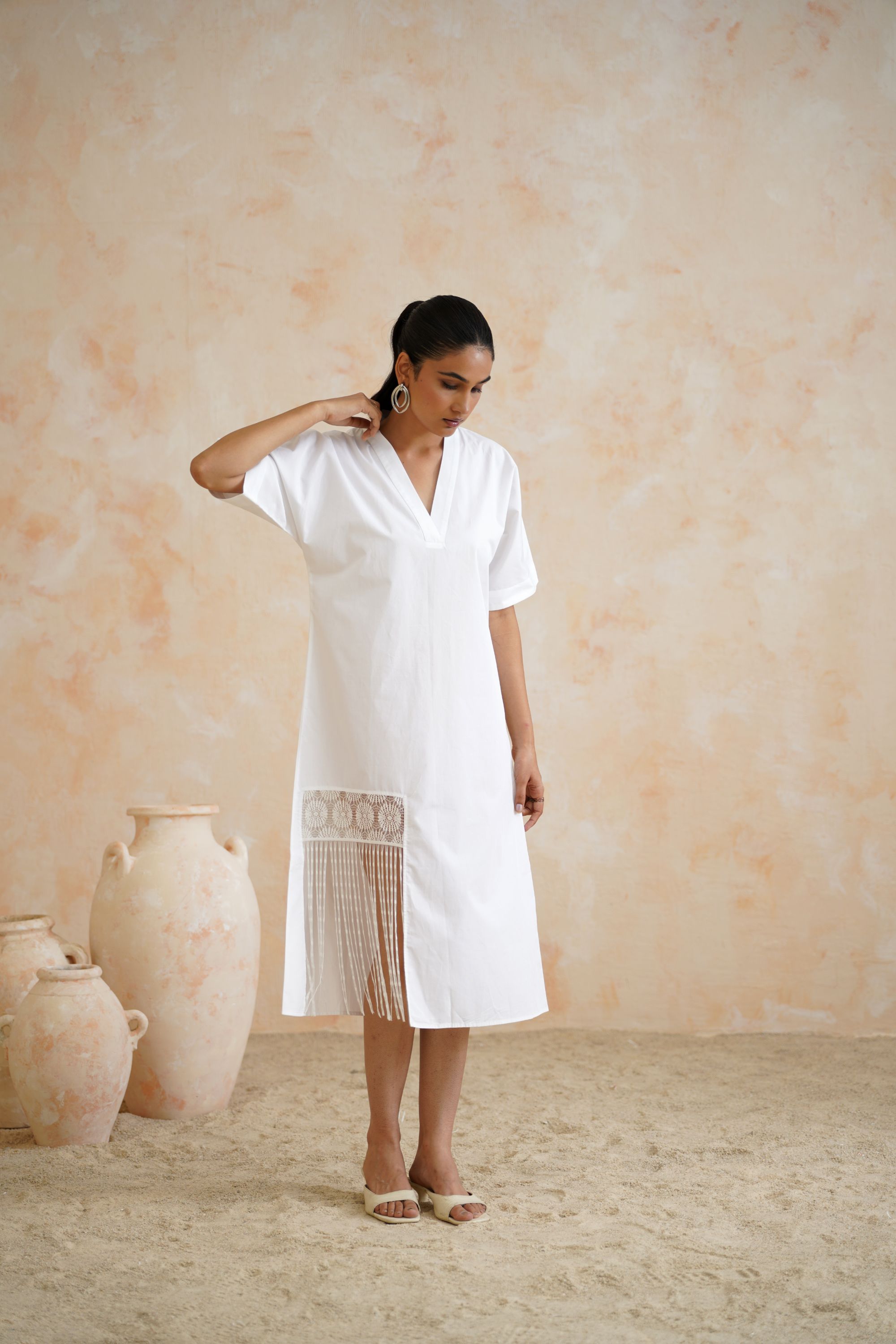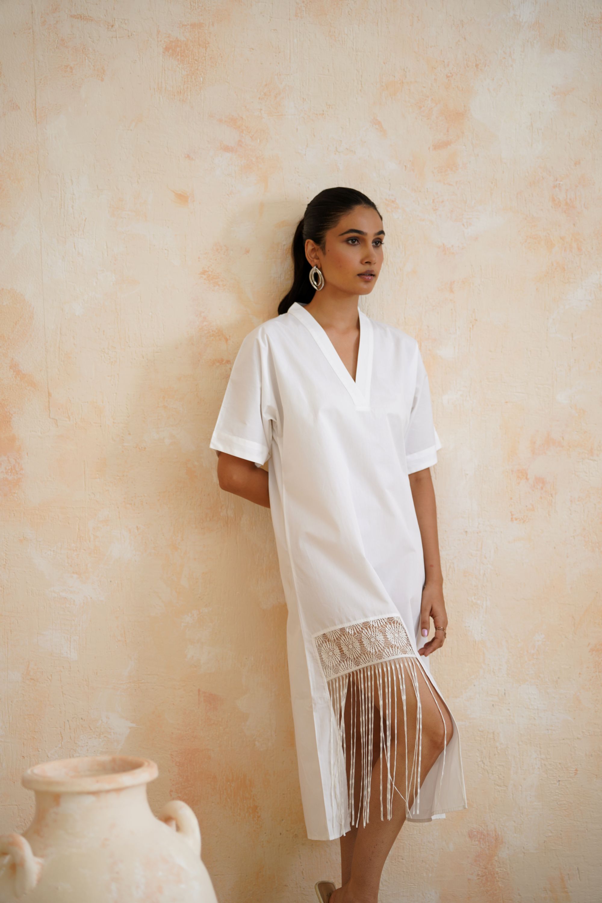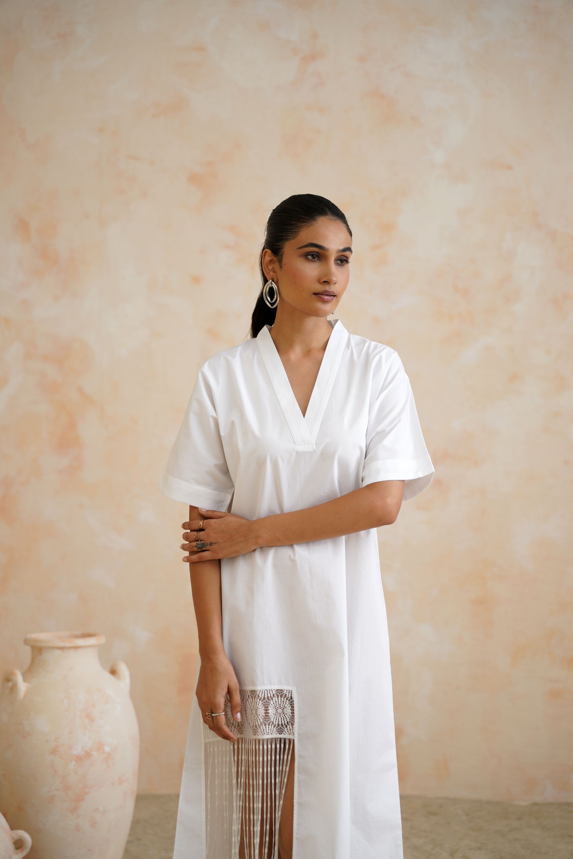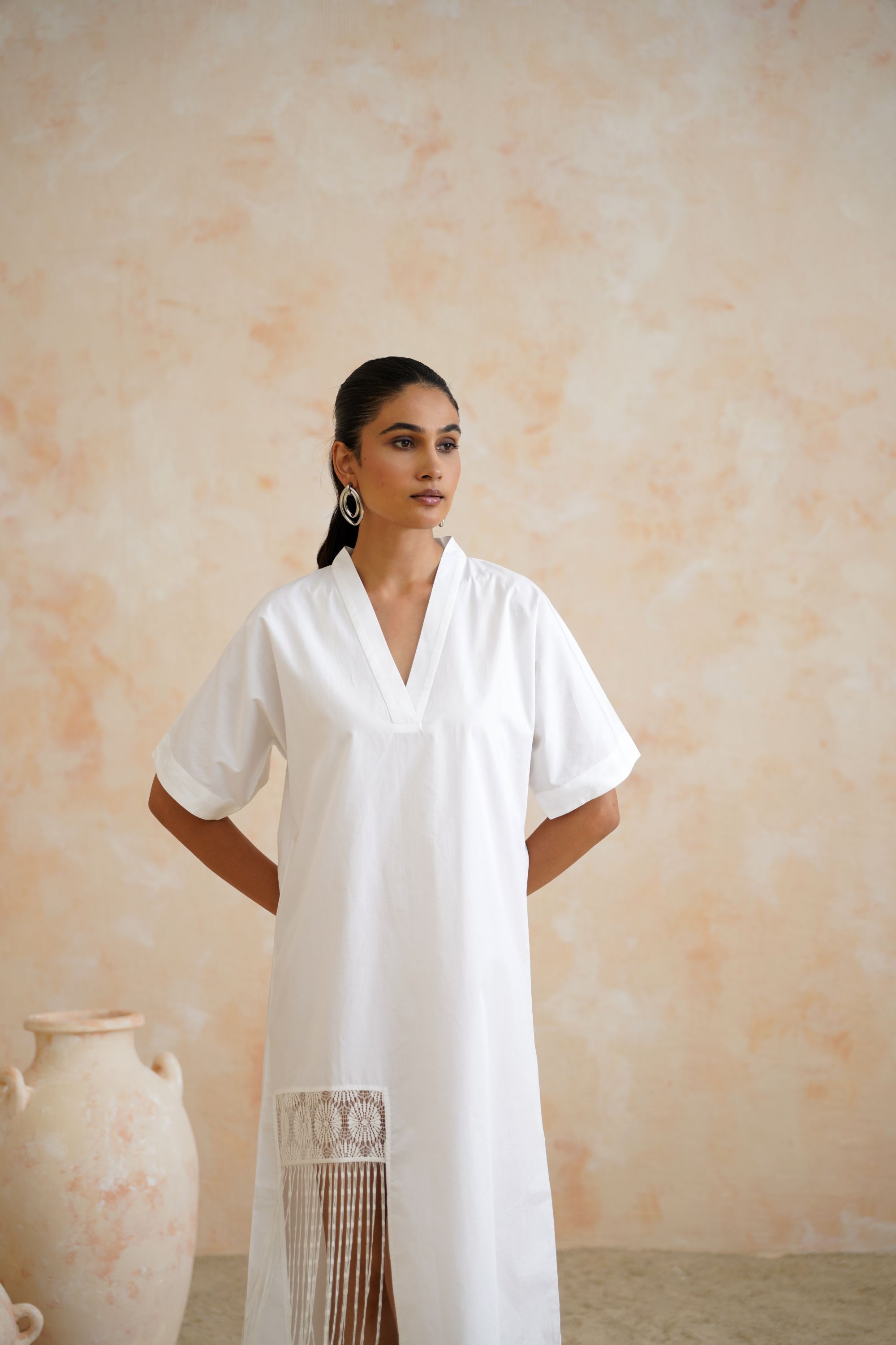 Classic White Cotton Kaftan Dress with Pleated Lace Patch