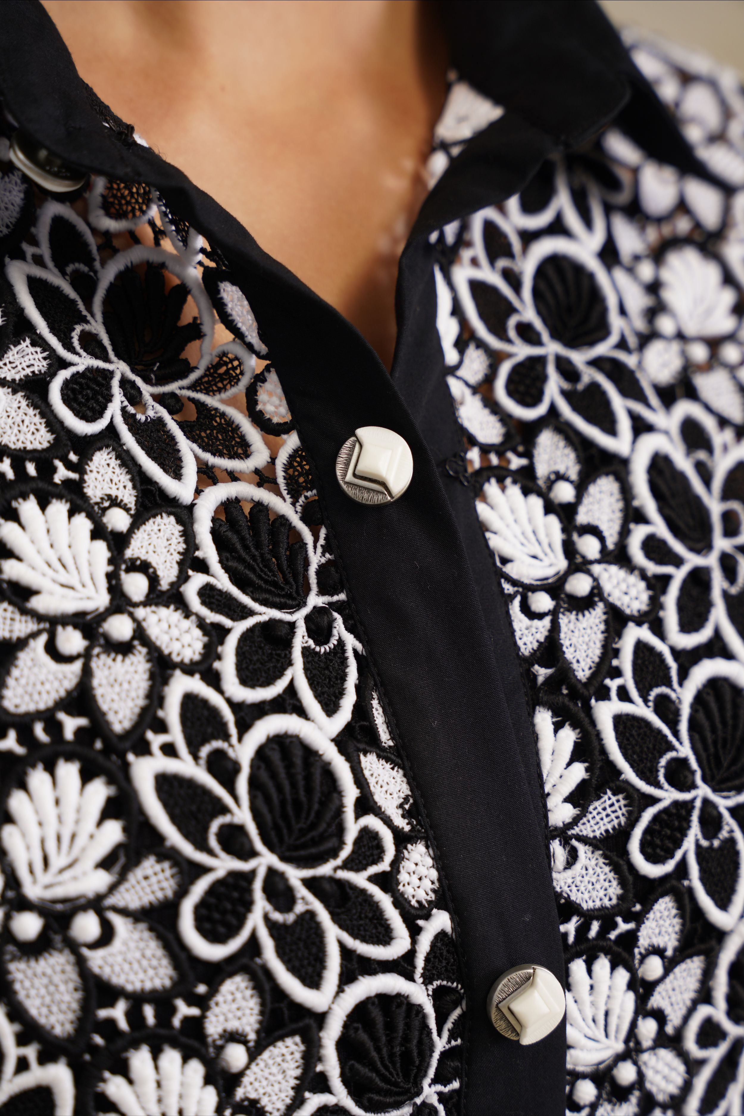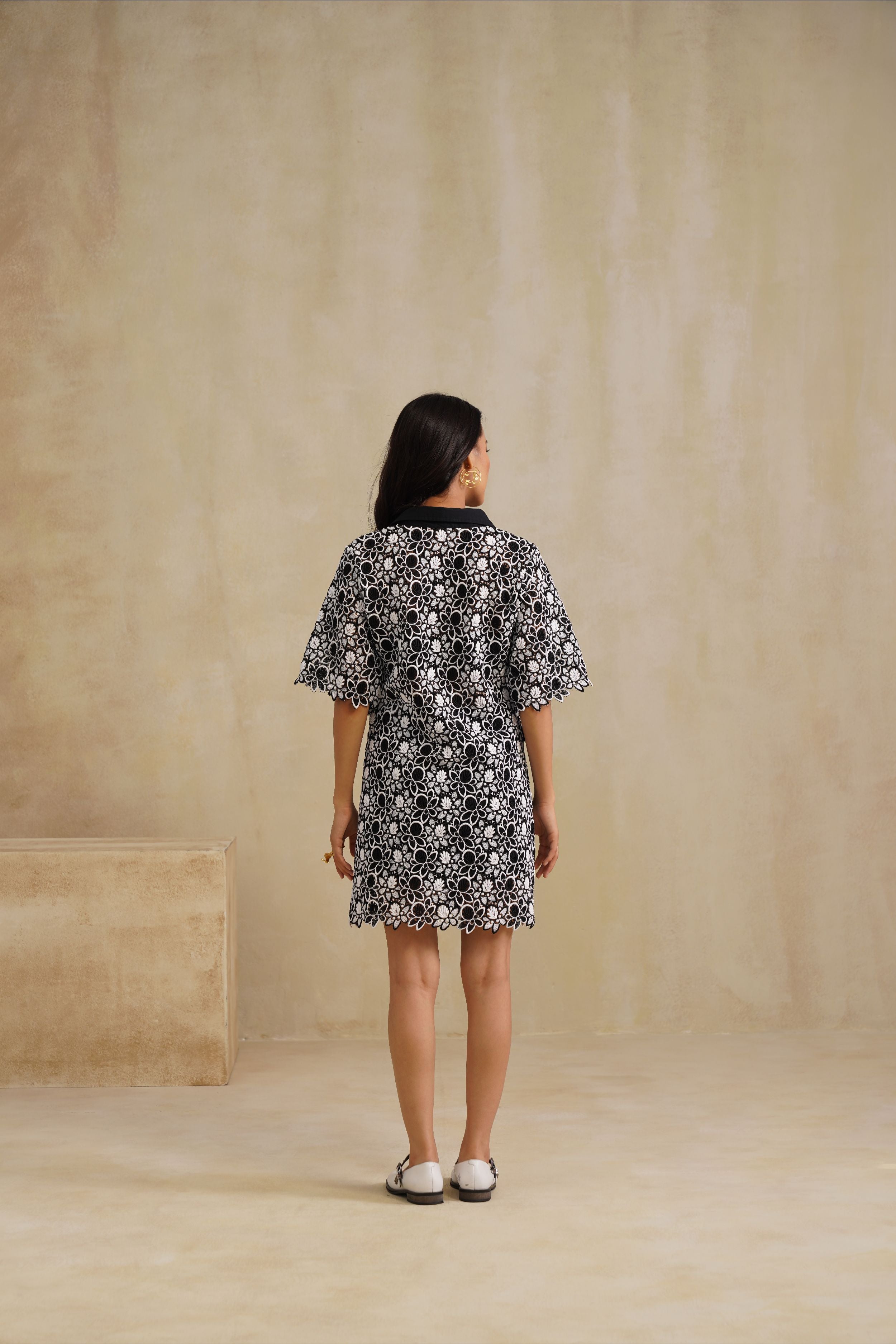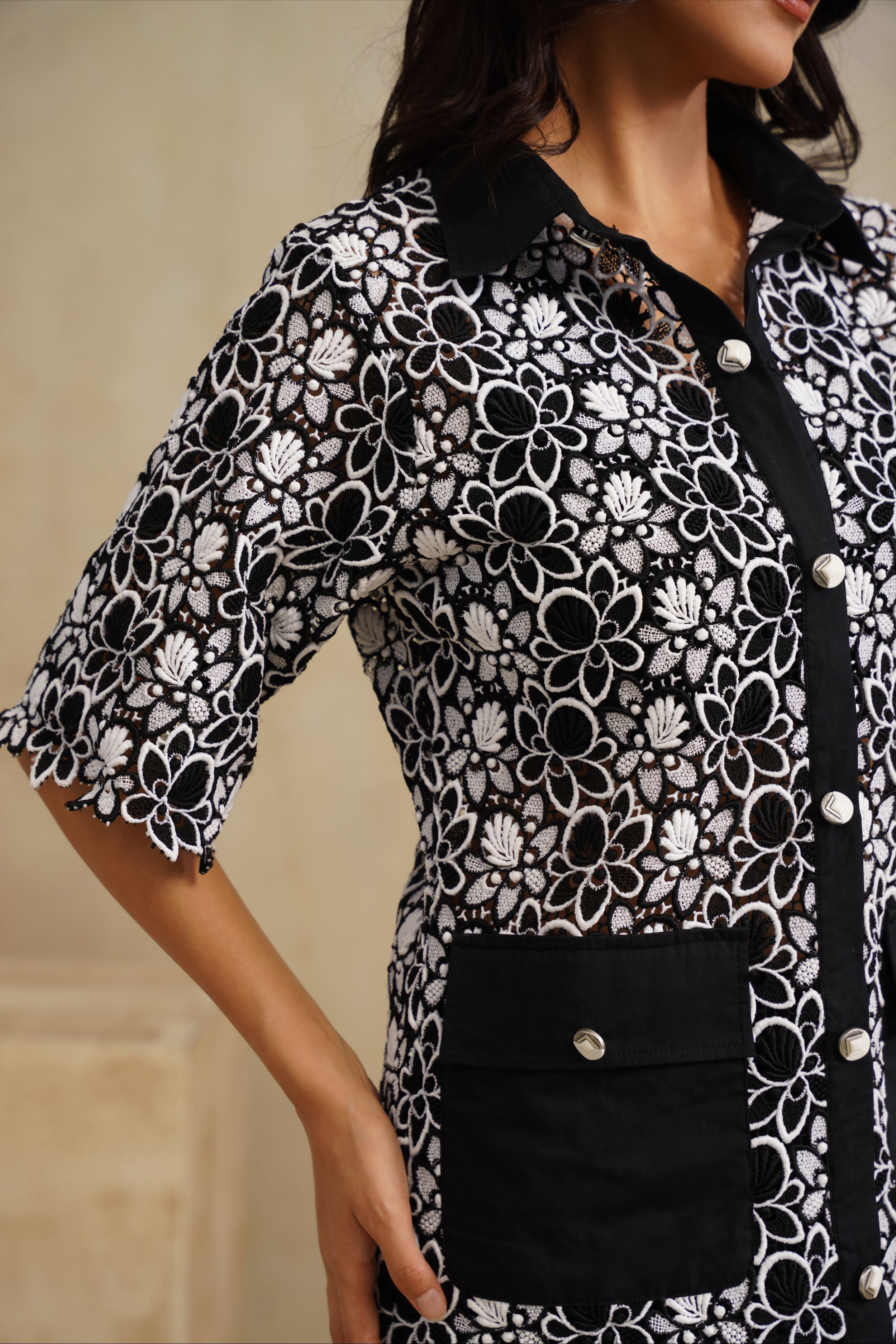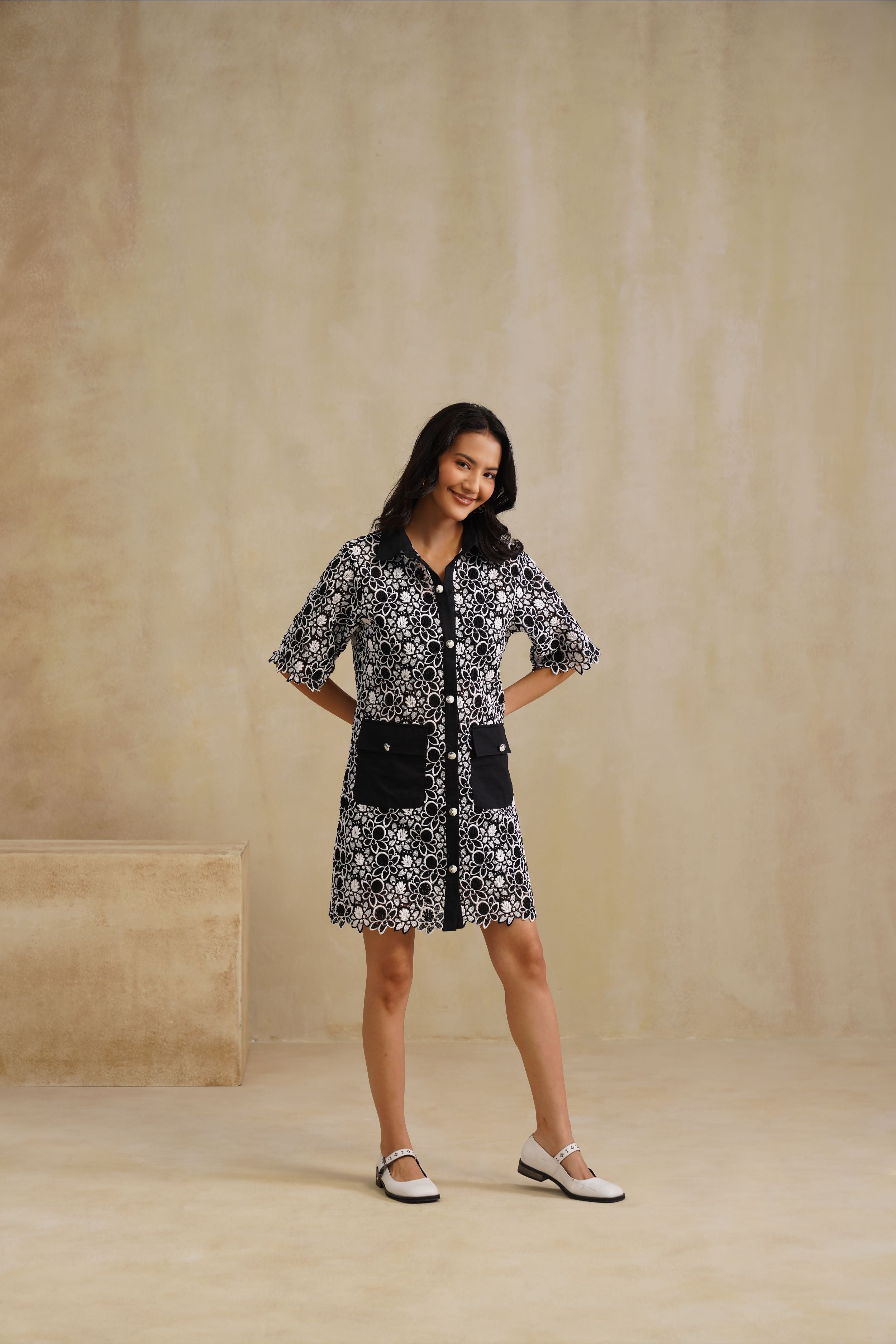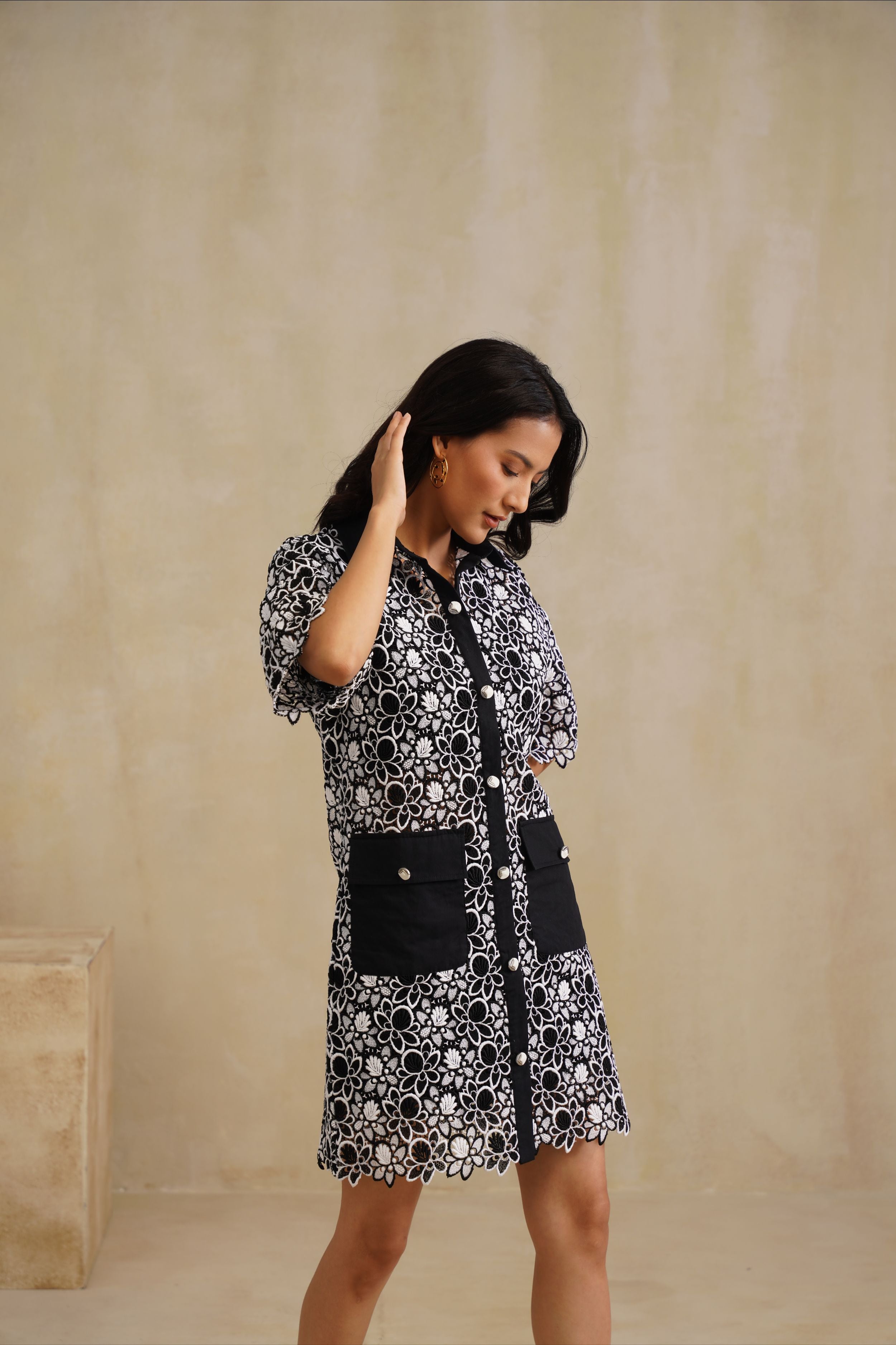 The Daisy Noir Pocket Dress is a chic statement of modern femininity. Crafted in bold black-and-white daisy cutwork embroidery, it features structured half sleeves, contrast patch pockets, and a sleek button-down front. Effortlessly blending playfulness with sophistication, this dress is perfect for making everyday moments feel special.
