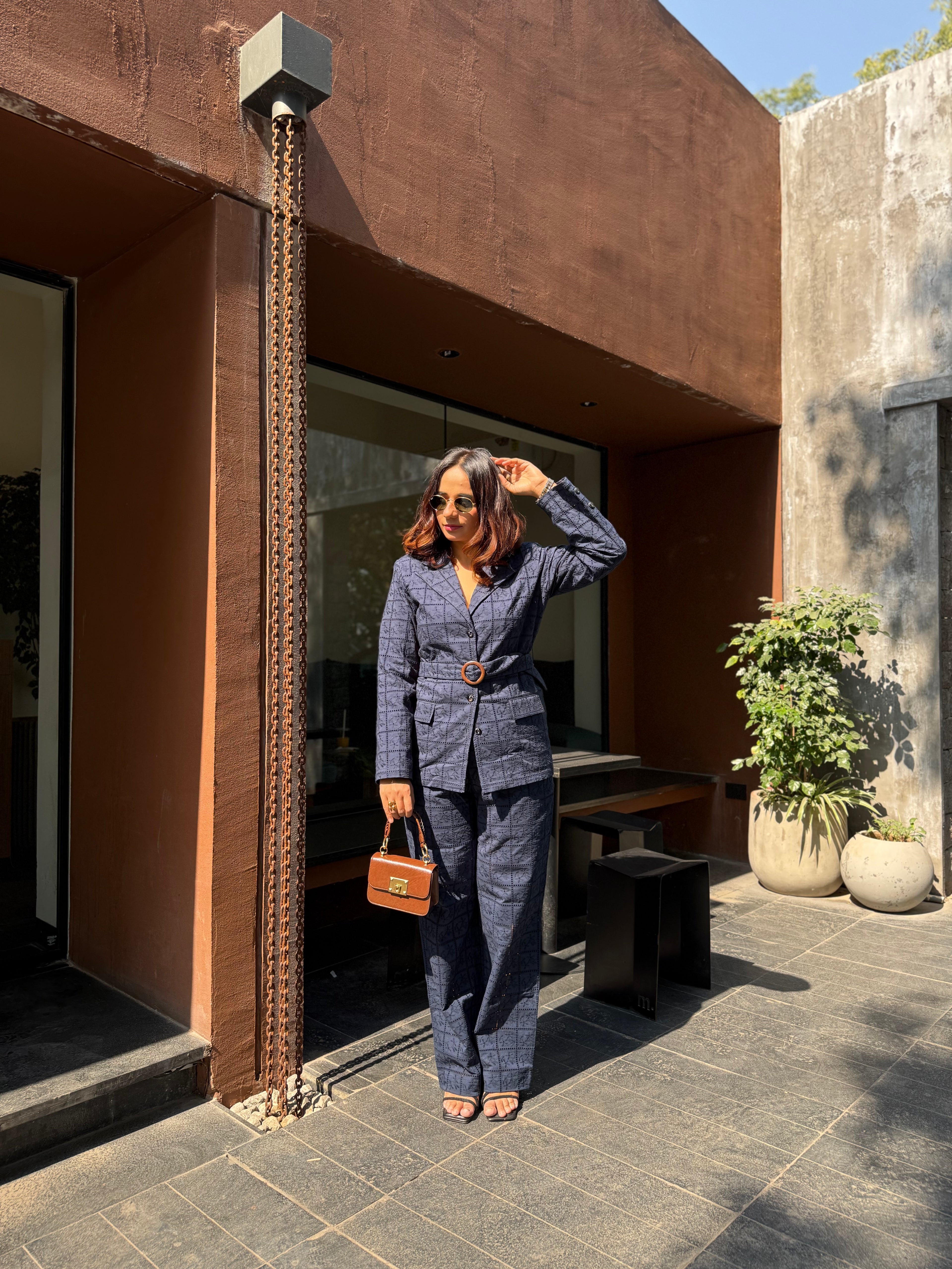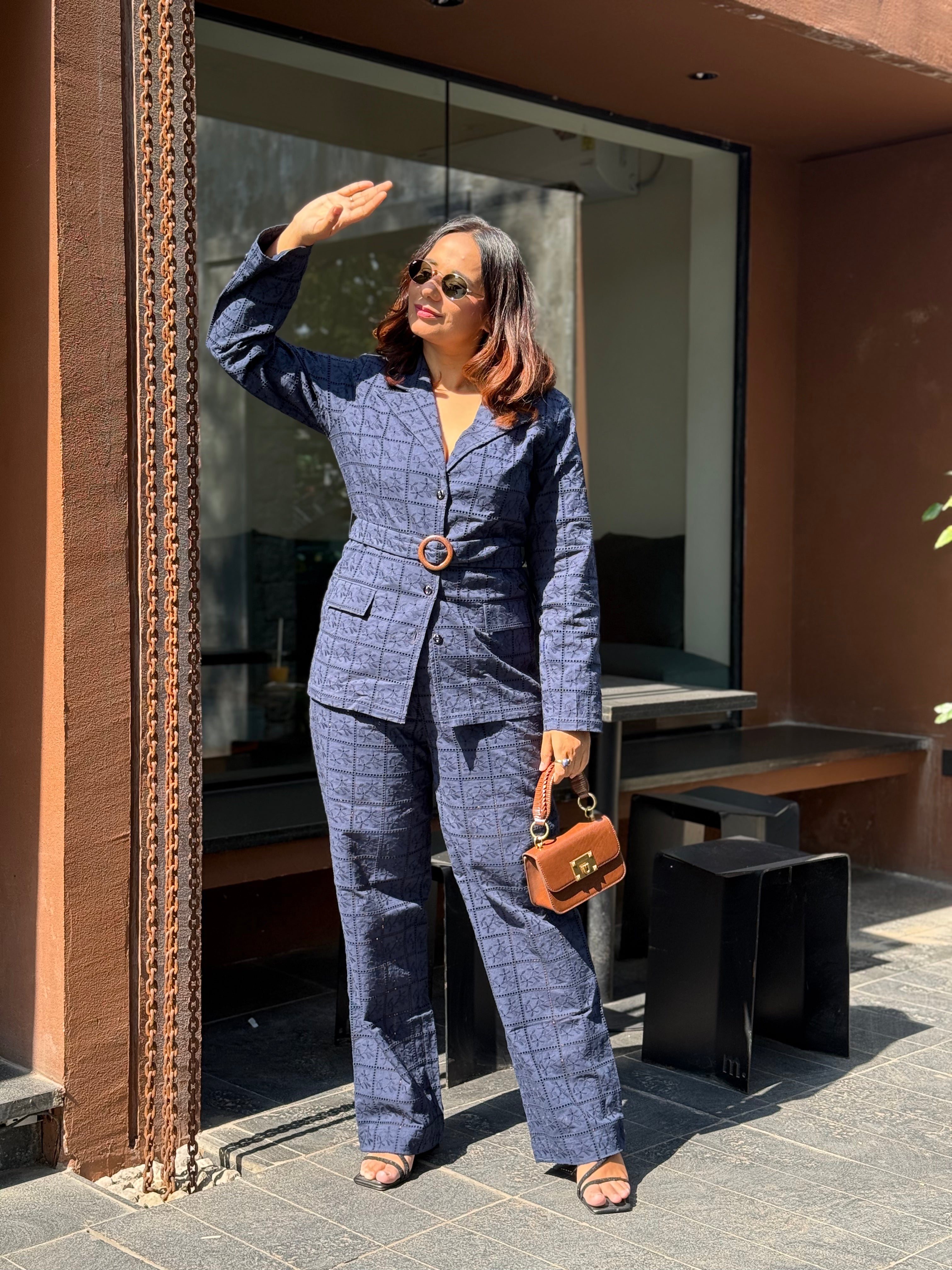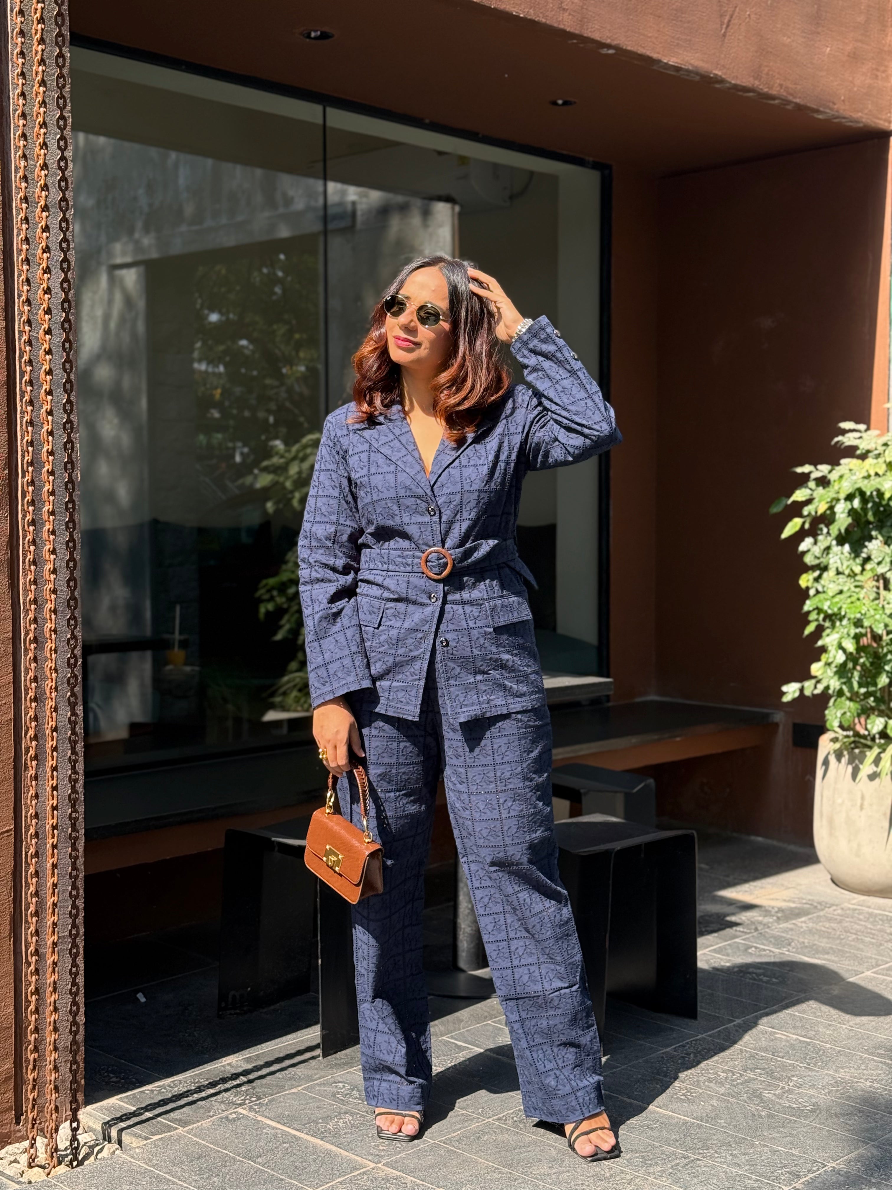 Sophisticated and timeless, this Blue Noir embroidered Set features a tailored checkered blazer with a statement belt and structured wide-leg trousers. Crafted in a rich navy hue—perfect for making a polished impression at work or evening gatherings.