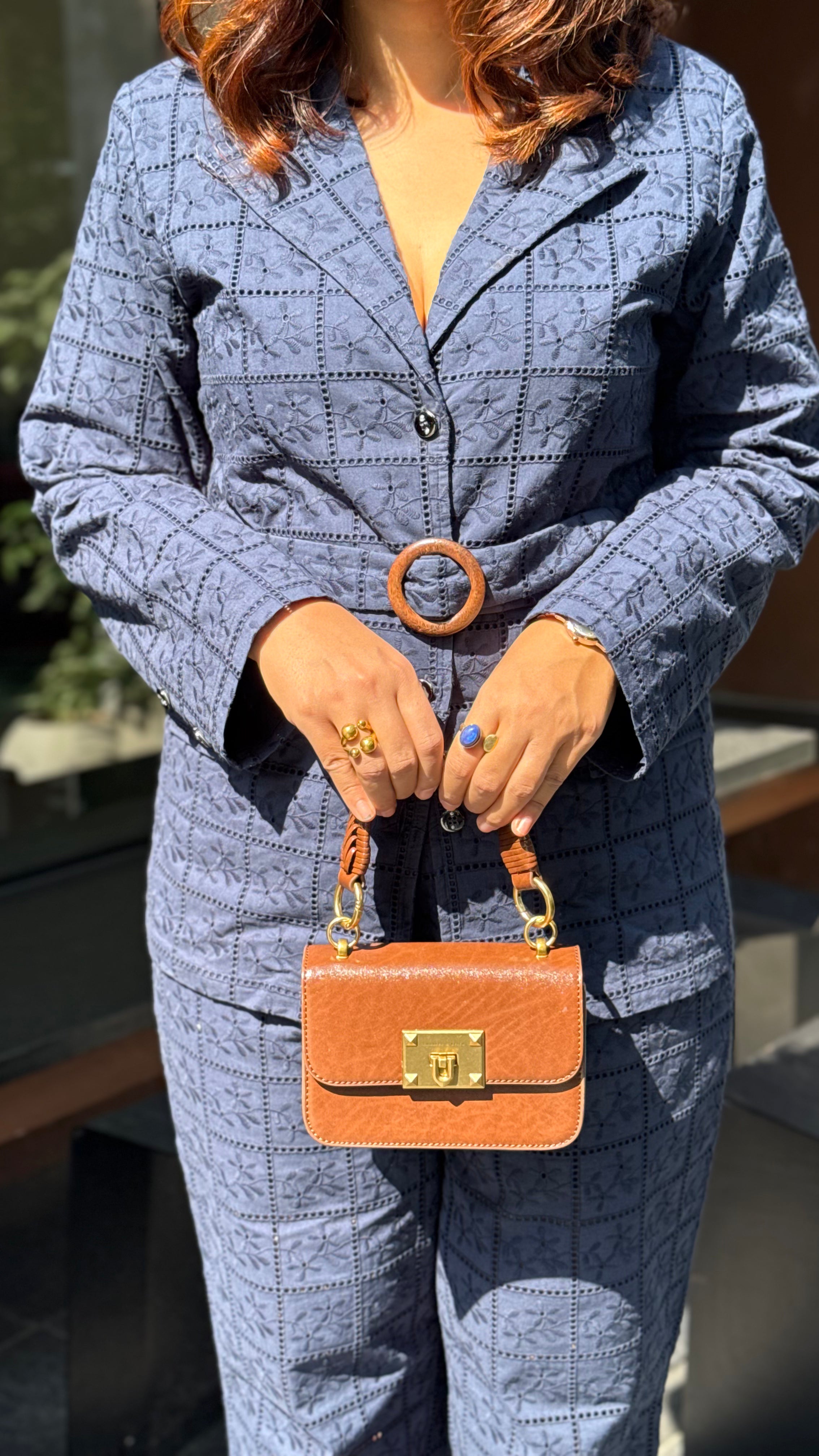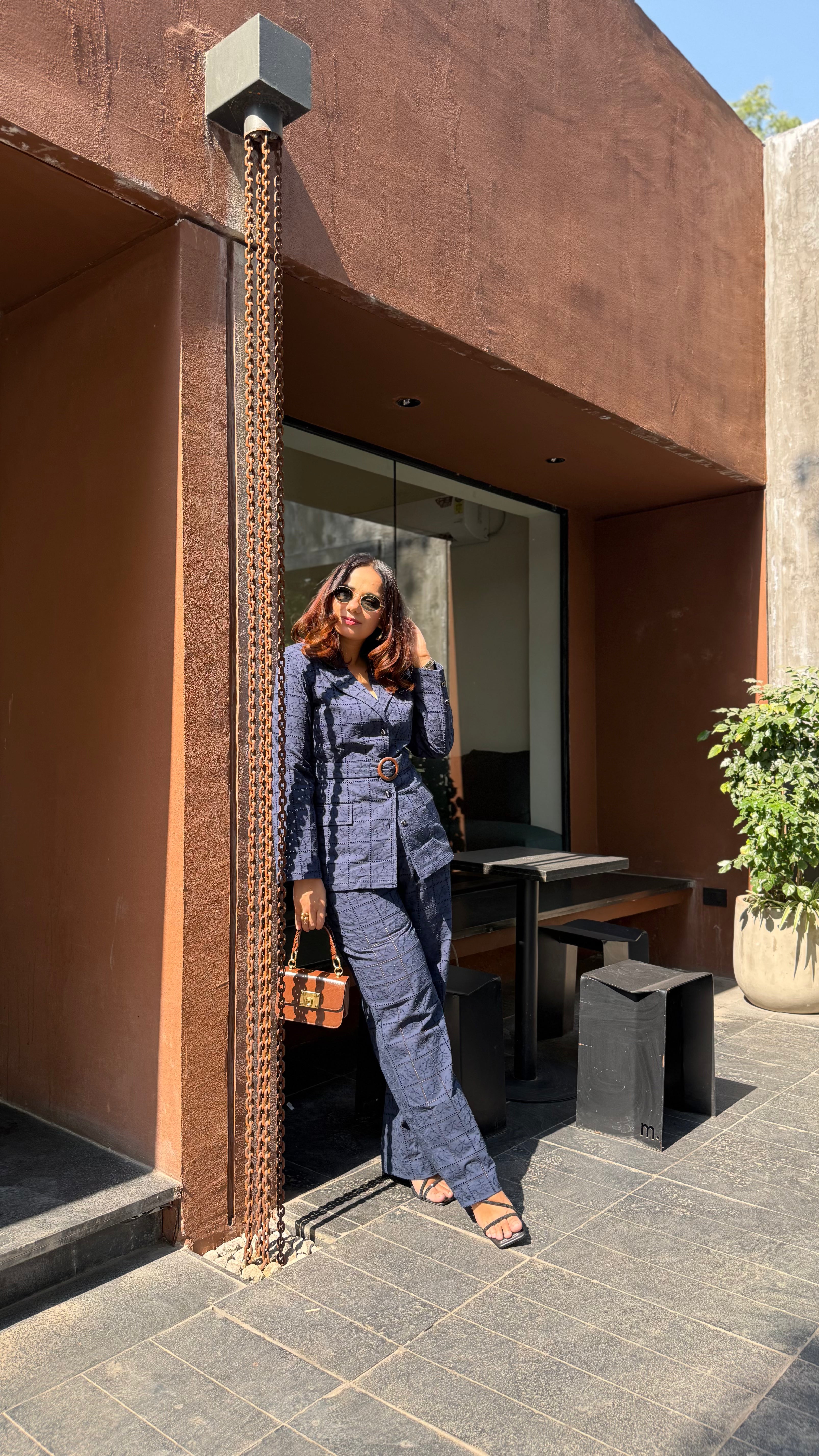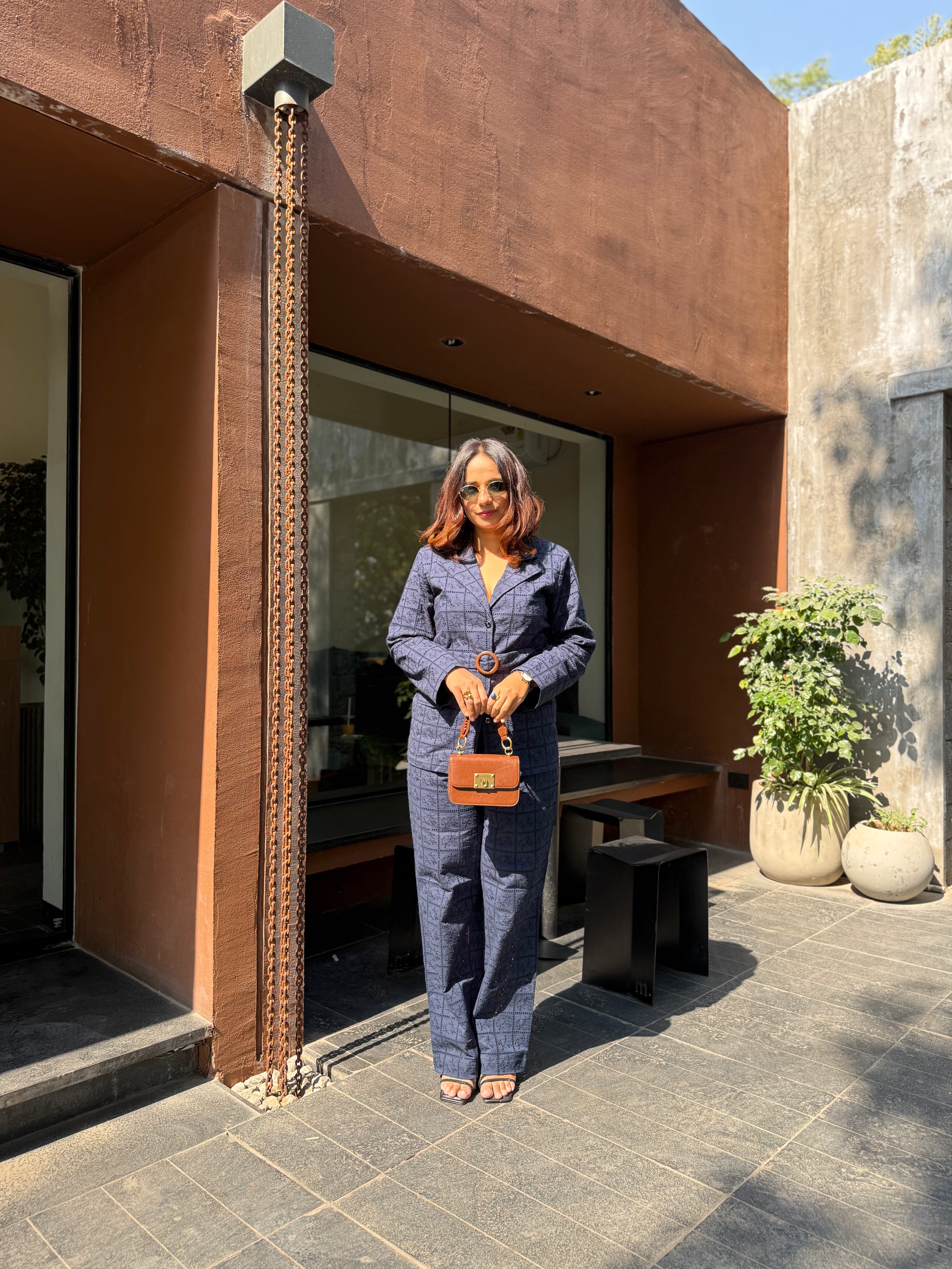 Sophisticated and timeless, this Blue Noir embroidered Set features a tailored checkered blazer with a statement belt and structured wide-leg trousers. Crafted in a rich navy hue—perfect for making a polished impression at work or evening gatherings.