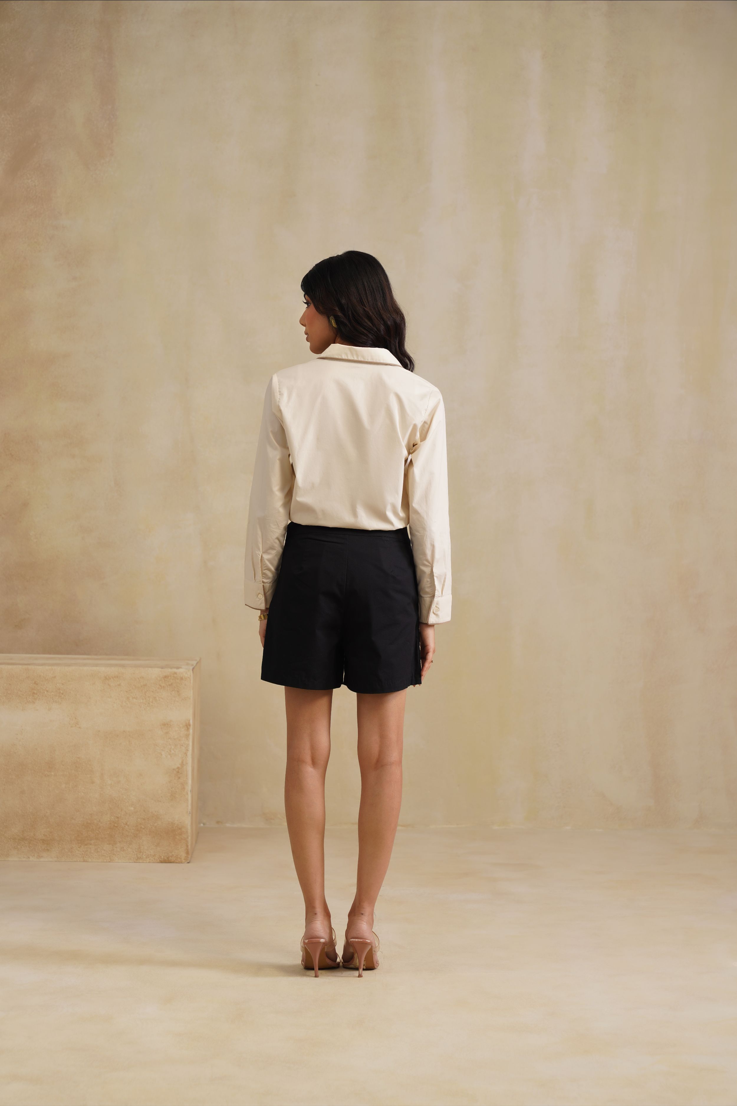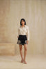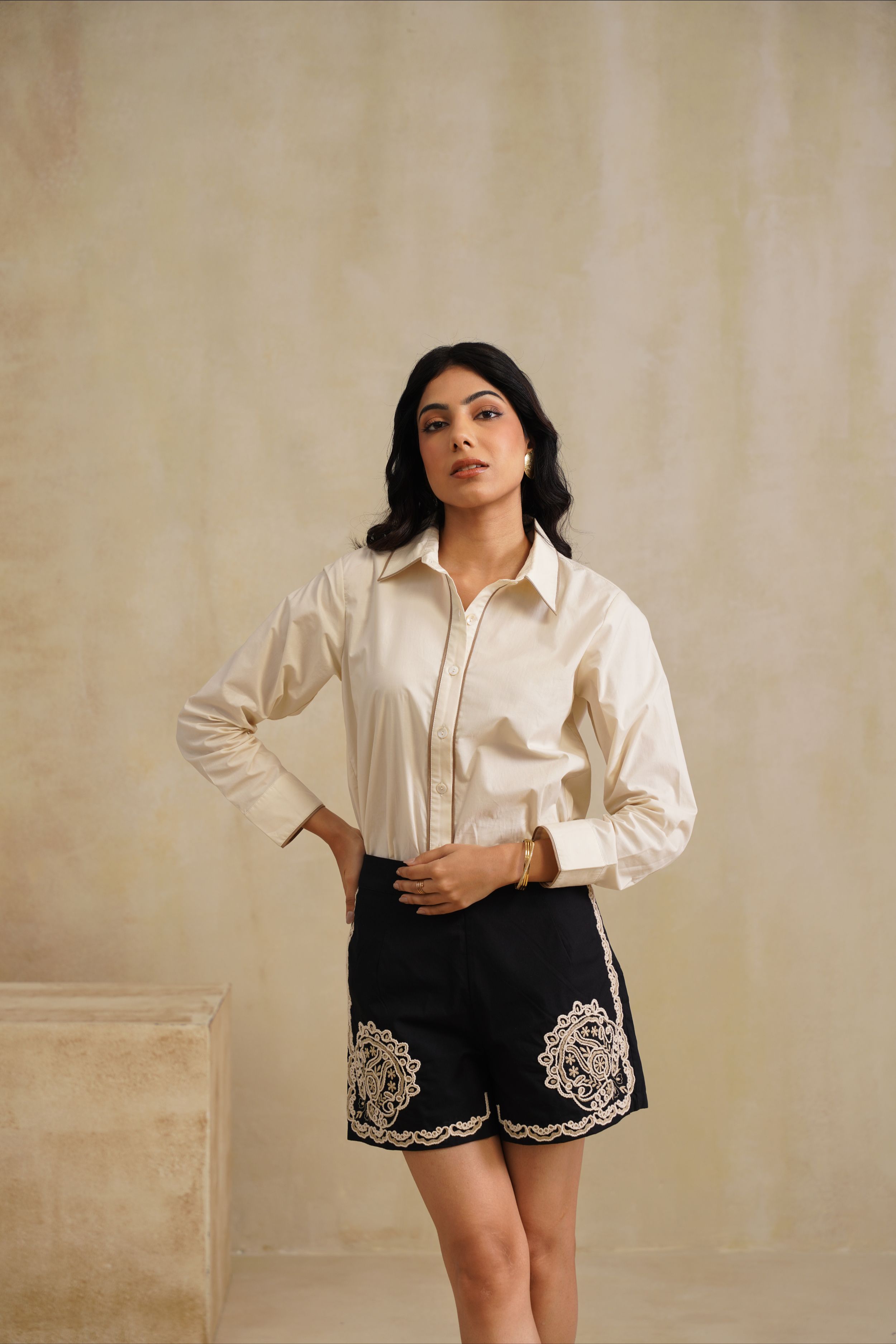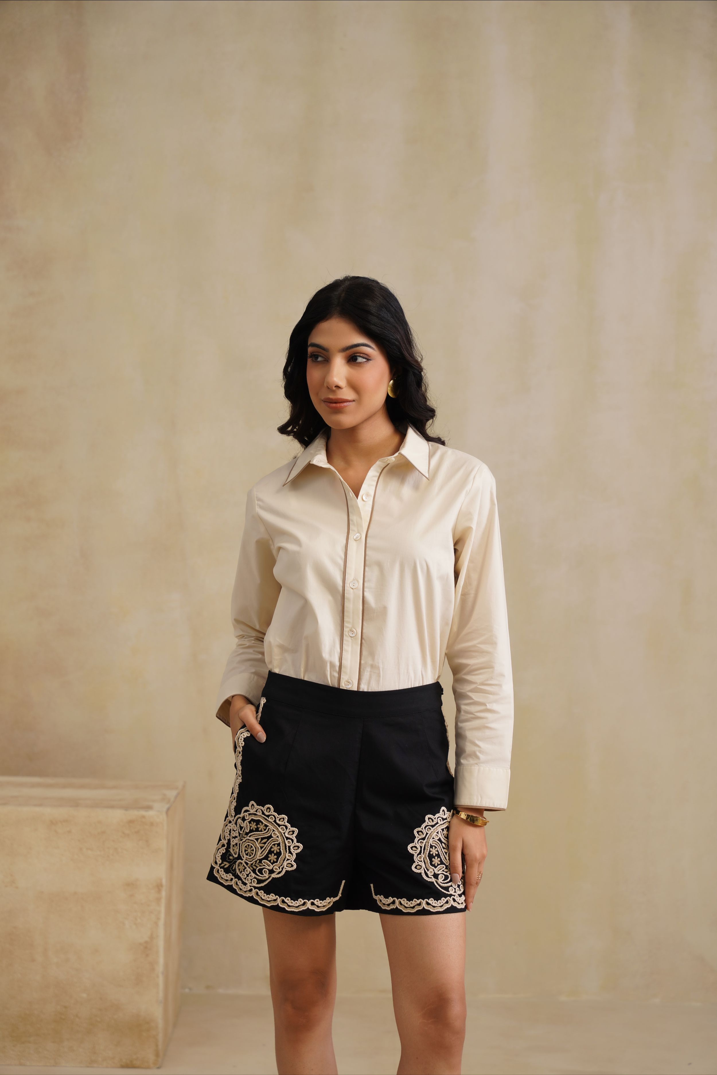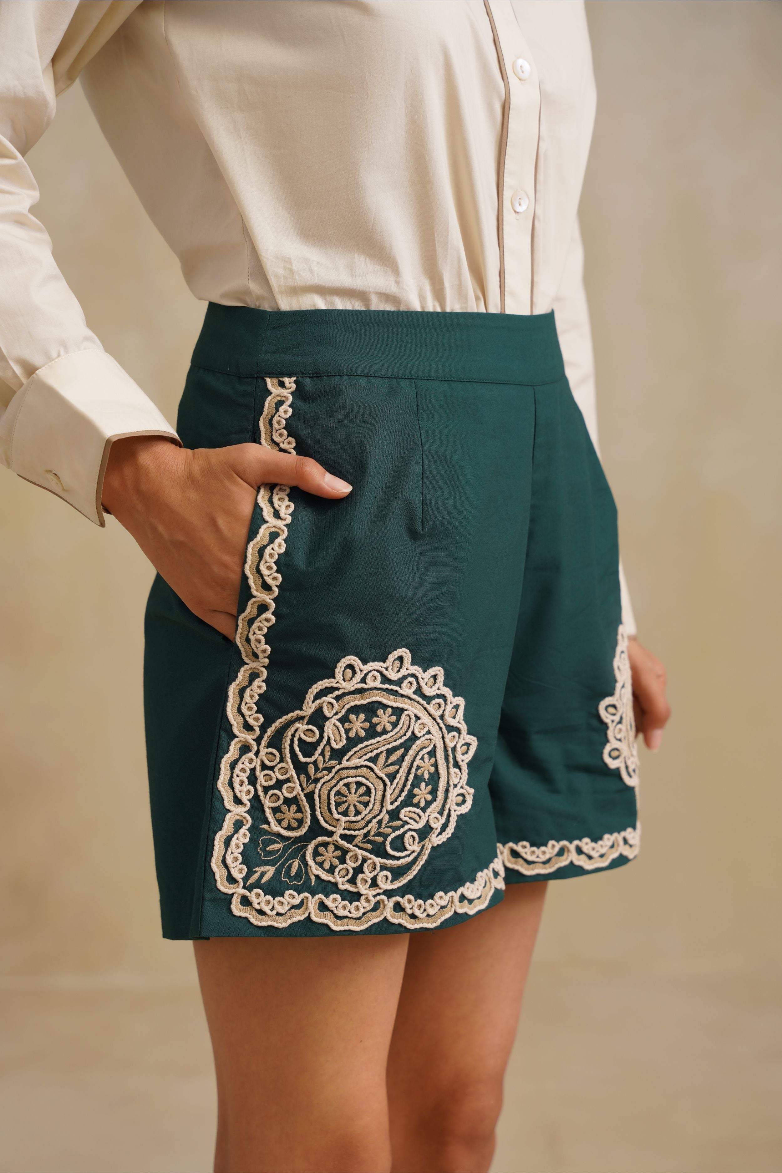 This deep green/ black shorts adds a bold contrast with its intricate embroidery. Adorned with a touch of artistry and charm, it’s the statement piece that elevates the set, making it perfect for effortless day-to-evening refinement.