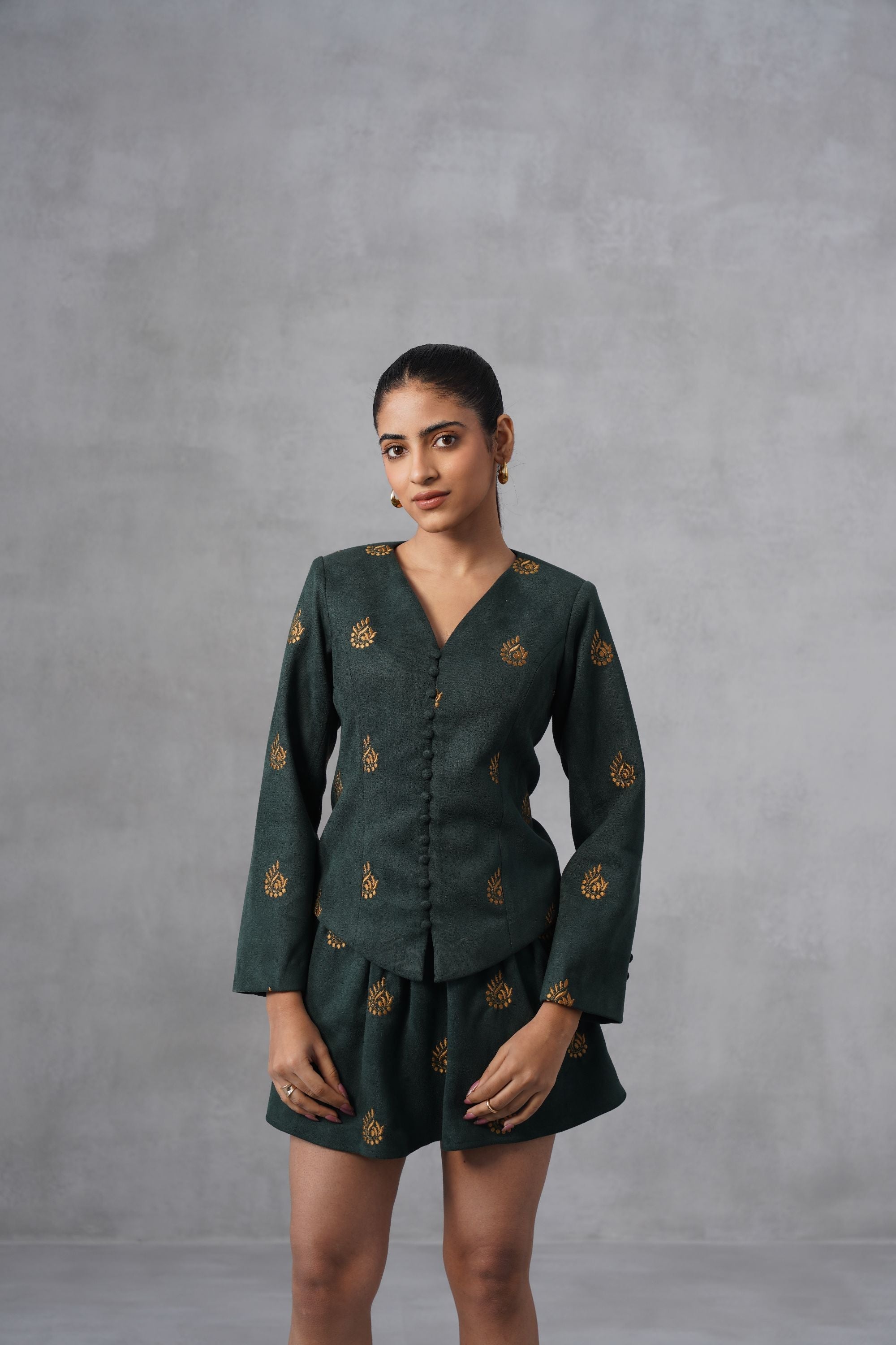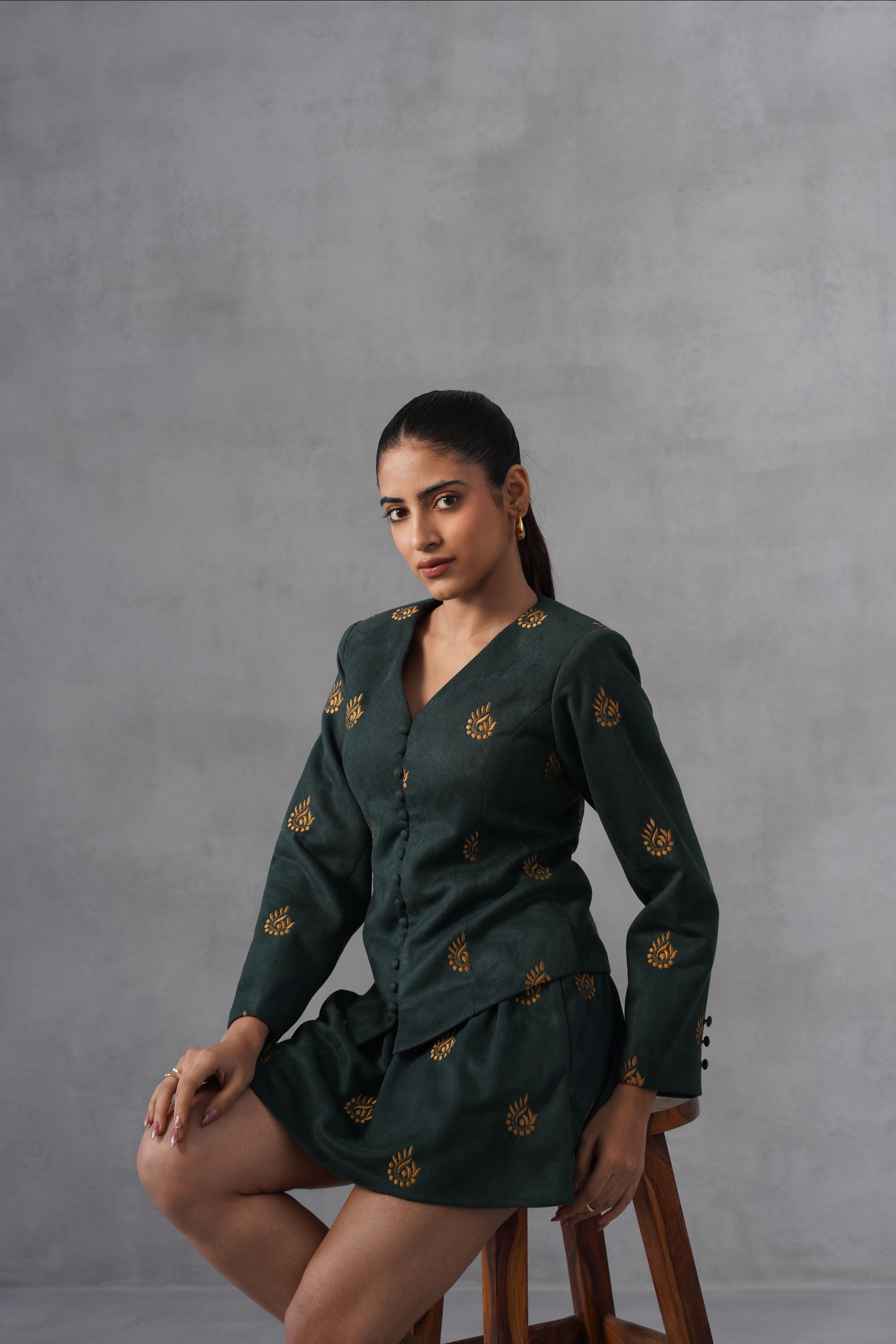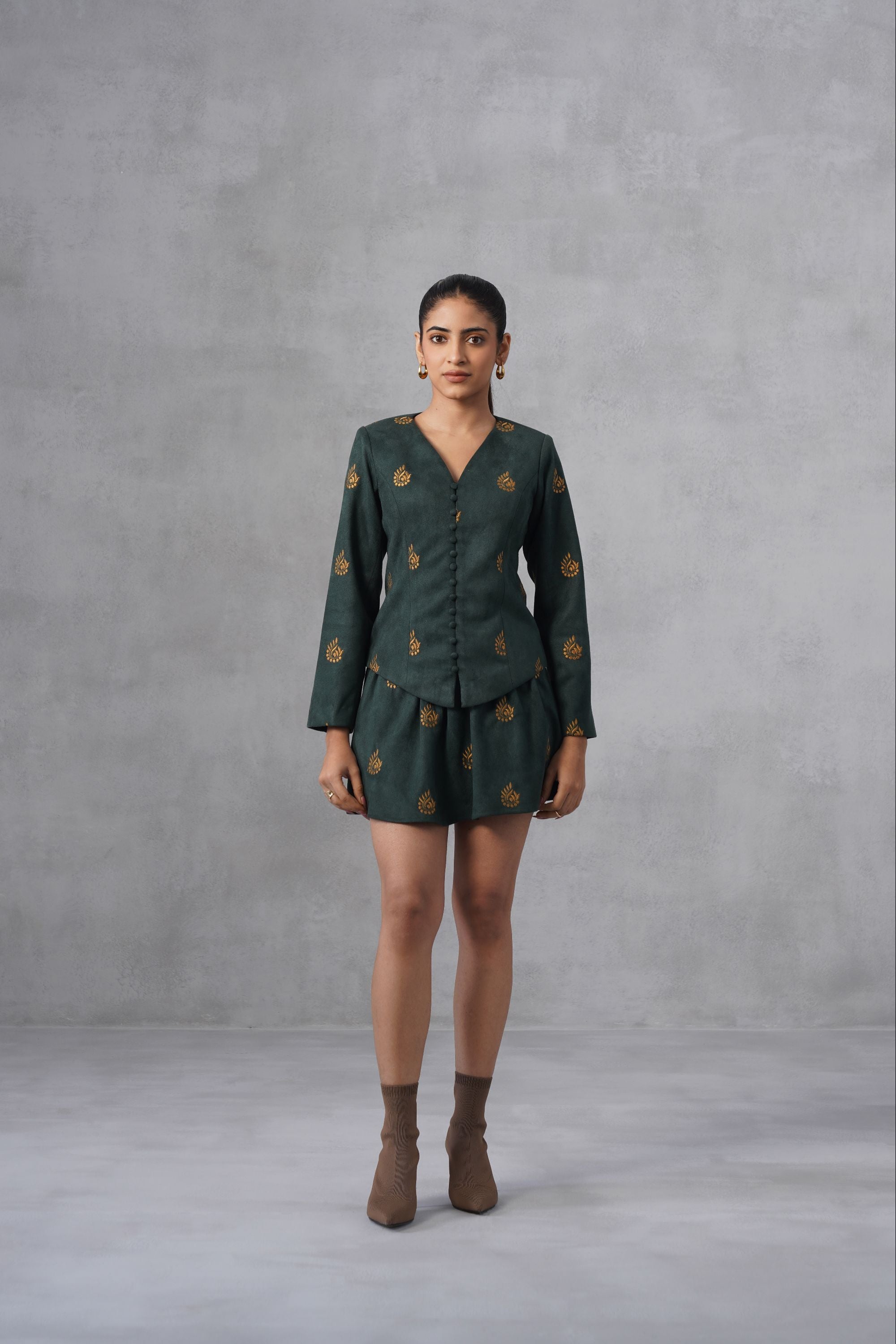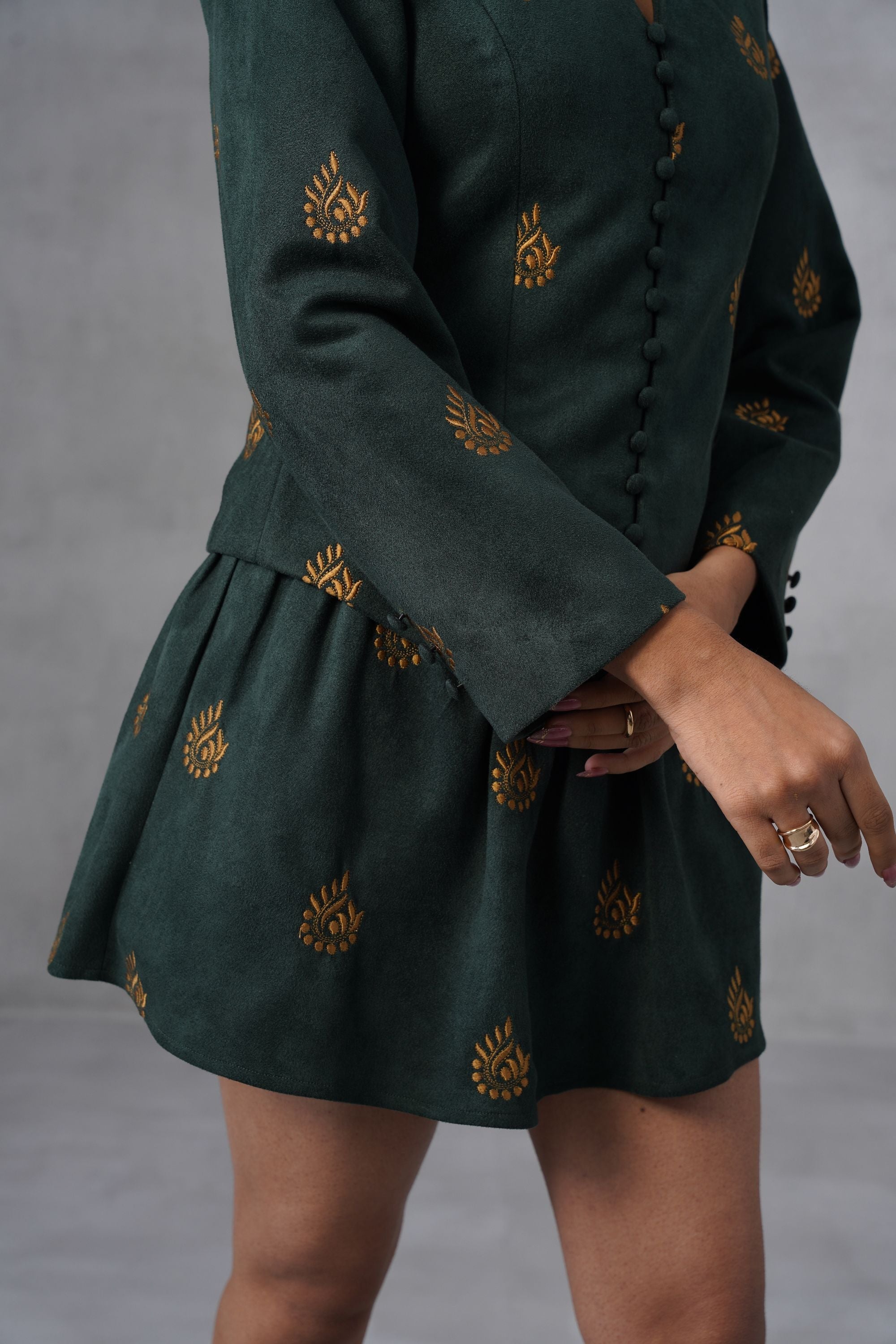 Featuring embroidered playful mini skort, with a regal touch to your everyday (or evening) wear. This slightly flared skort is adorned with intricate, scattered gold embroidery in a traditional stylized motif.