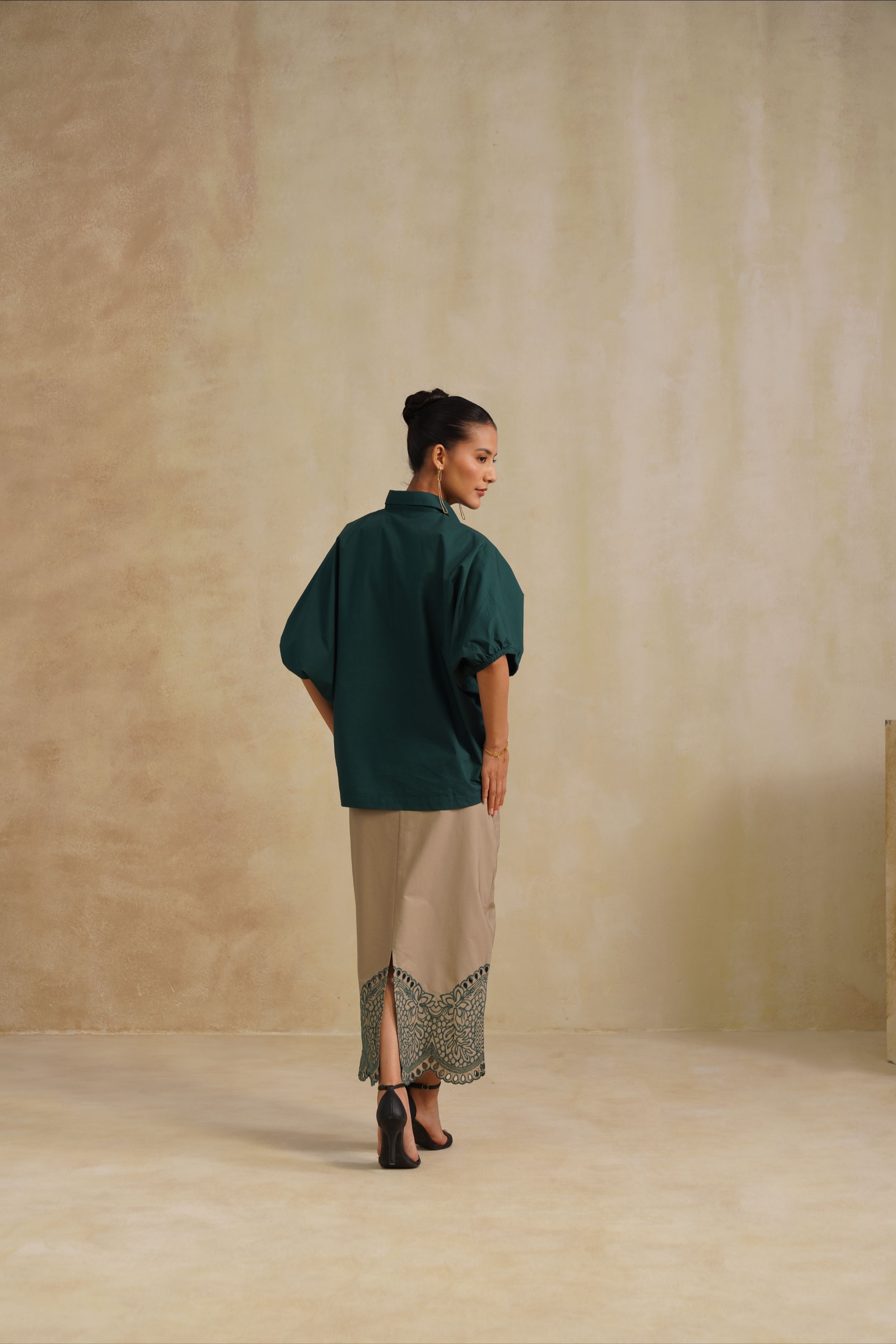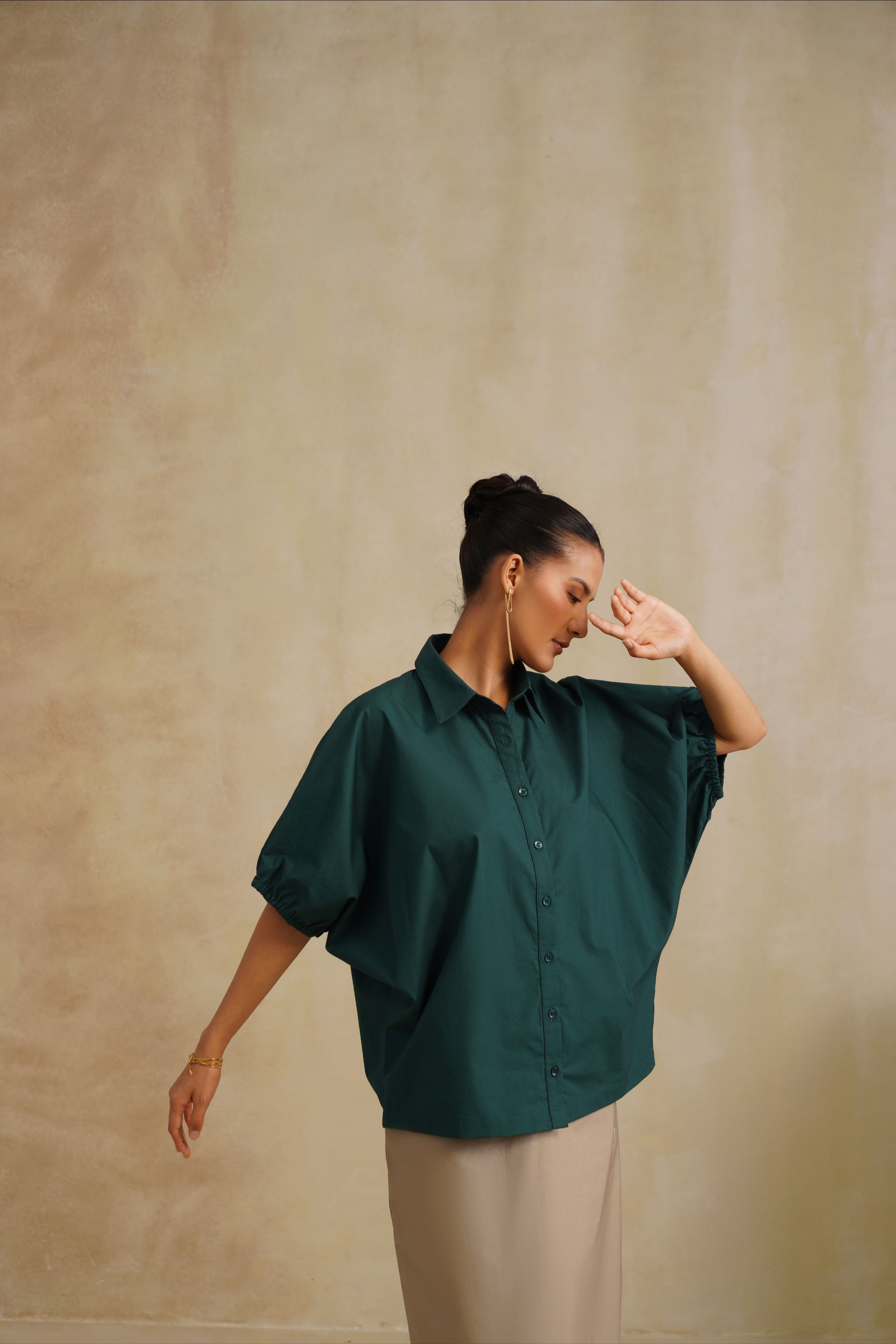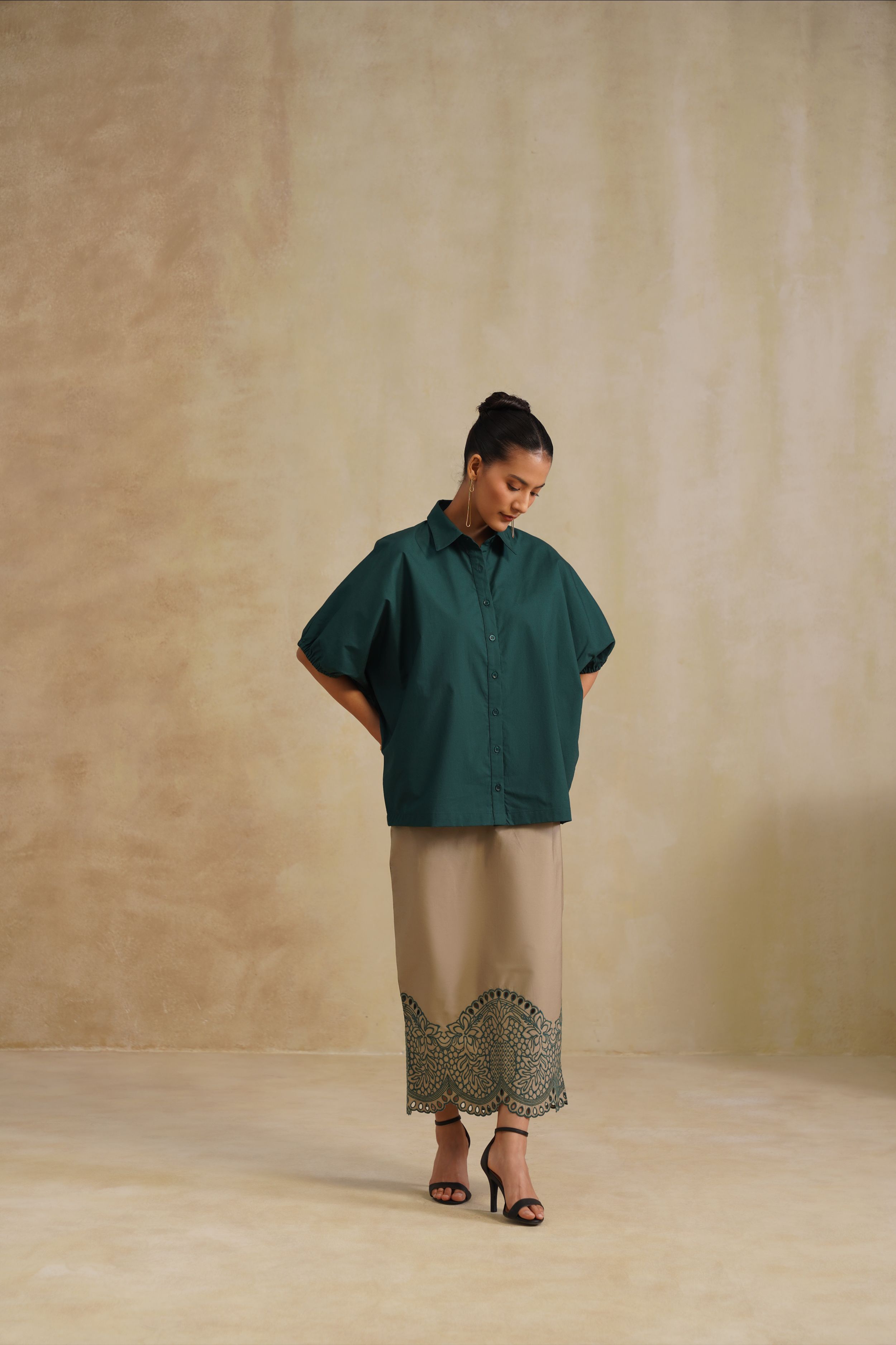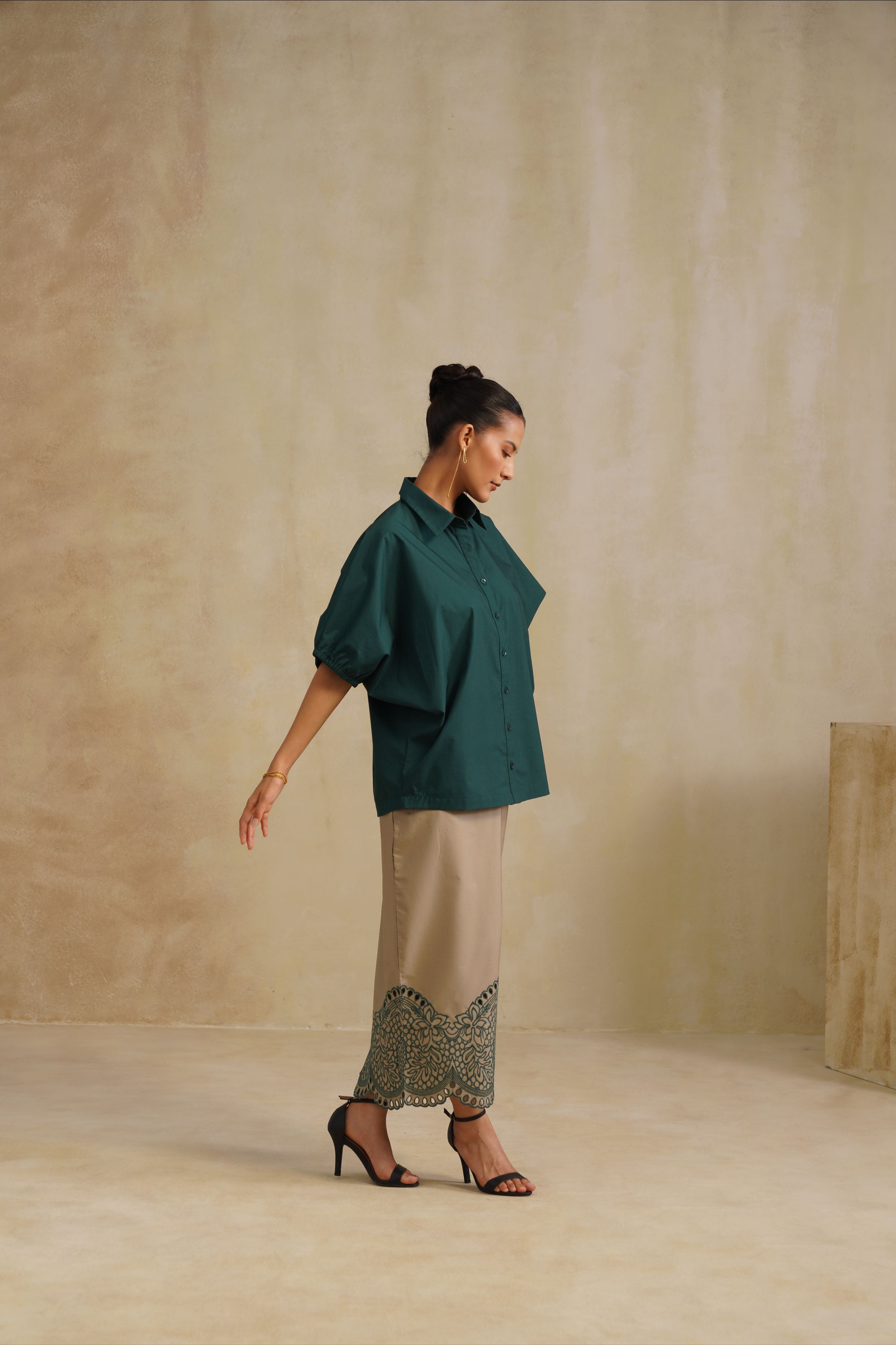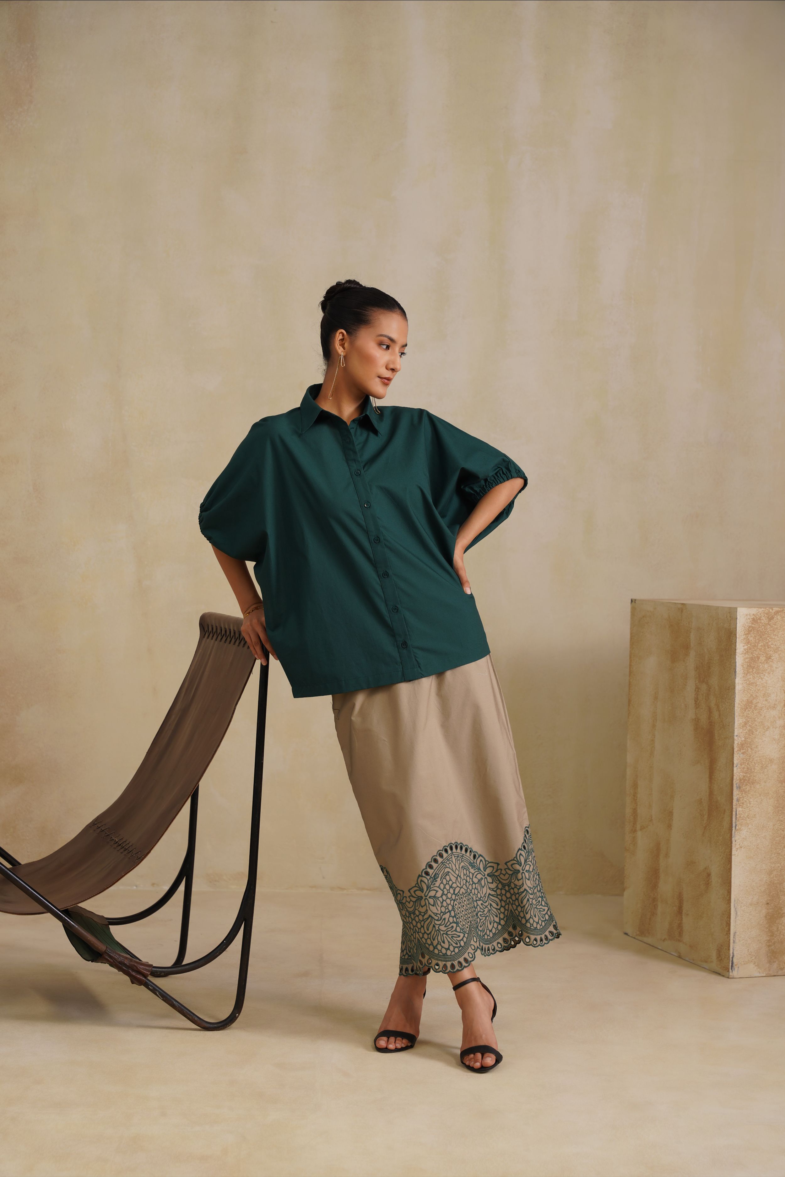 This shirt is a harmony of elegance and fluidity. The Emerald Dusk Shirt blends relaxed sophistication with timeless artistry. It features a deep emerald button-down shirt. Effortlessly chic, it’s perfect for evening gatherings or refined daywear with a touch of modern grace.