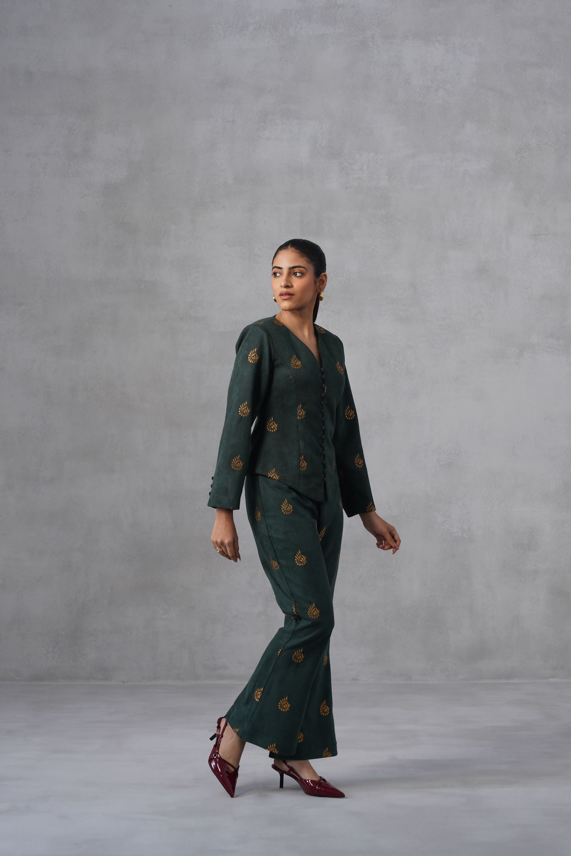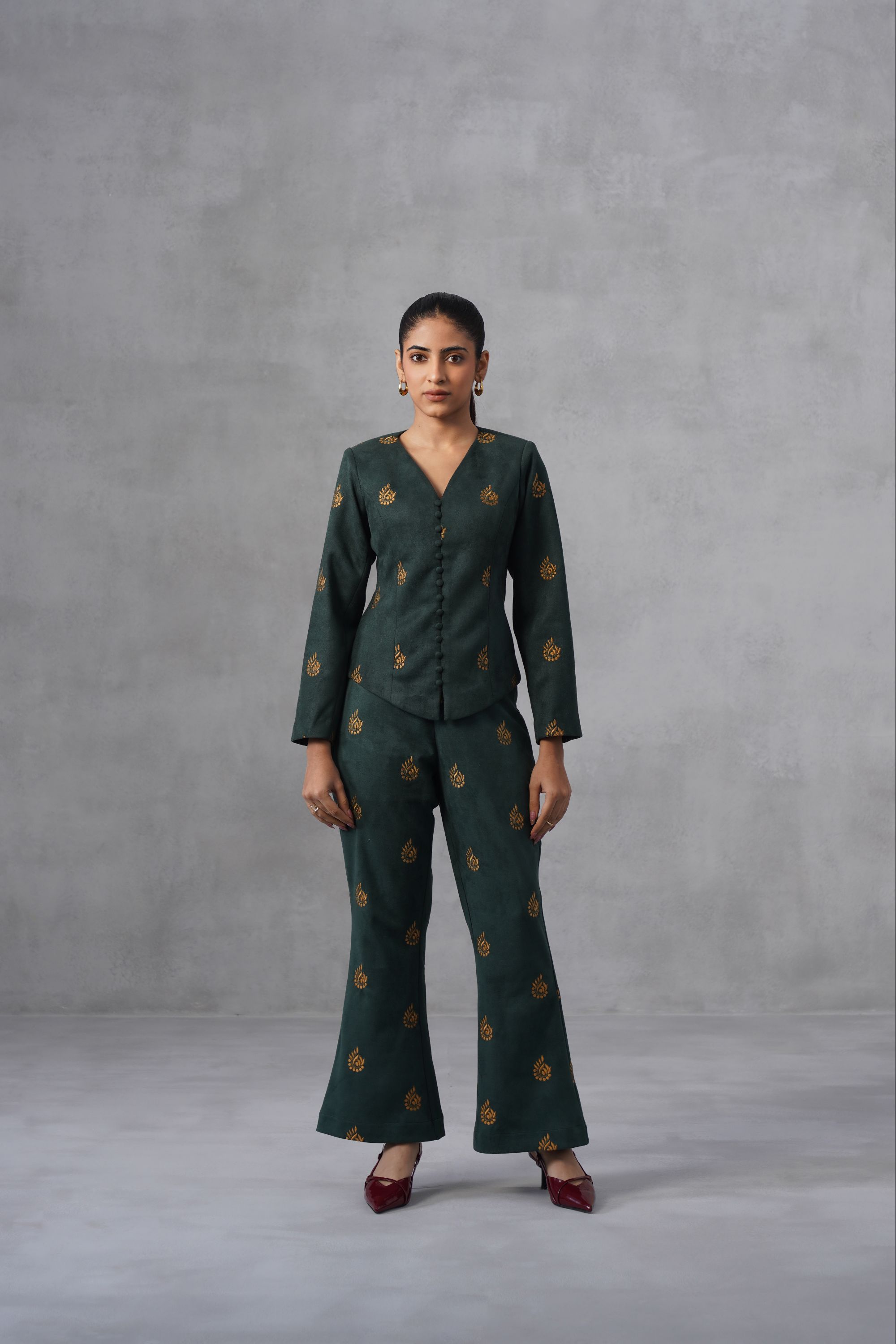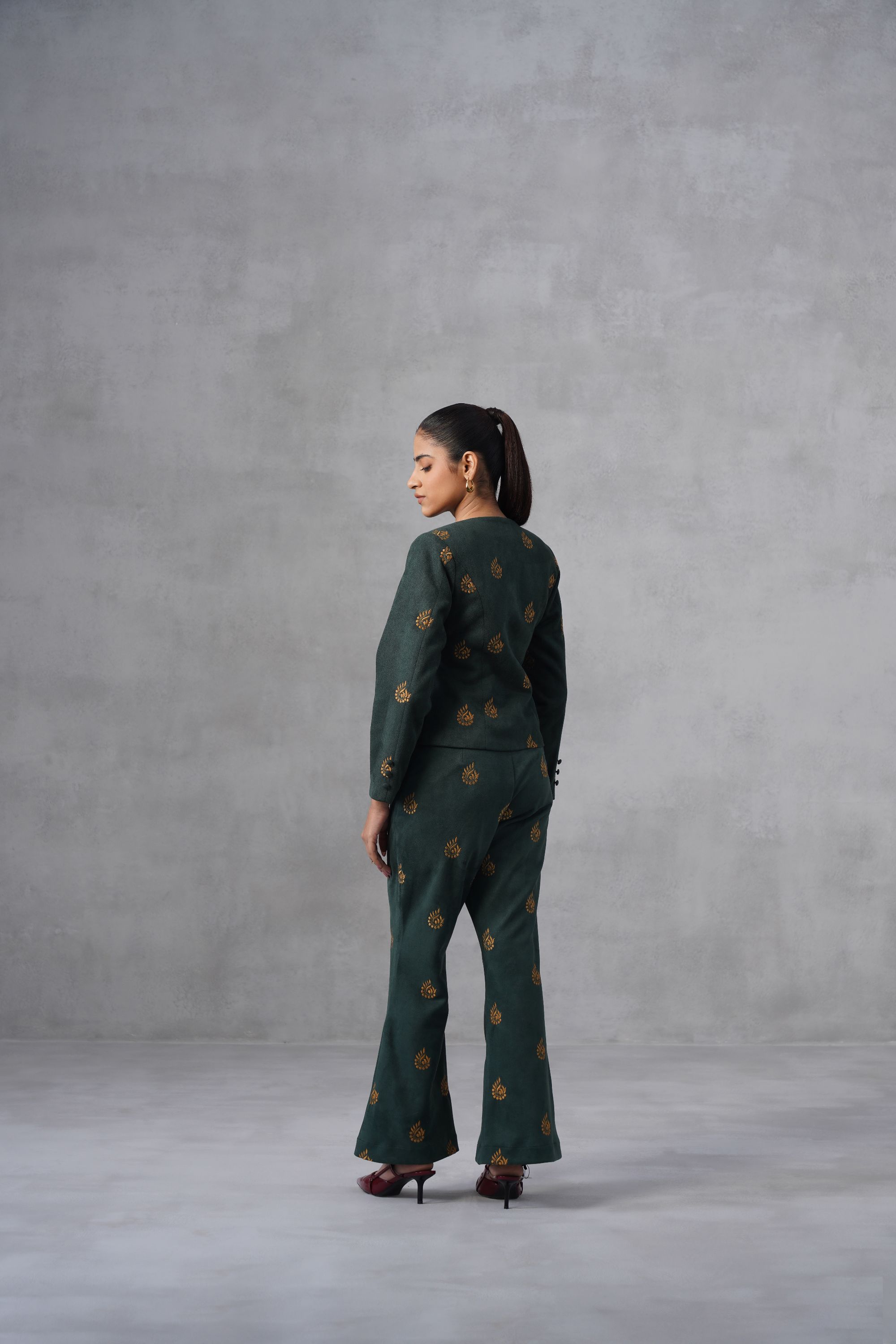 Both pieces are adorned with intricate, scattered gold embroidery in a traditional stylized motif. The deep jewel tone and intricate gold work gives the garment an opulent, festive, or high-fashion appeal, suitable for upscale events, parties, or formal gatherings. Blazer: The jacket is long-sleeved with a V-neckline and features a subtle, peplum-like, fitted structure around the waist. Pants: A pair of high-waisted trousers, fitted through the hips and thighs, then transition into a distinctive flared/bell-bottom shape from the knee down.