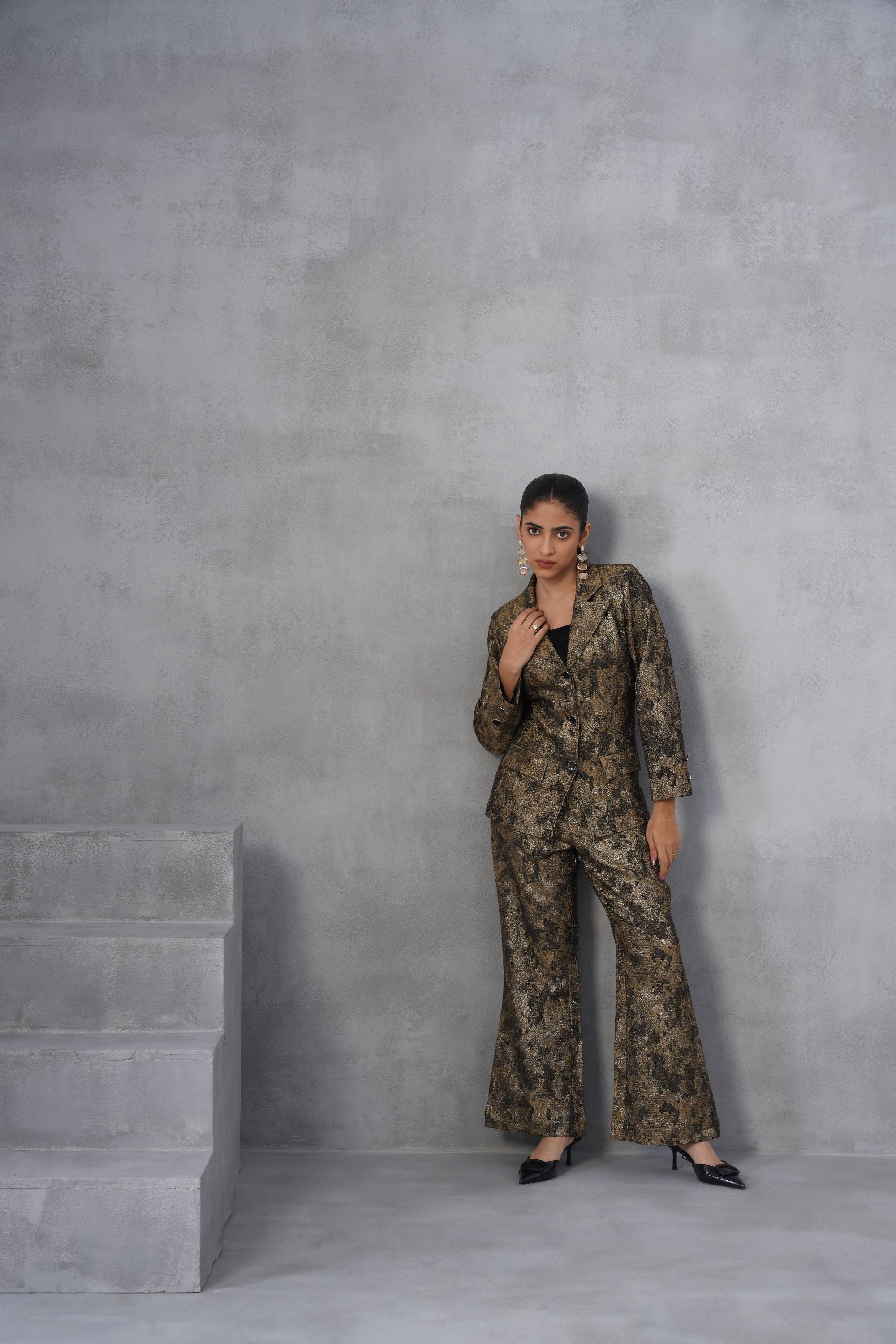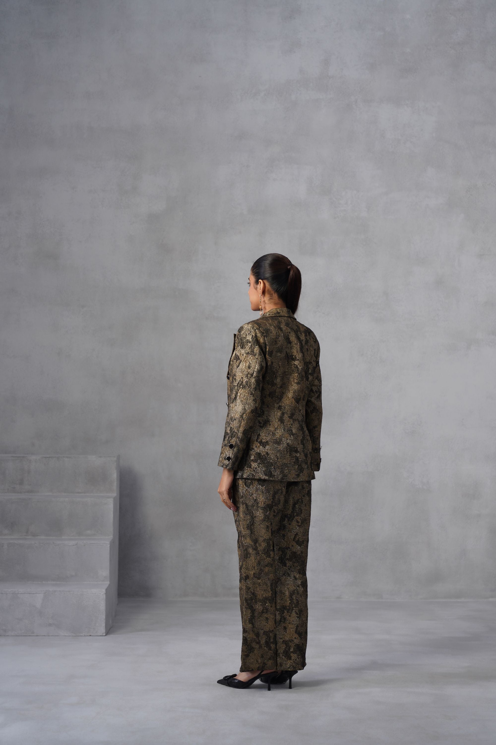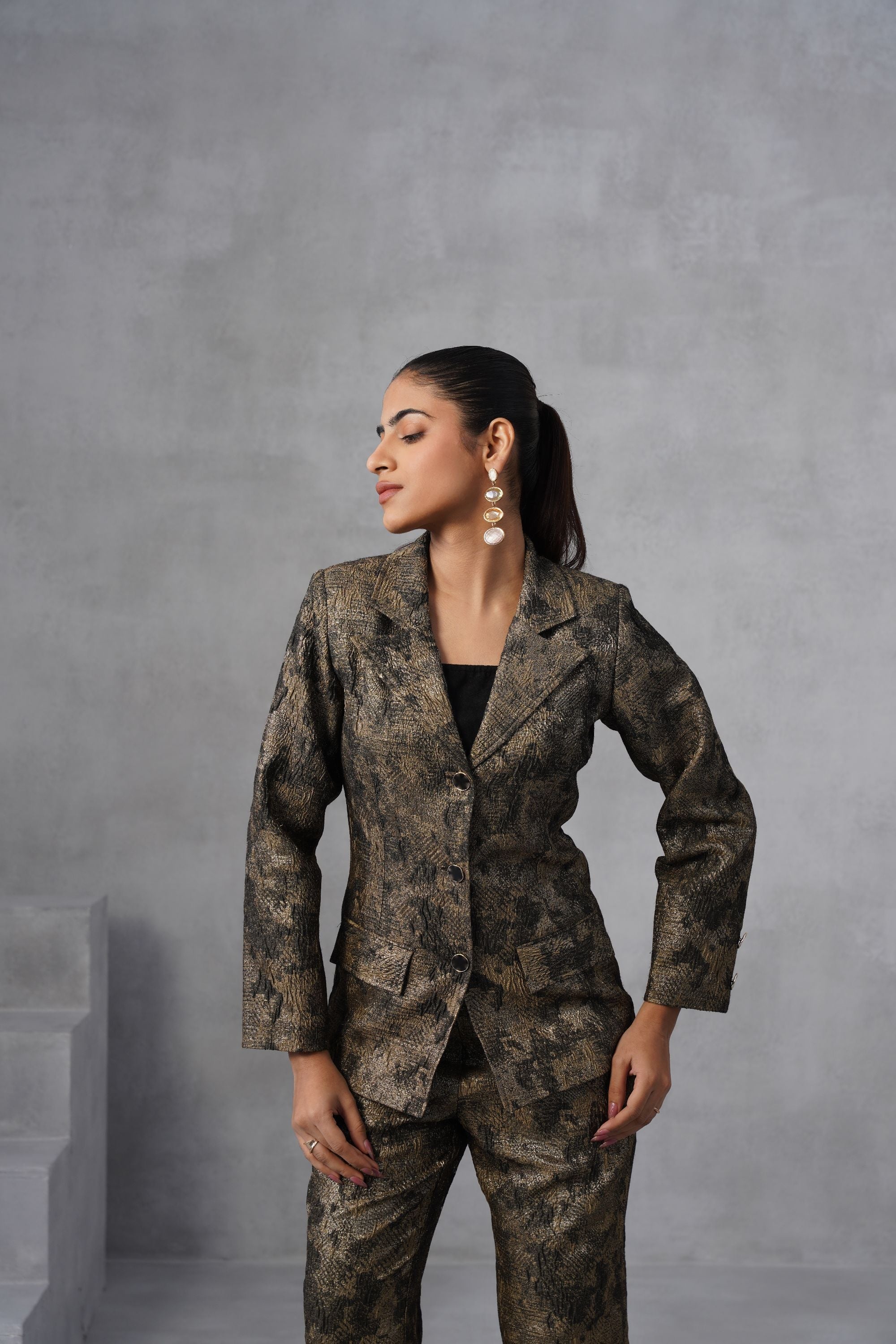 This Blazer features a textured fabric in earthy tones. Bold sophistication for cocktail parties or formal evening events
