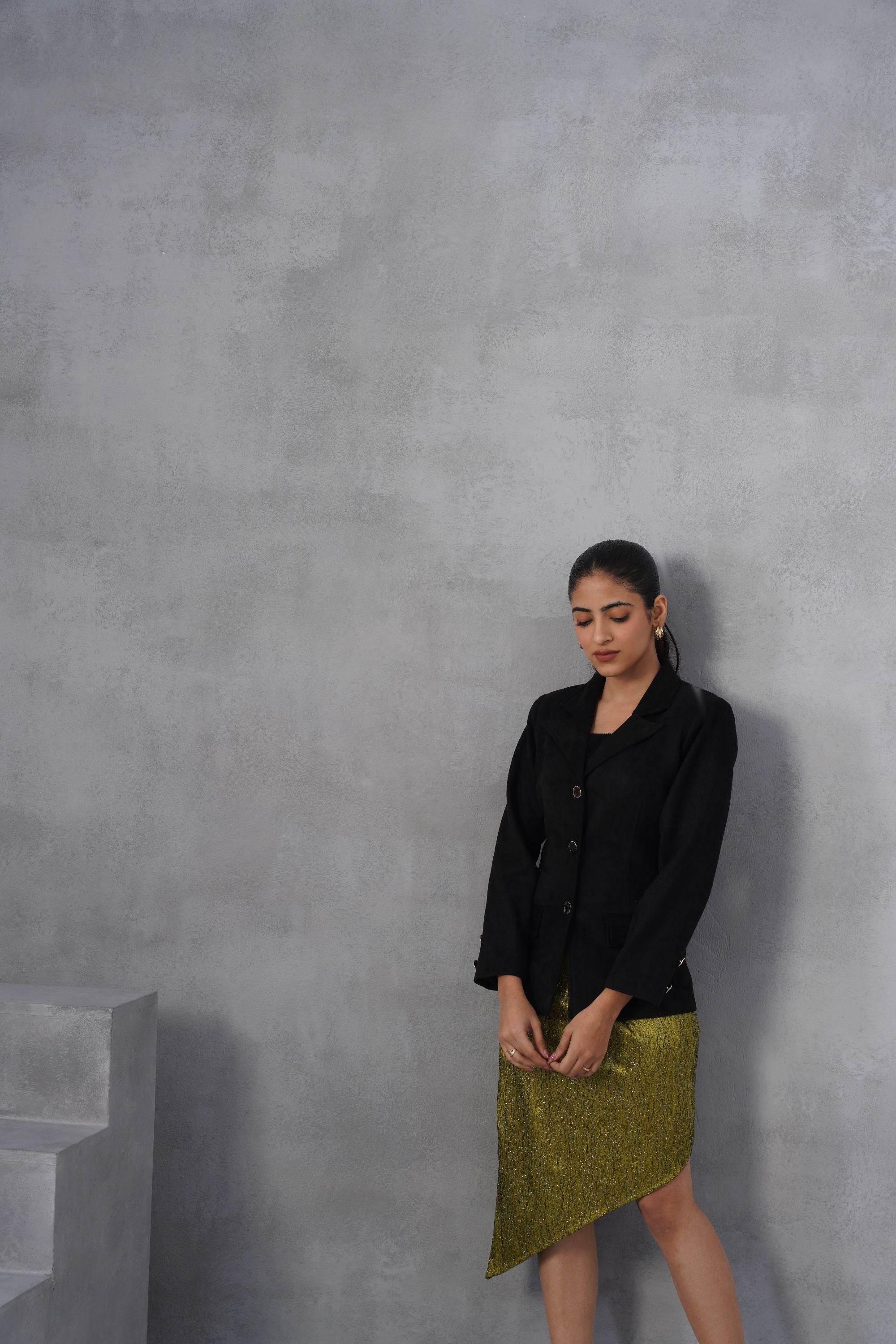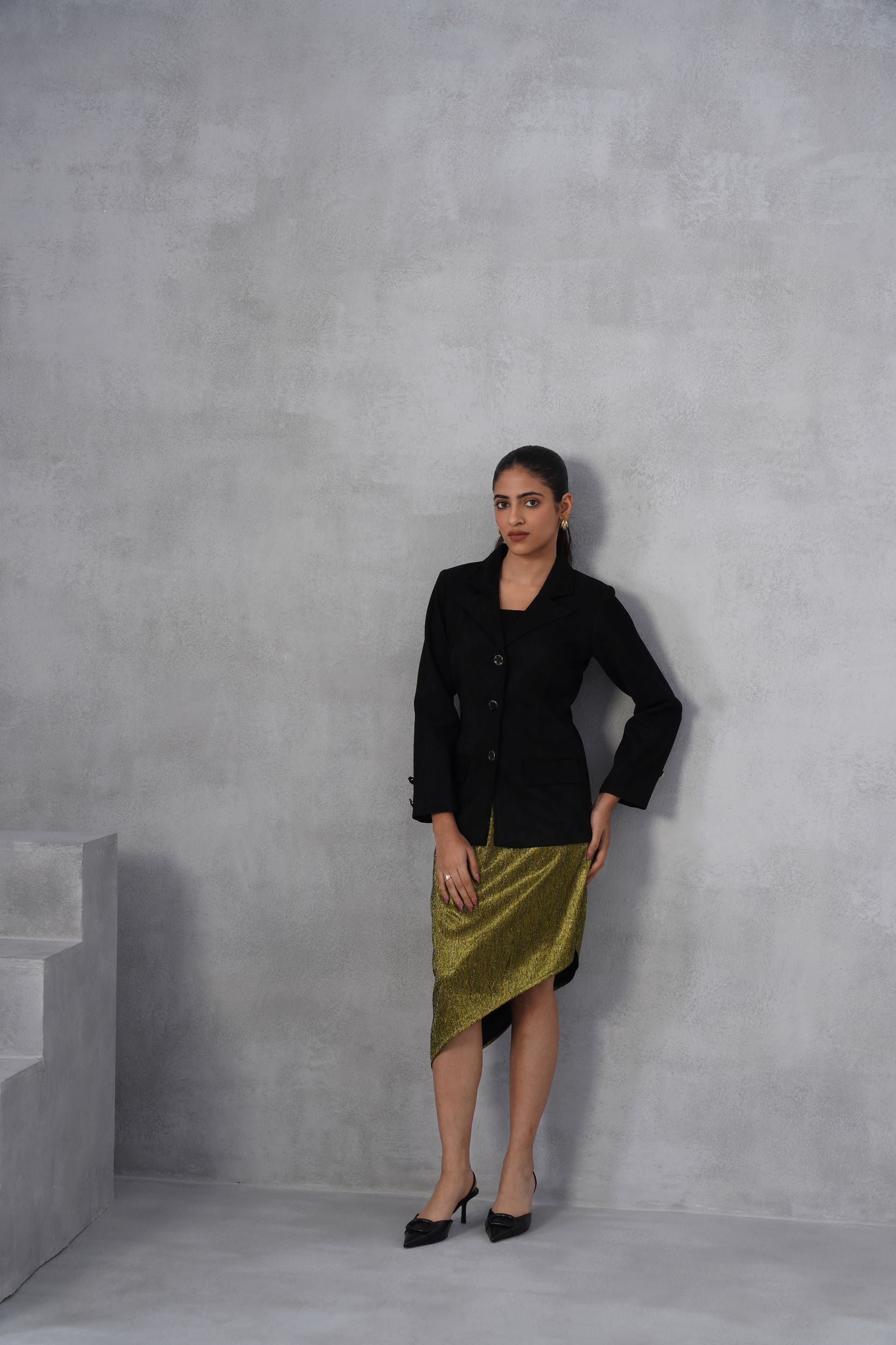 Elegant and bold, featuring a fitted black blazer perfect for cocktail events, fashionable business gatherings, or semi-formal night outs