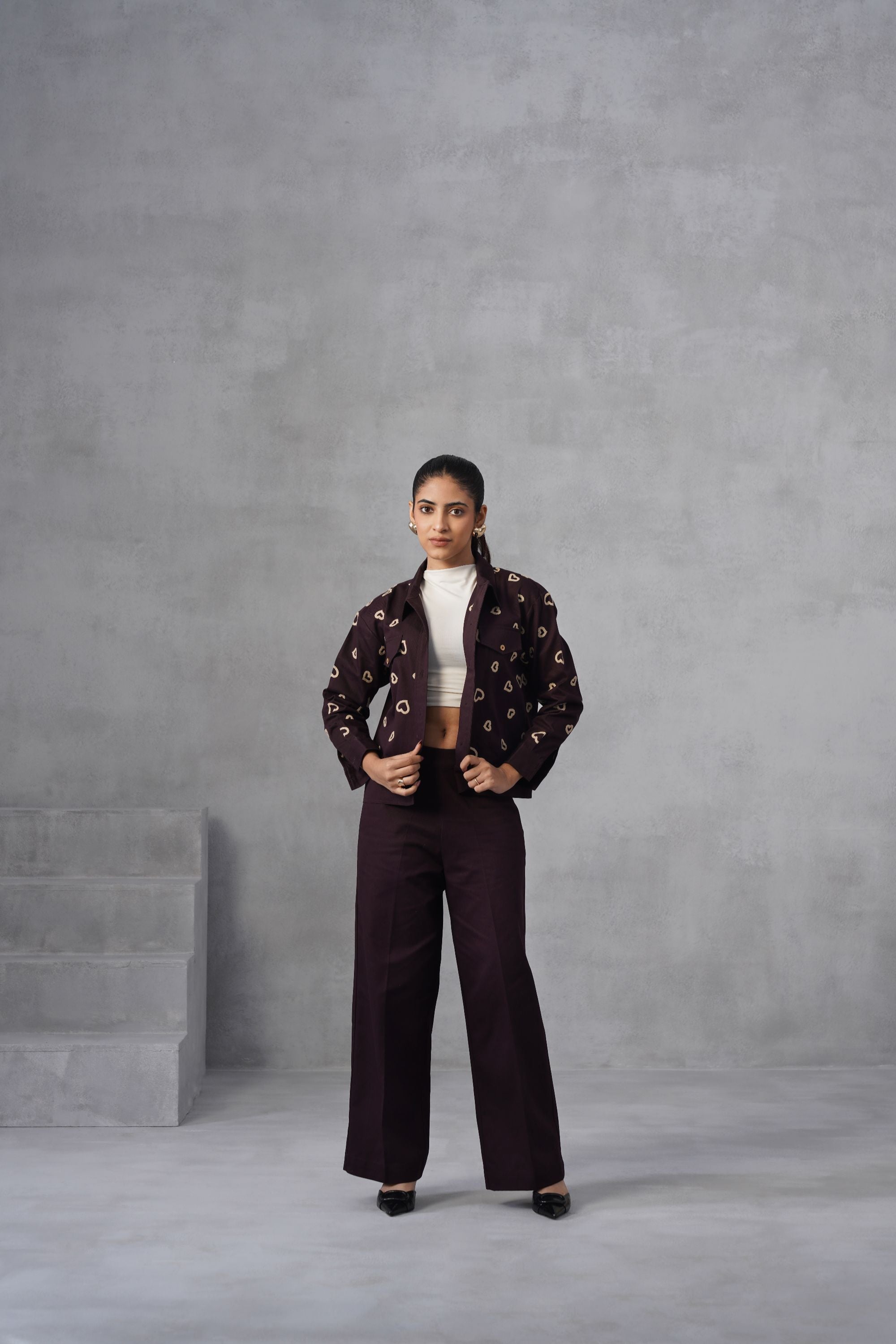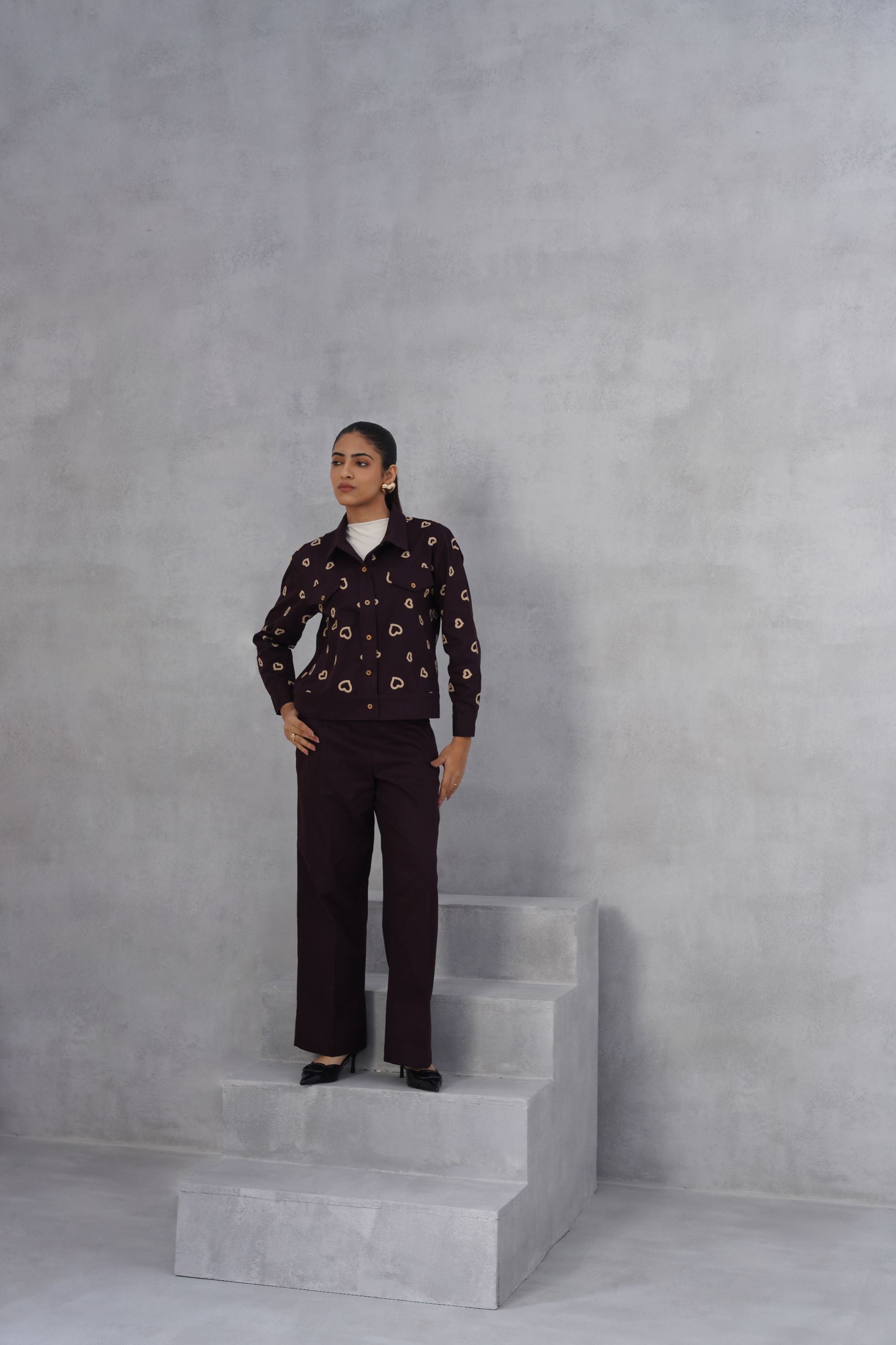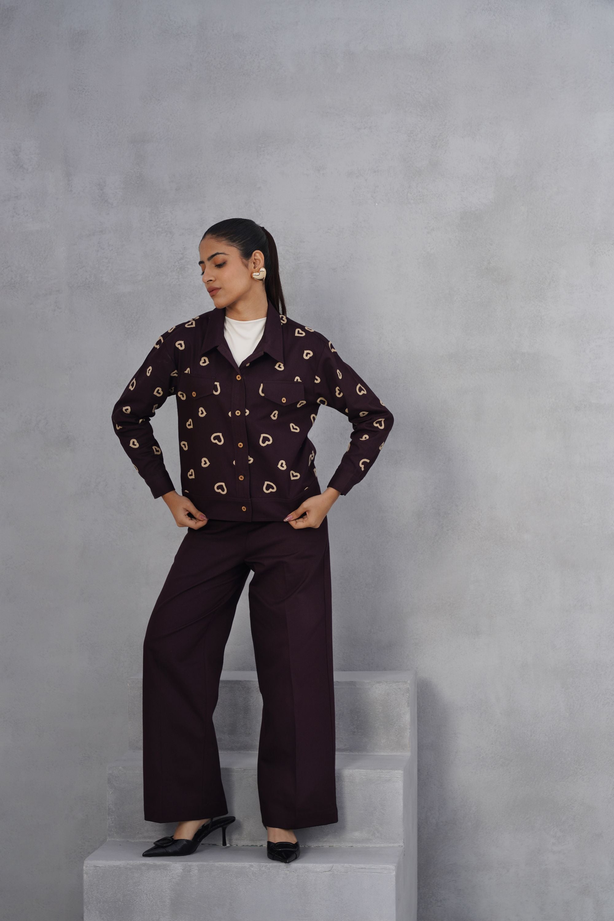 This Midnight Heart Co-ord set is all about the details—from the delicate heart thread embroidery on the shacket and trouser back pocket to the relaxed, wide-leg trousers. Dress it up with heels or keep it cool with sneakers. Top: Cropped Shacket which features an all-over repeating pattern of embroidered hearts in a contrasting color. It has a classic collar, and pockets flaps on the chest with button closures, and buttoned cuffs. Bottom: High-waisted, wide-leg trousers, creating a relaxed yet tailored silhouette. The back pocket has embroidered hearts matching the pattern on the jacket, highlighting the coordinated nature of the set. High-neck inner not included