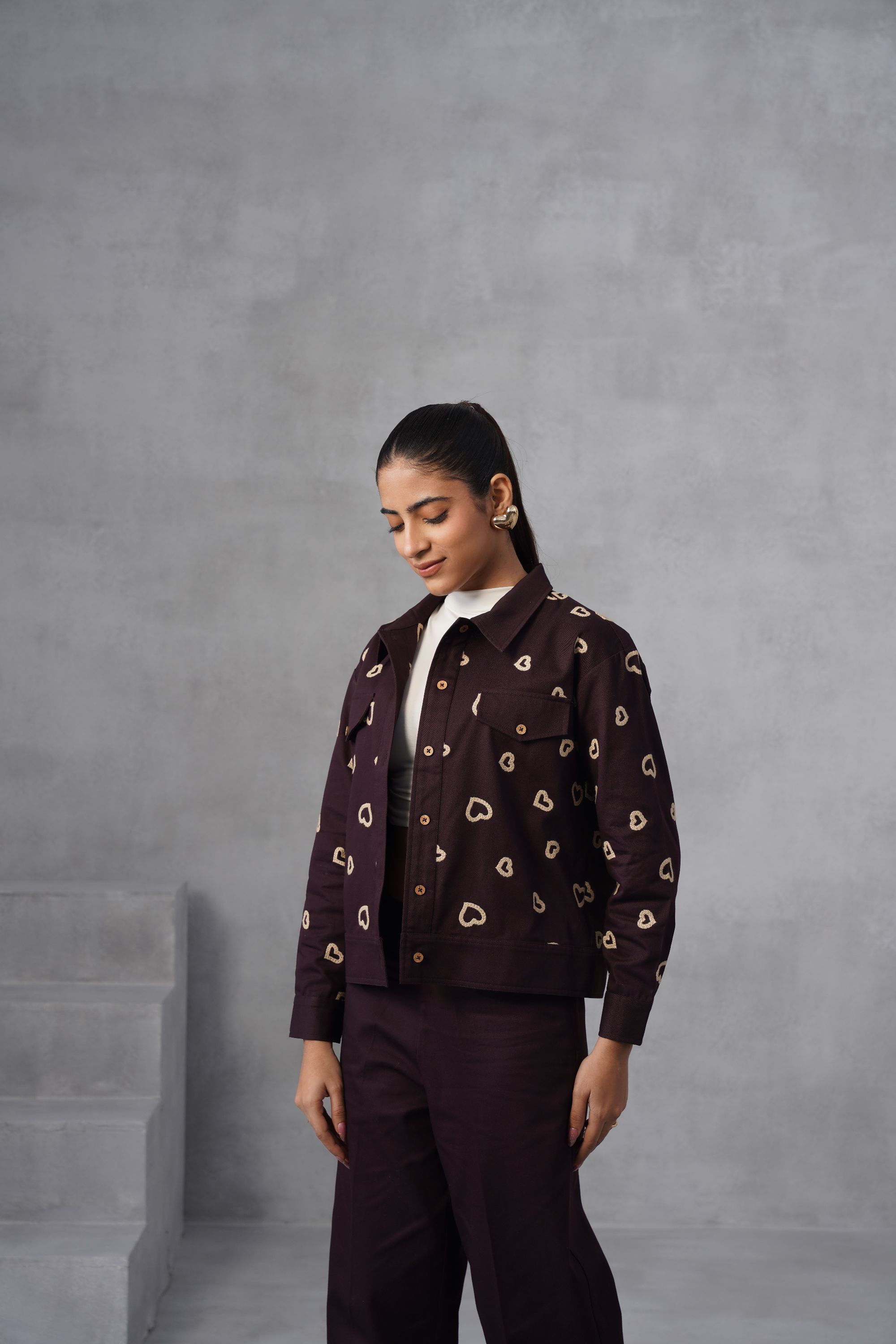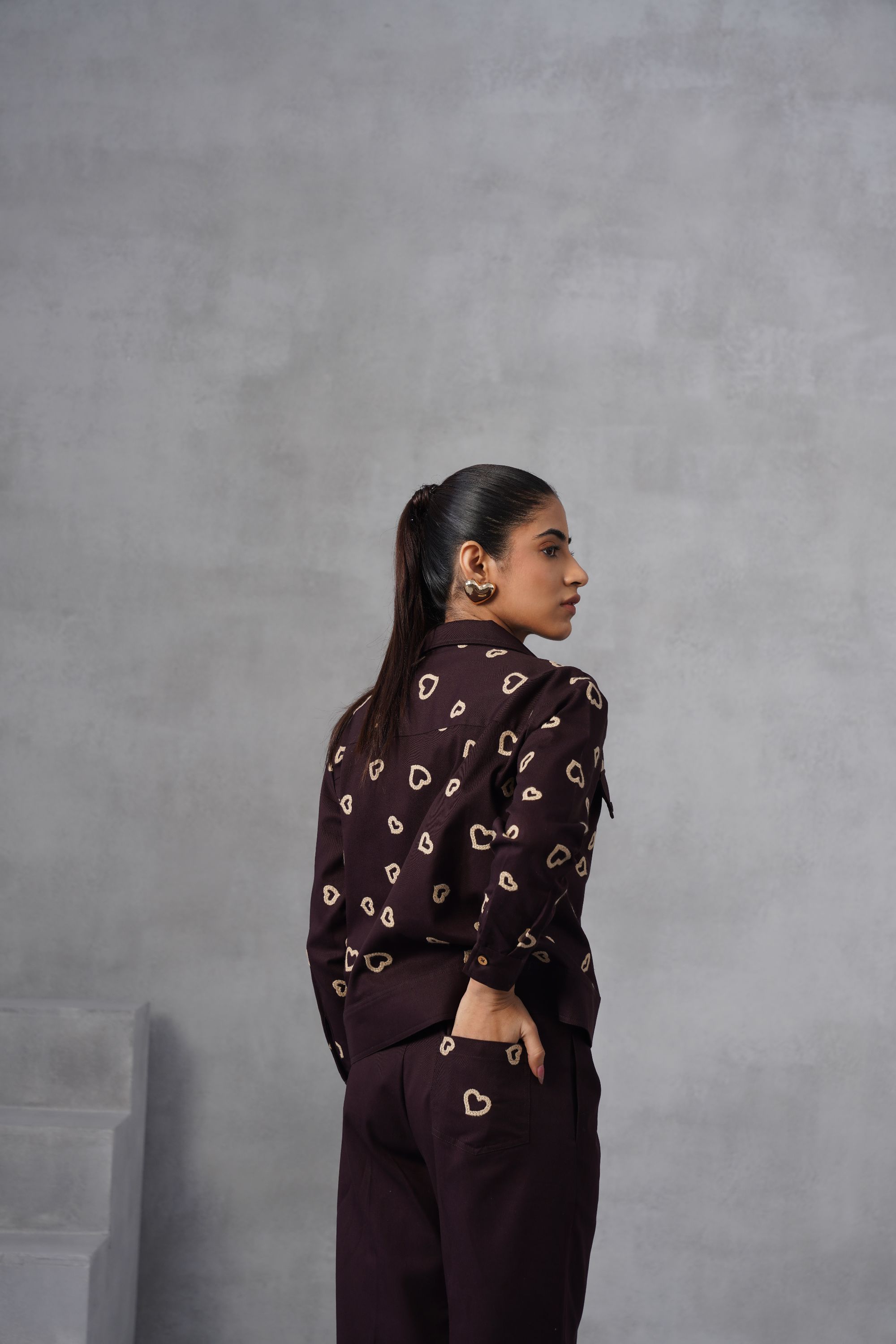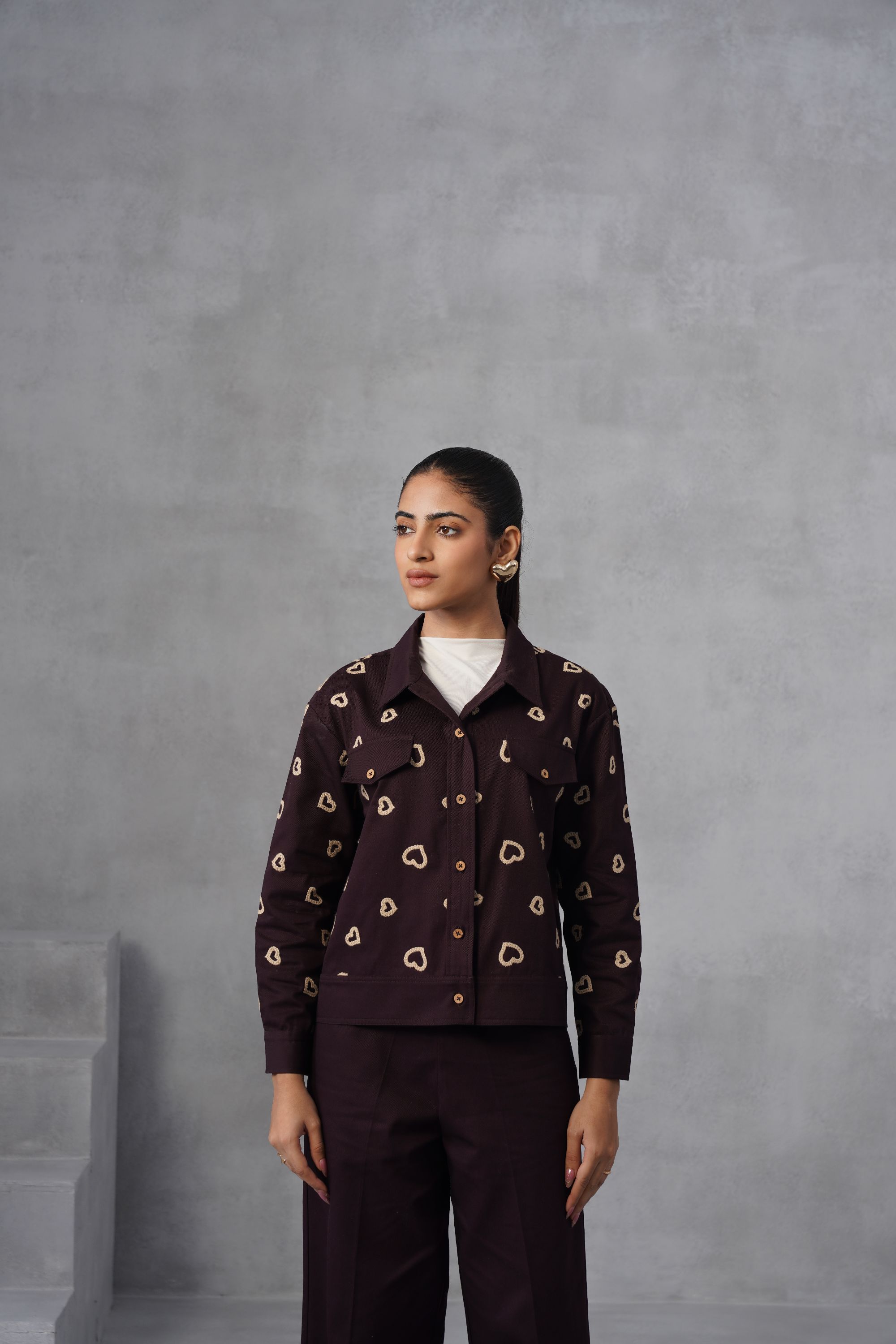 This Midnight Heart Co-ord set is all about the details—from the delicate heart thread embroidery on the shacket and trouser back pocket to the relaxed, wide-leg trousers. Dress it up with heels or keep it cool with sneakers. Top: Cropped Shacket which features an all-over repeating pattern of embroidered hearts in a contrasting color. It has a classic collar, and pockets flaps on the chest with button closures, and buttoned cuffs. Bottom: High-waisted, wide-leg trousers, creating a relaxed yet tailored silhouette. The back pocket has embroidered hearts matching the pattern on the jacket, highlighting the coordinated nature of the set. High-neck inner not included