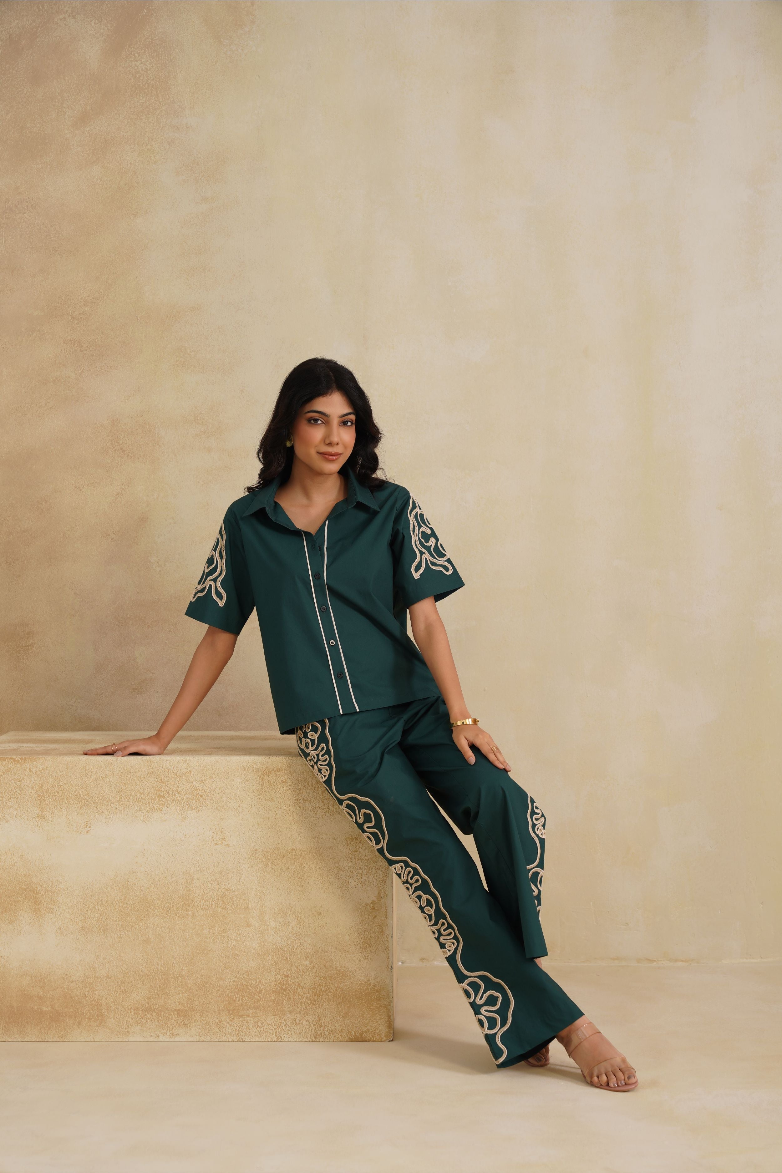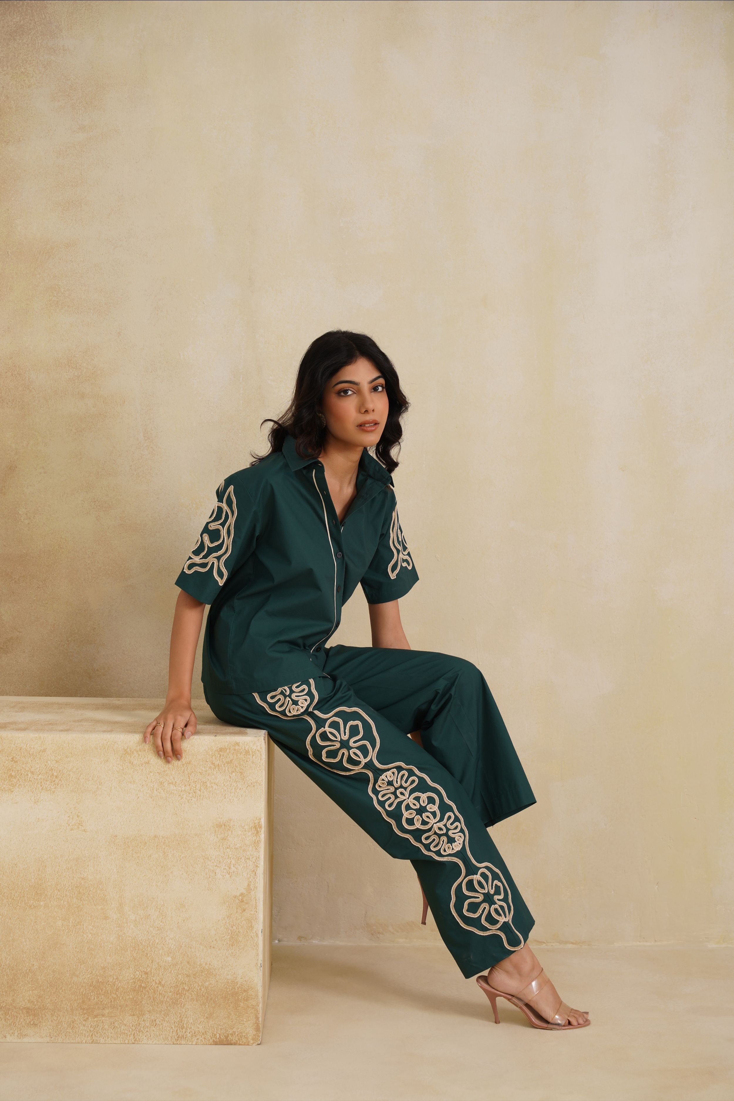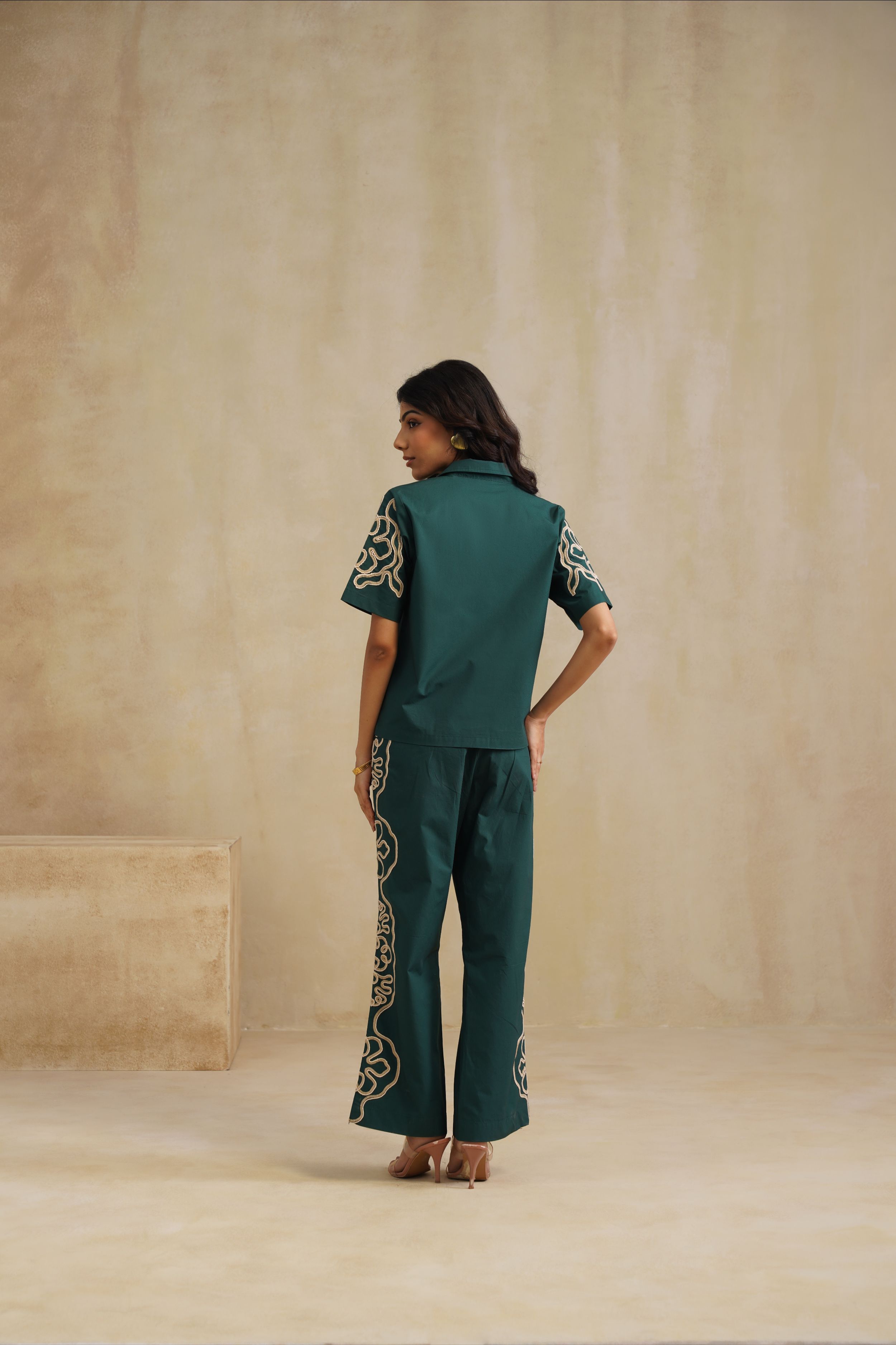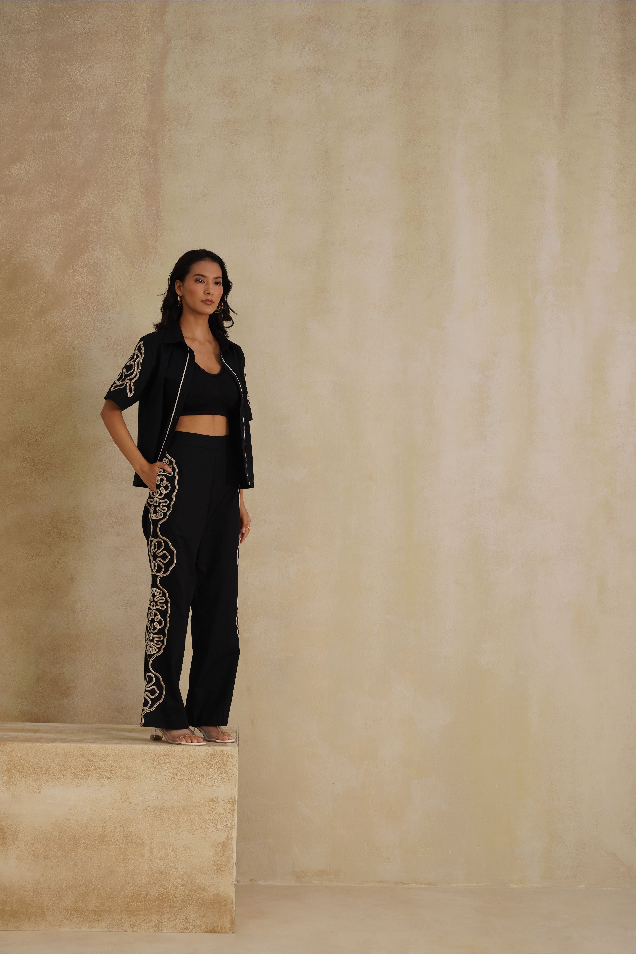 Edgy yet elegant, these sleek trousers are elevated with bold, ivory abstract dori embroidery. The striking contrast of black/ green and cream creates a dramatic statement, making them perfect for completing the Mirage Set or adding a standout touch to any outfit.