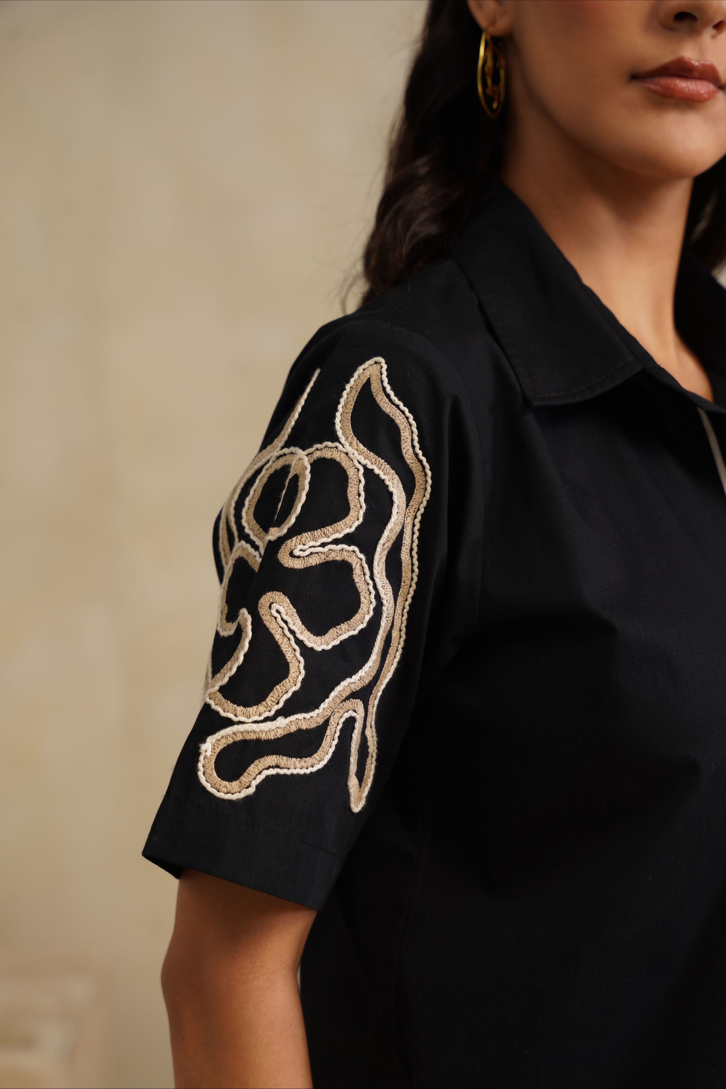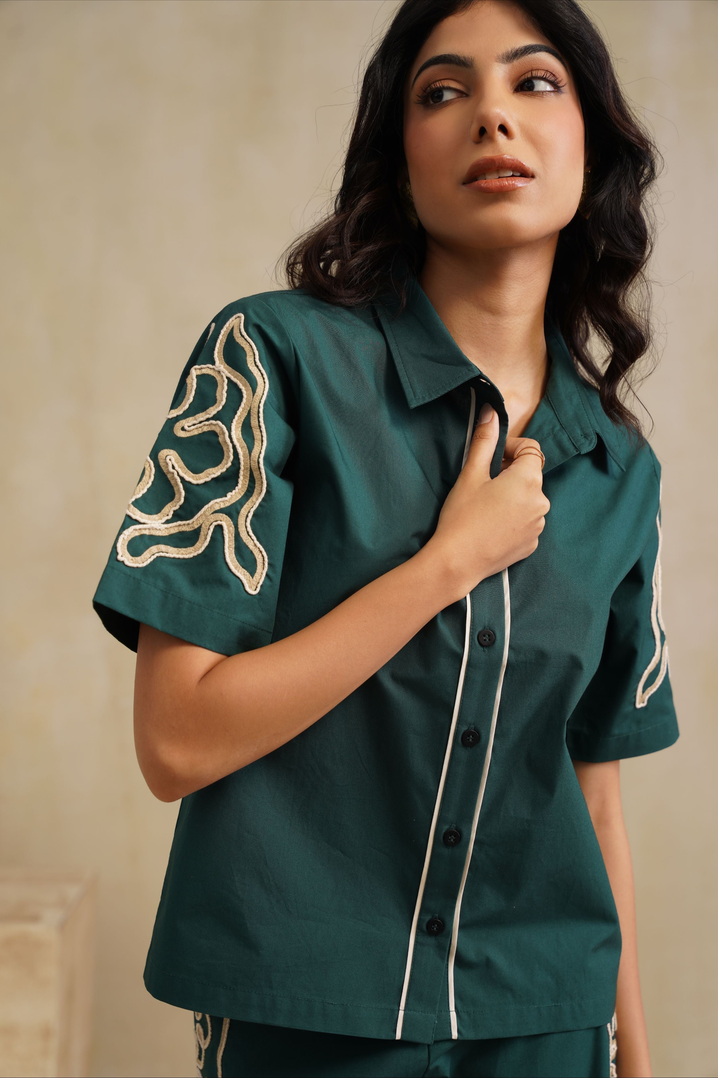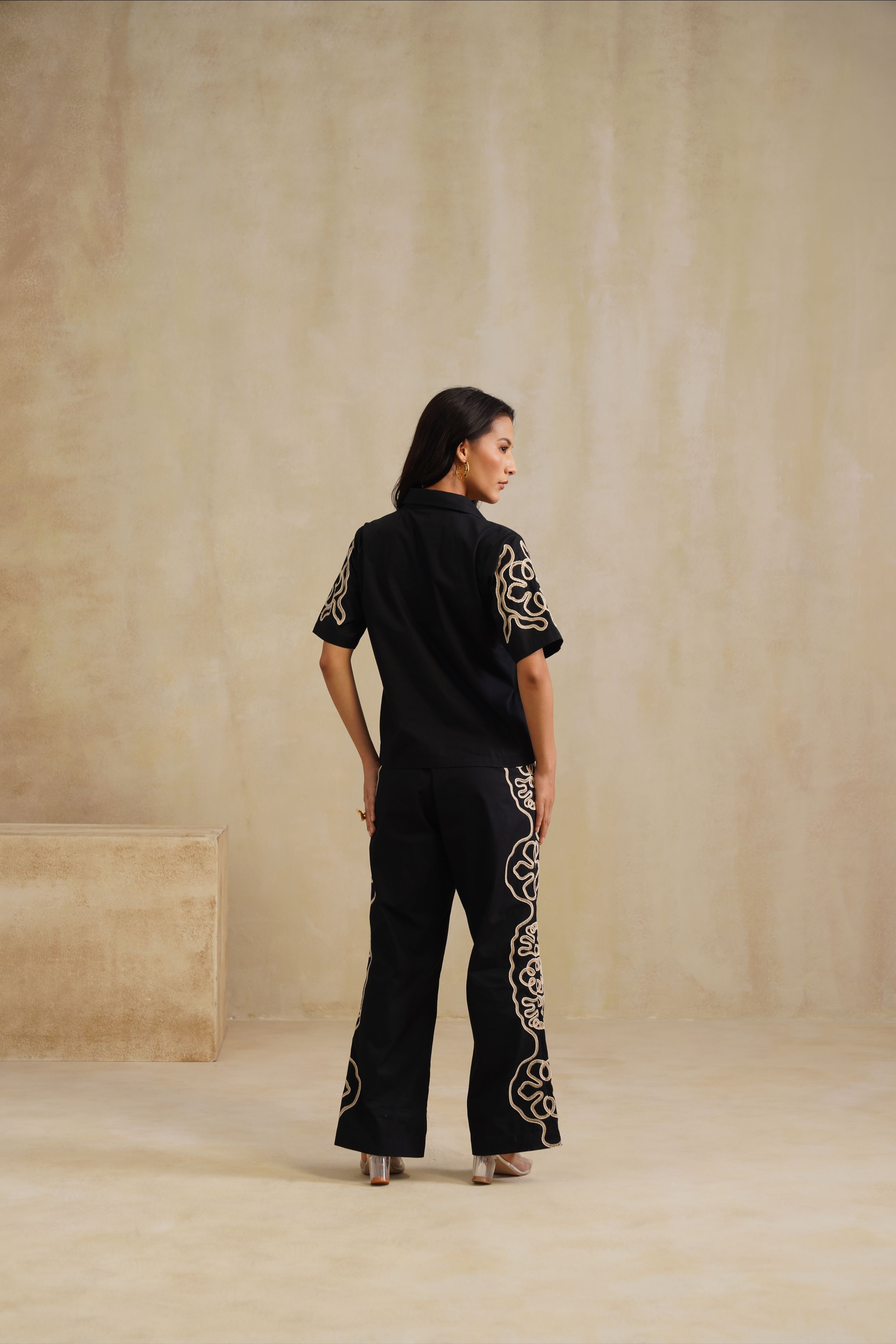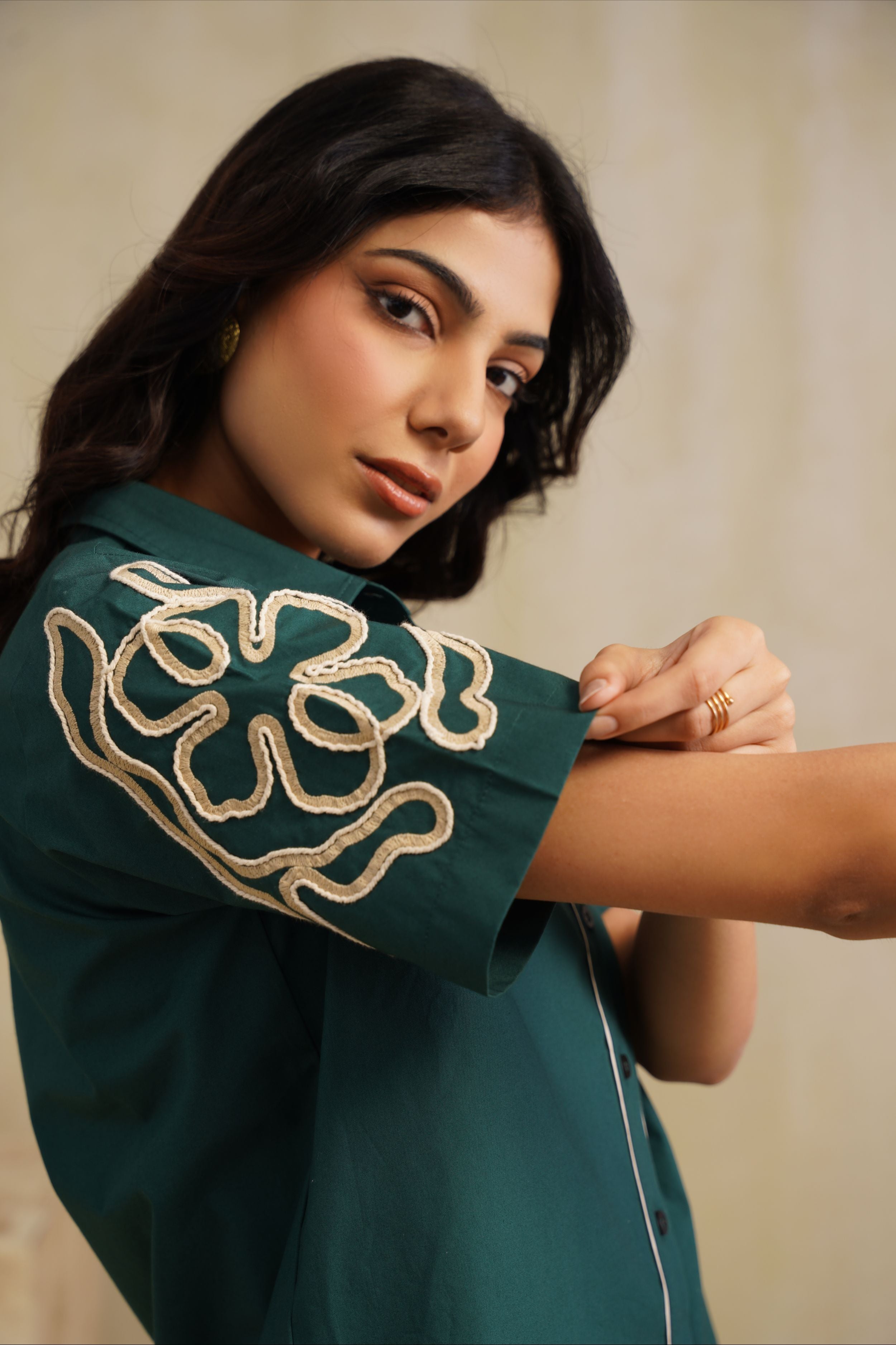 Vibrant and bold, this Mirage Set pairs a structured short-sleeve shirt with tailored trousers, both highlighted by striking ivory abstract dori embroidery. The black/ green base adds a refreshing twist to contemporary elegance, making this set perfect for statement dressing at soirées, artful gatherings, or standout day-to-night looks.