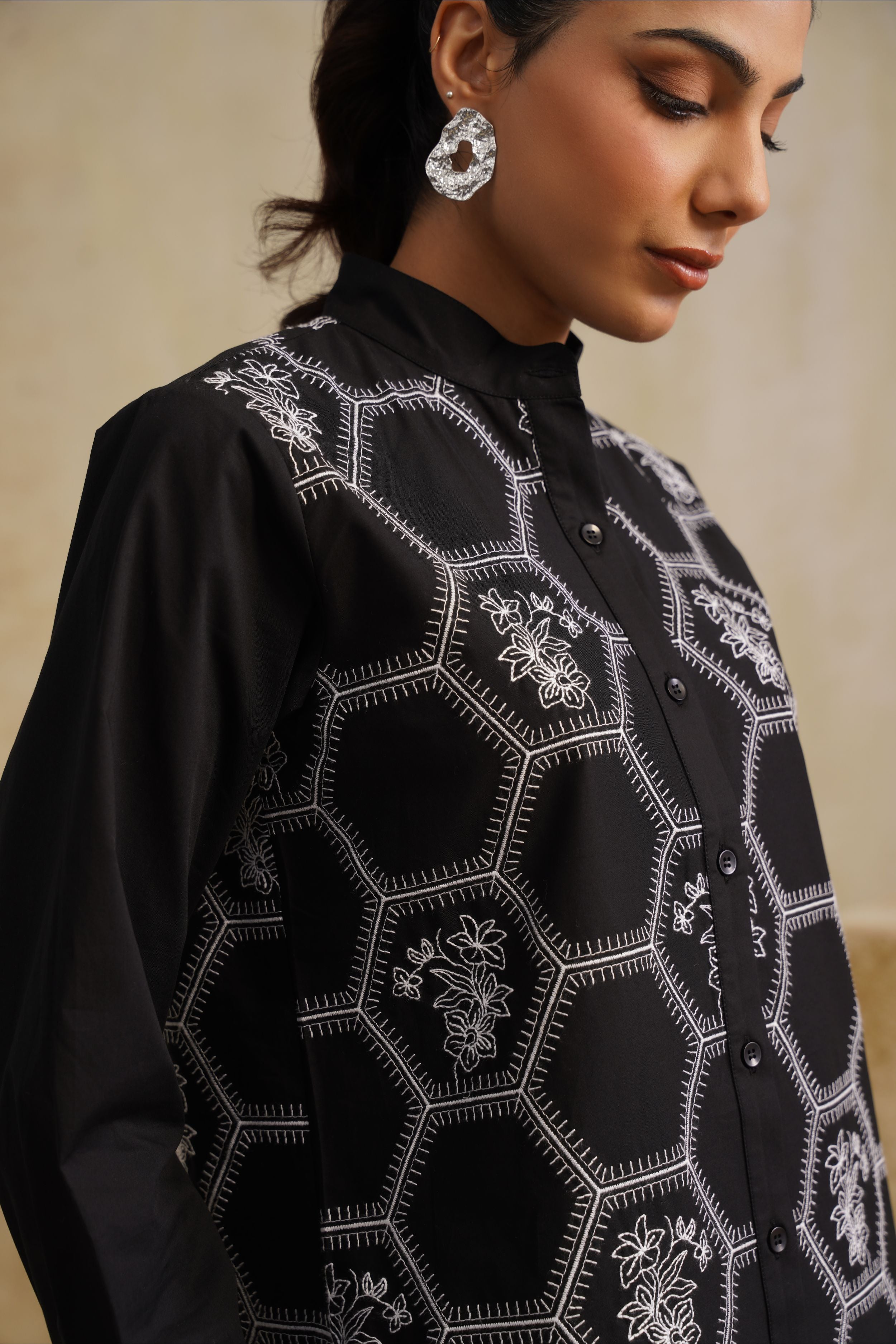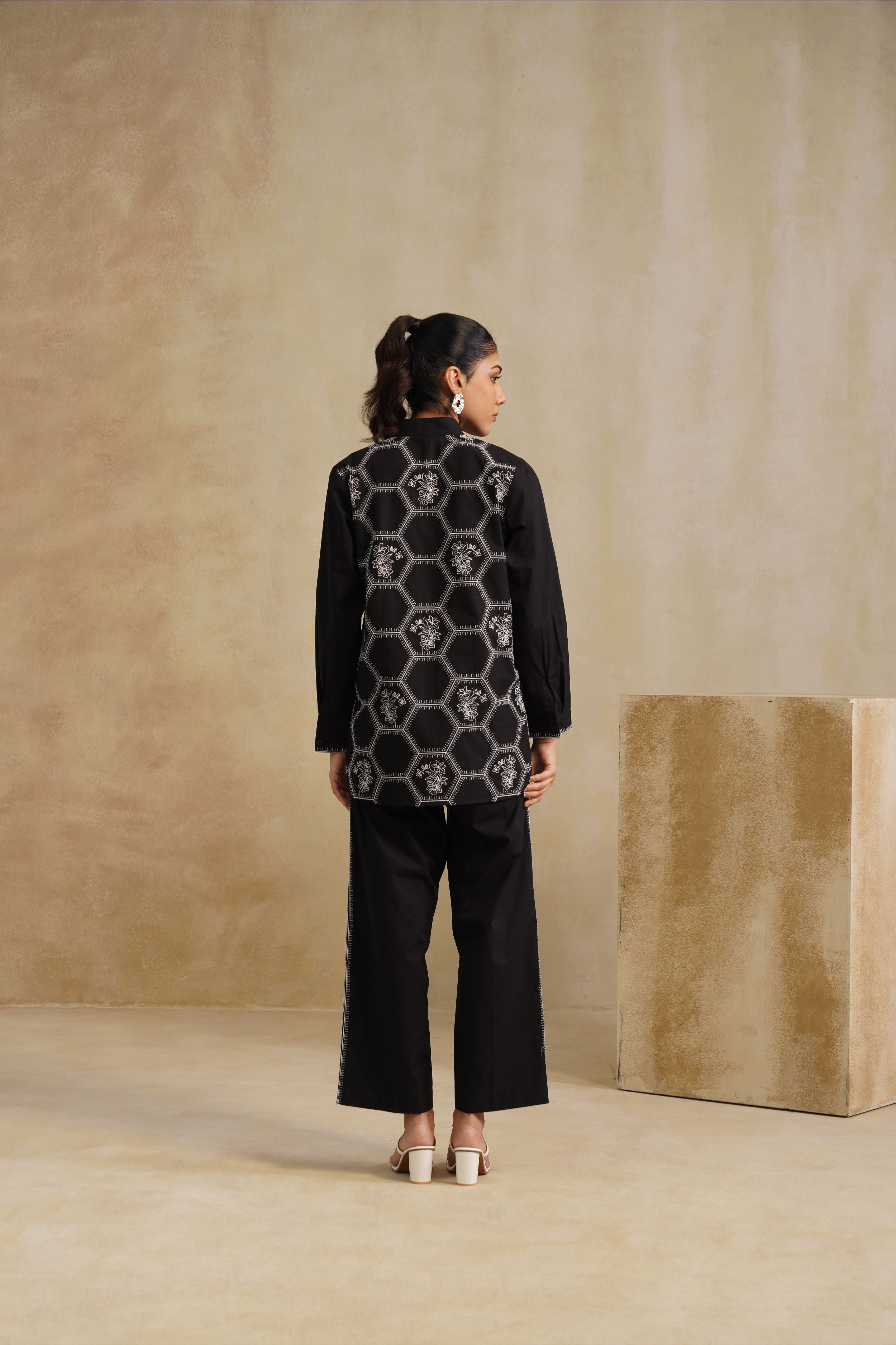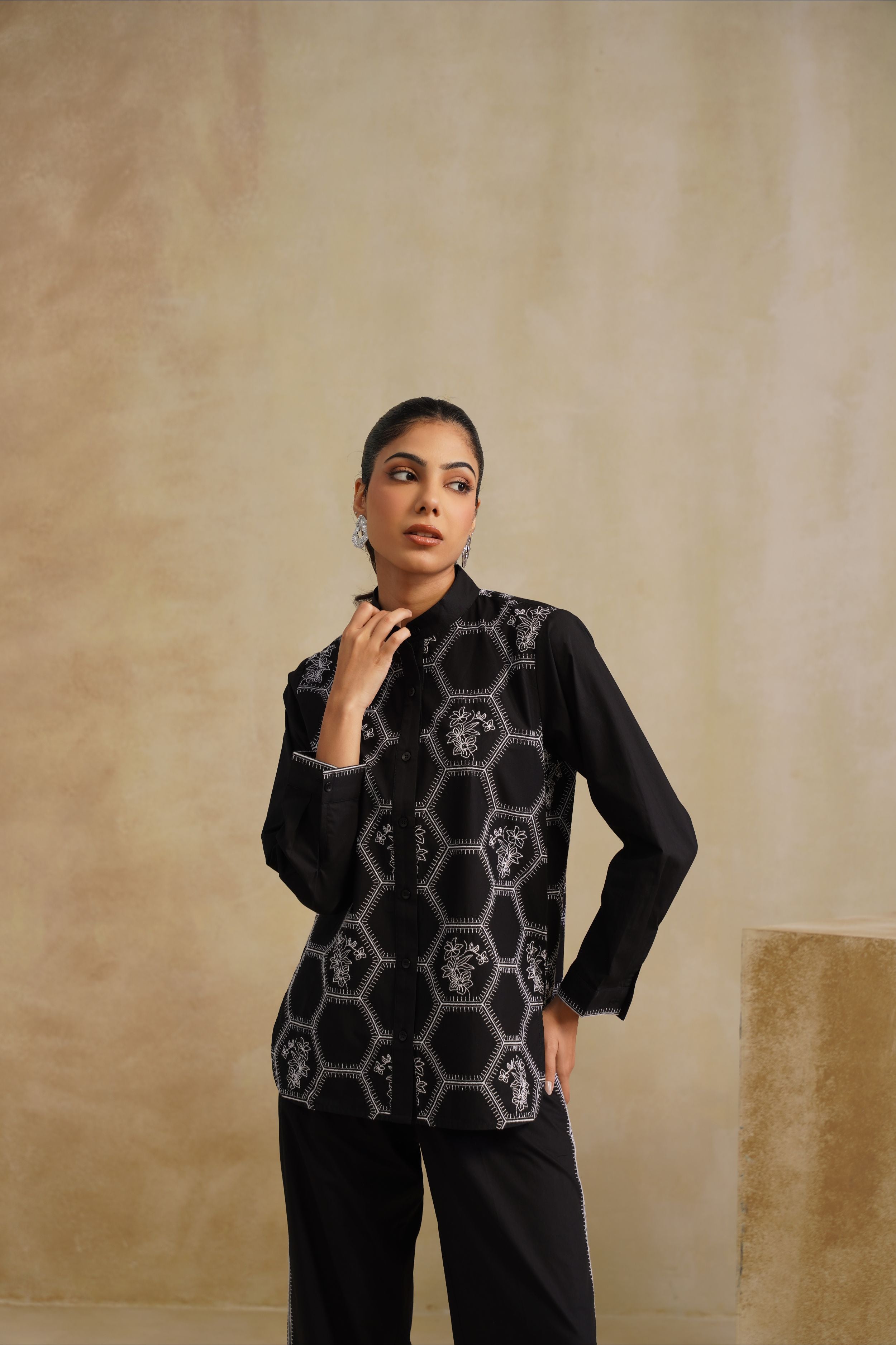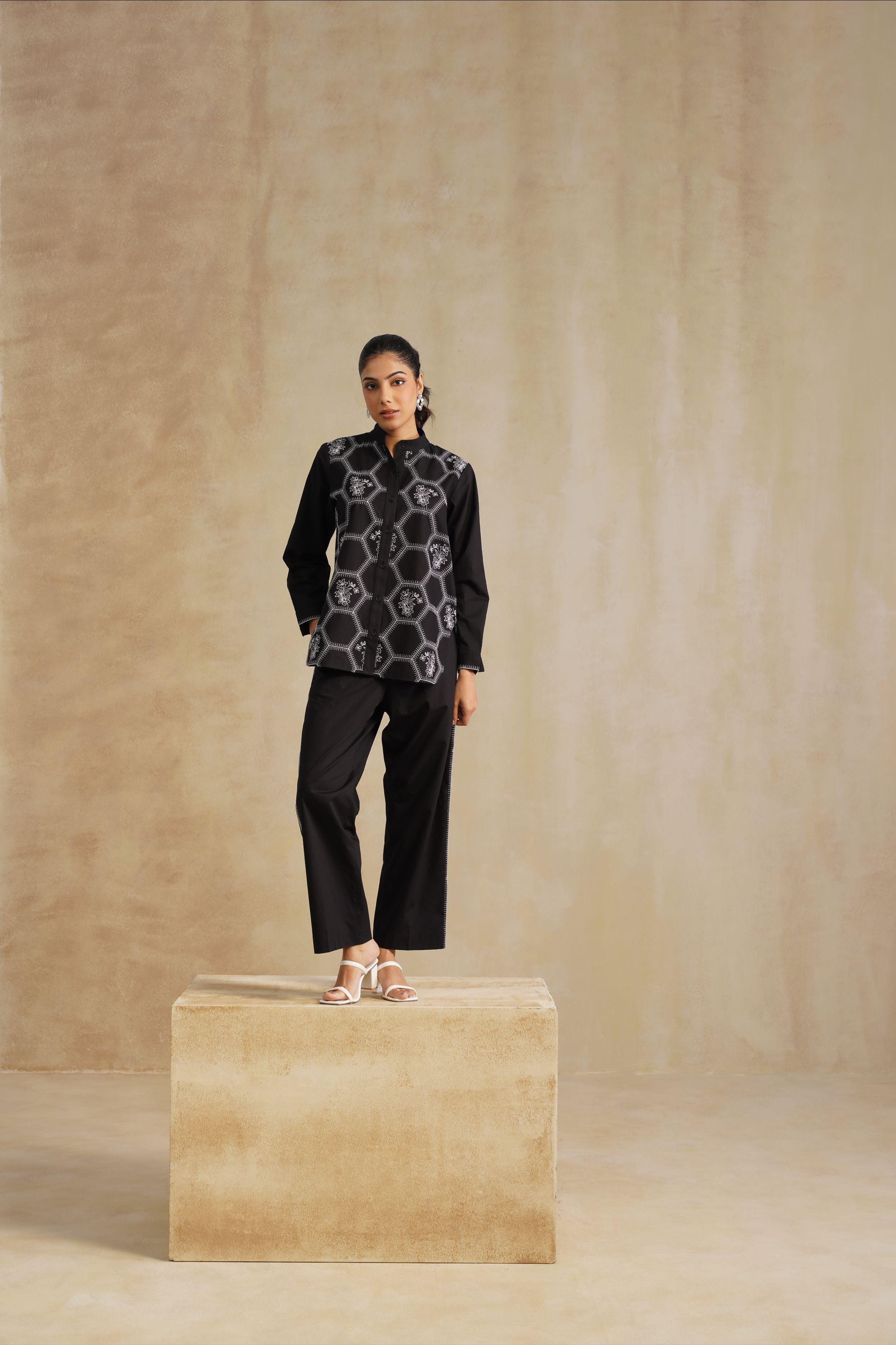 The Noir Hexa Embroidered Set brings contemporary geometry to timeless elegance. Designed in a deep black canvas, the shirt features intricate hexagonal patterns with delicate floral embroidery, paired with sleek straight-fit trousers for a refined silhouette. Sophisticated yet statement-making, this set transitions seamlessly from modern soirées to elevated everyday dressing.