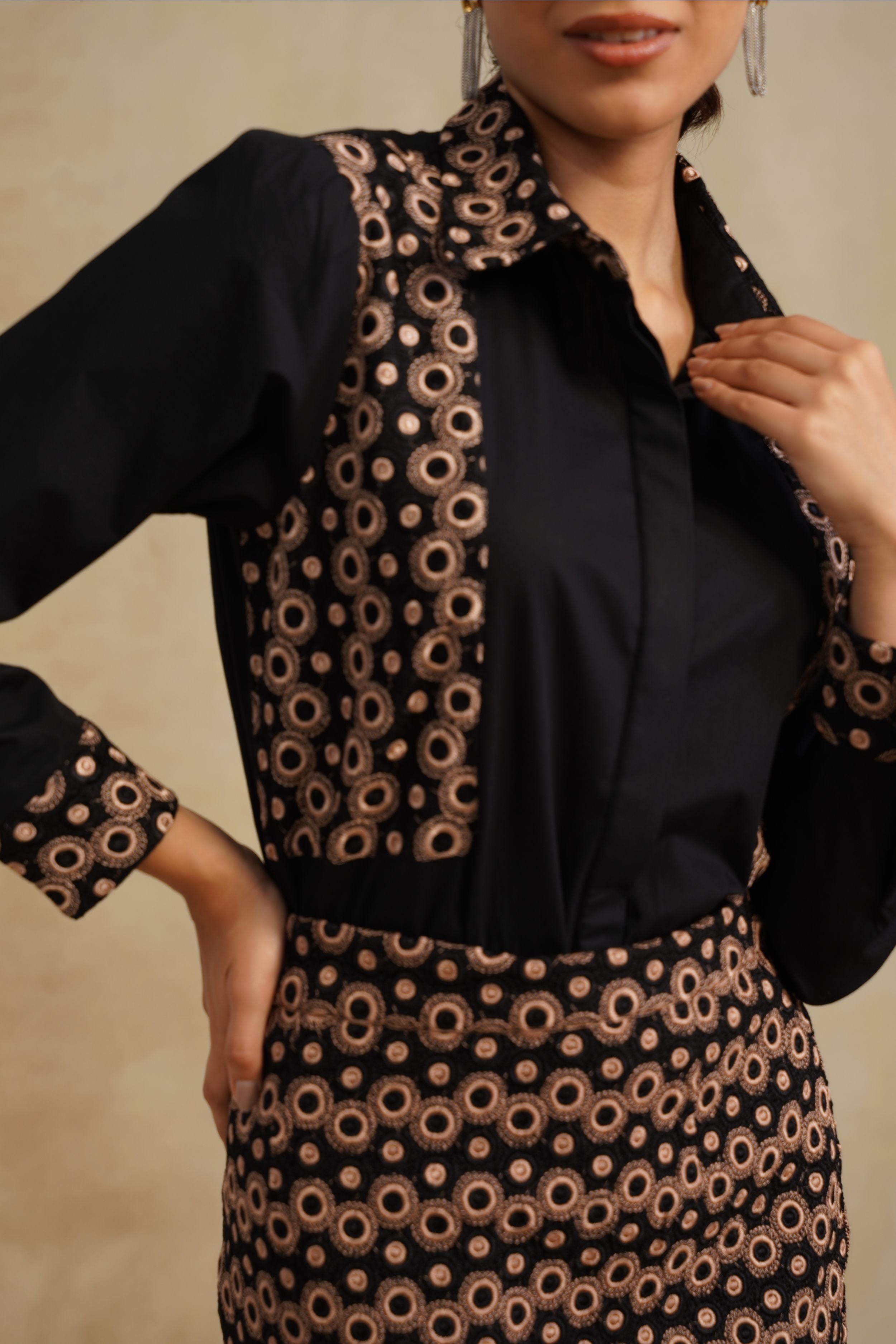 The Opulent Noir Co-ord is a bold statement in modern glamour. It features a structured black shirt with intricate circular embroidery along the collar, cuffs, and panels, paired with a matching embroidered mini skirt. This set strikes the perfect balance between elegance and edge. Designed for the confident woman, it’s a head-turning ensemble made for soirées, cocktails, and everything in between.