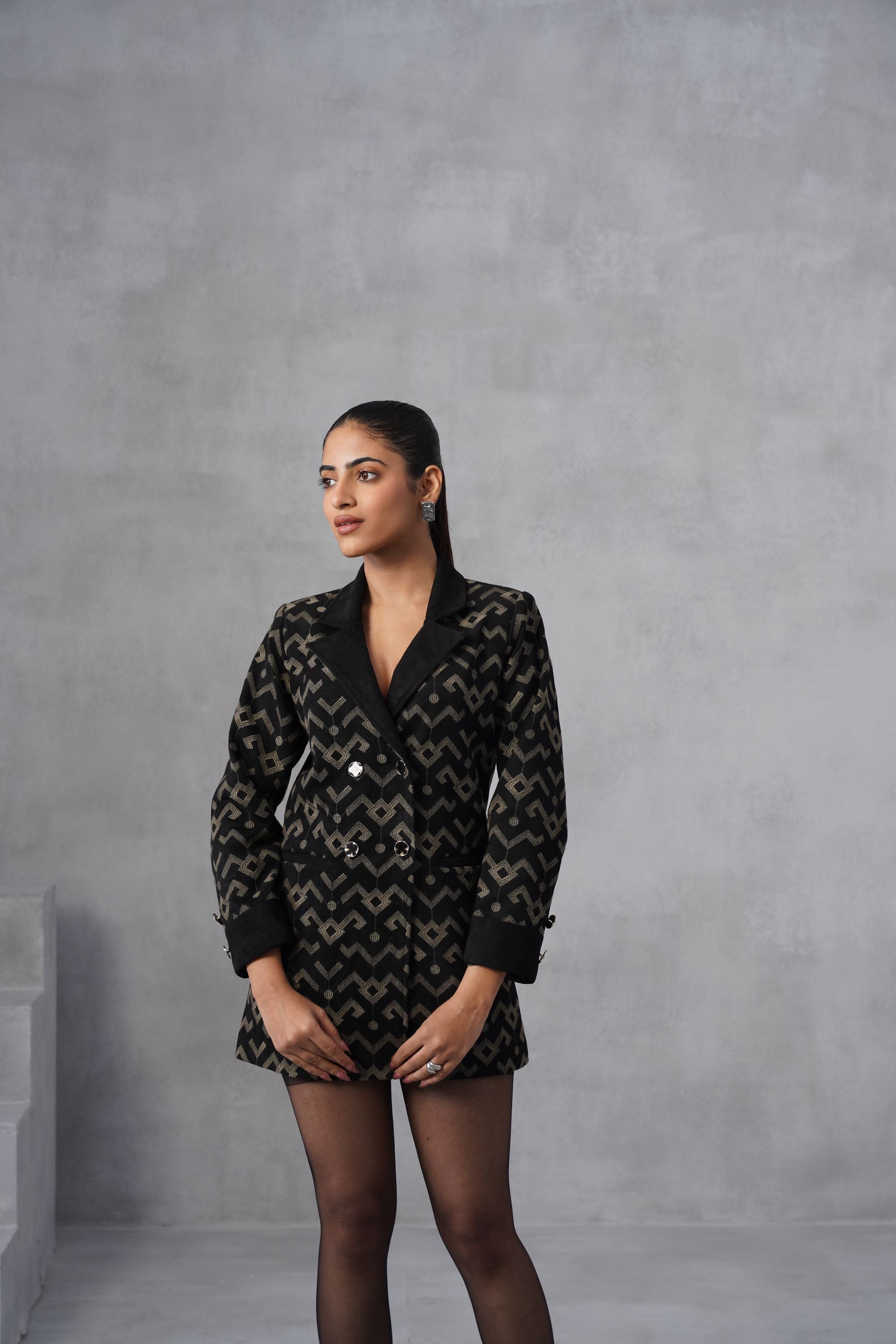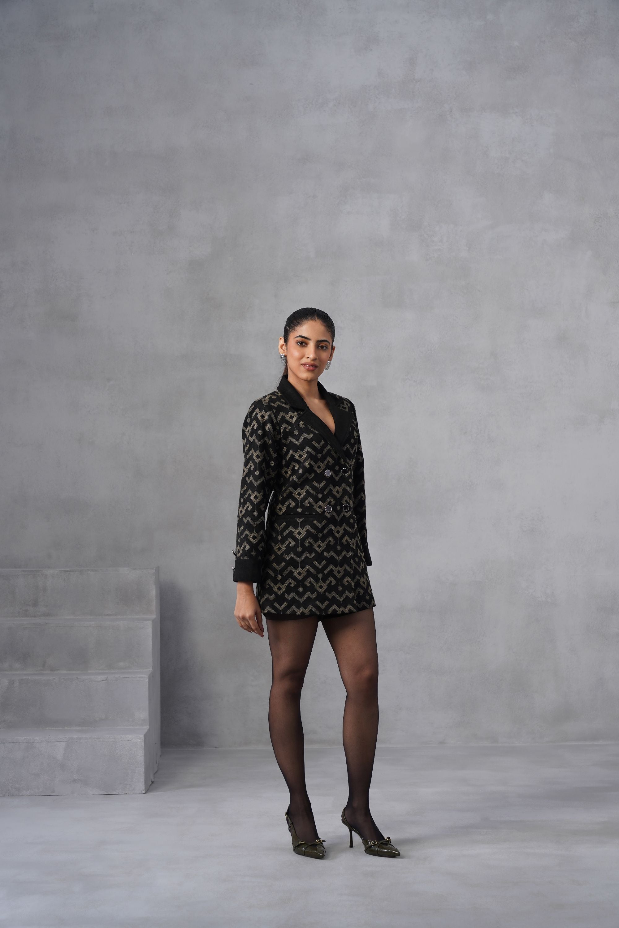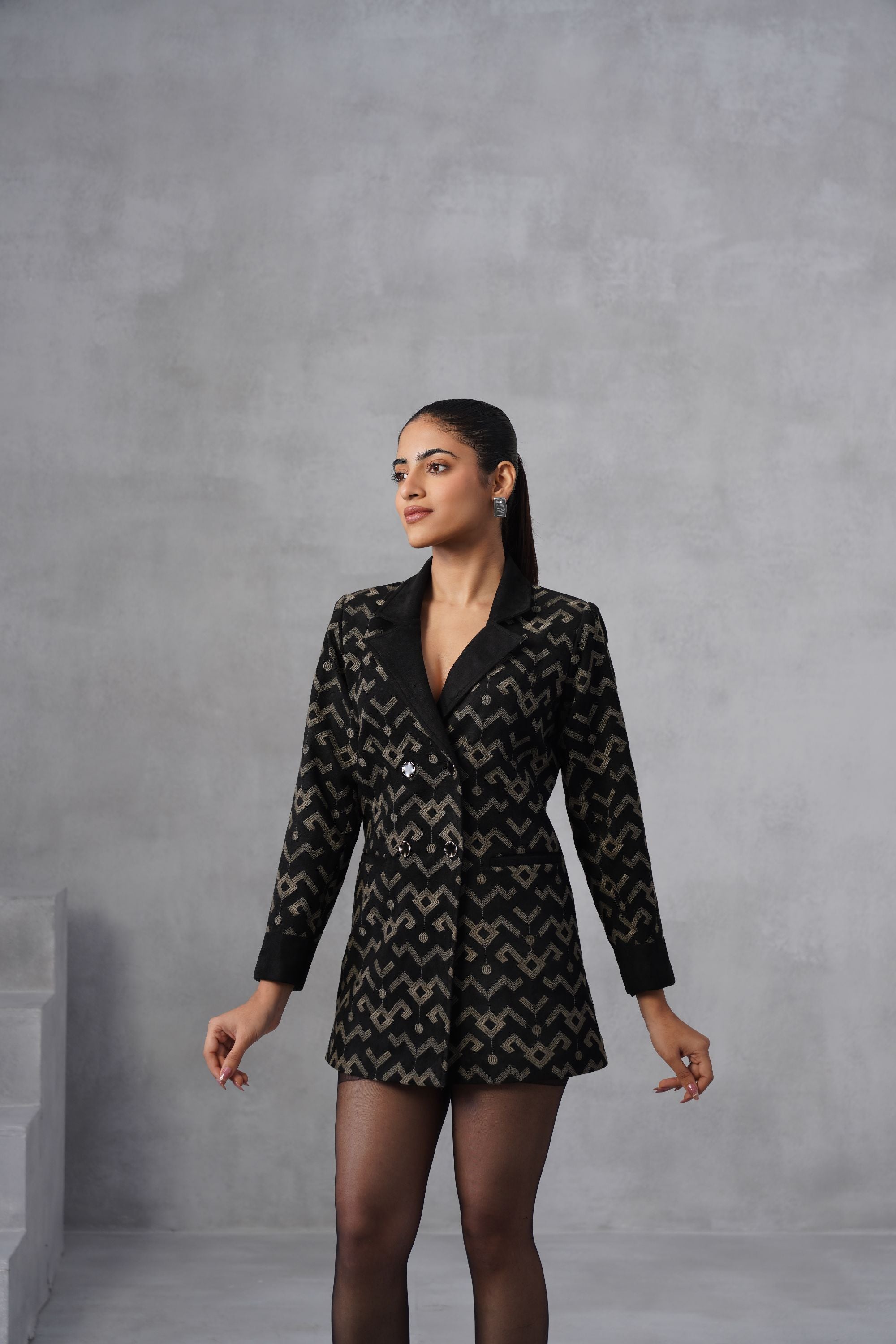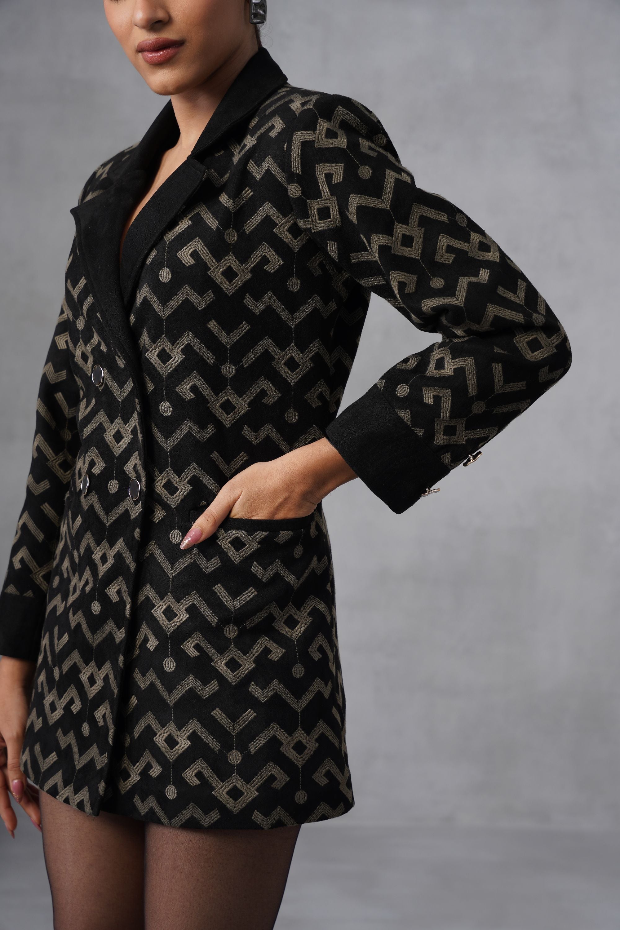 This dress transforms the classic blazer into a contemporary double -breasted mini-dress. It features a bold black and zig-zag pattern thread embroidery, offering a luxurious textured finish that catches the light beautifully. The blazer mini dress has a structured collar and lapels along with long sleeves and stylish buttons, making it a perfect outfit for cocktail parties, dinner dates or night outs.