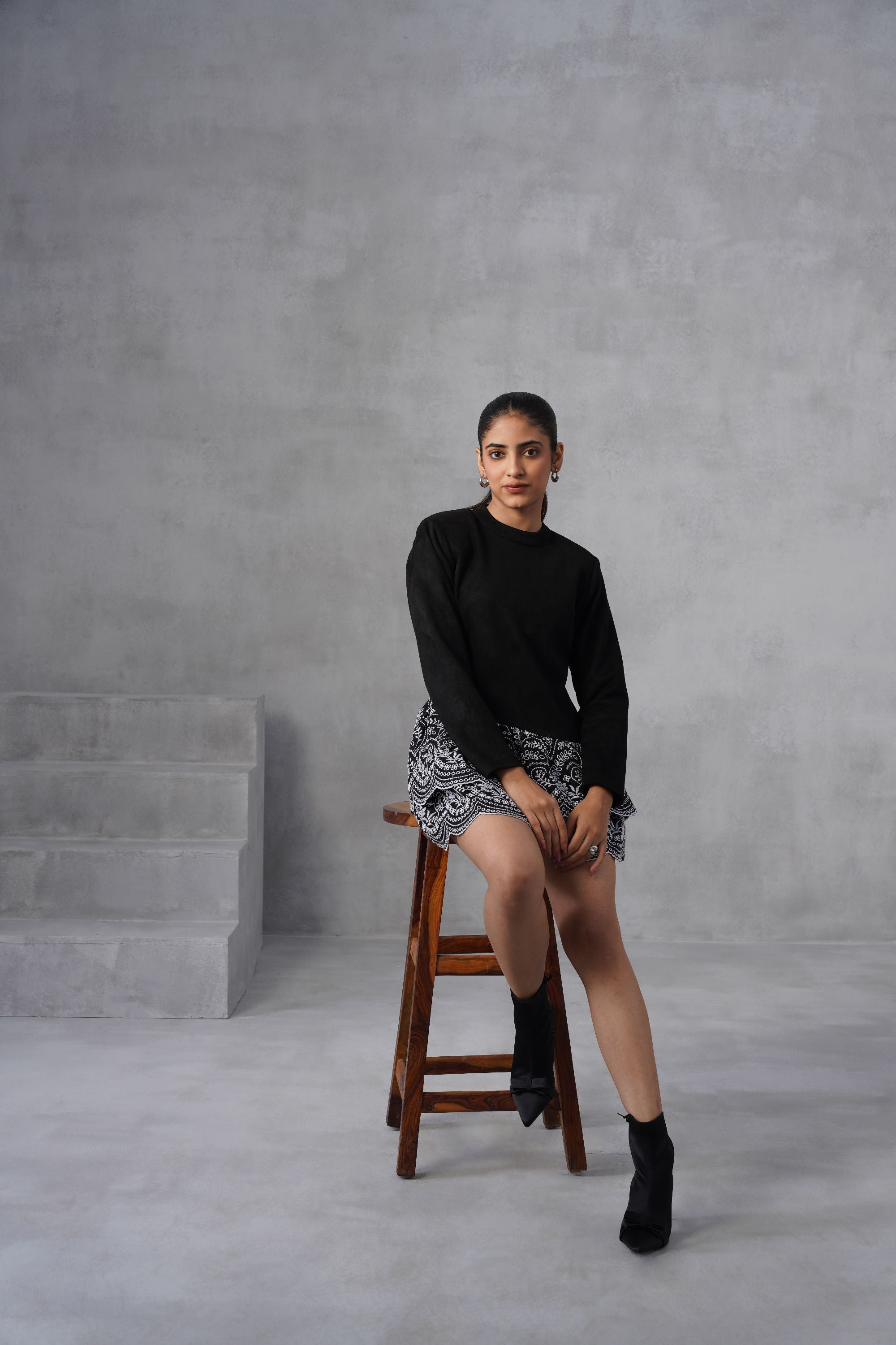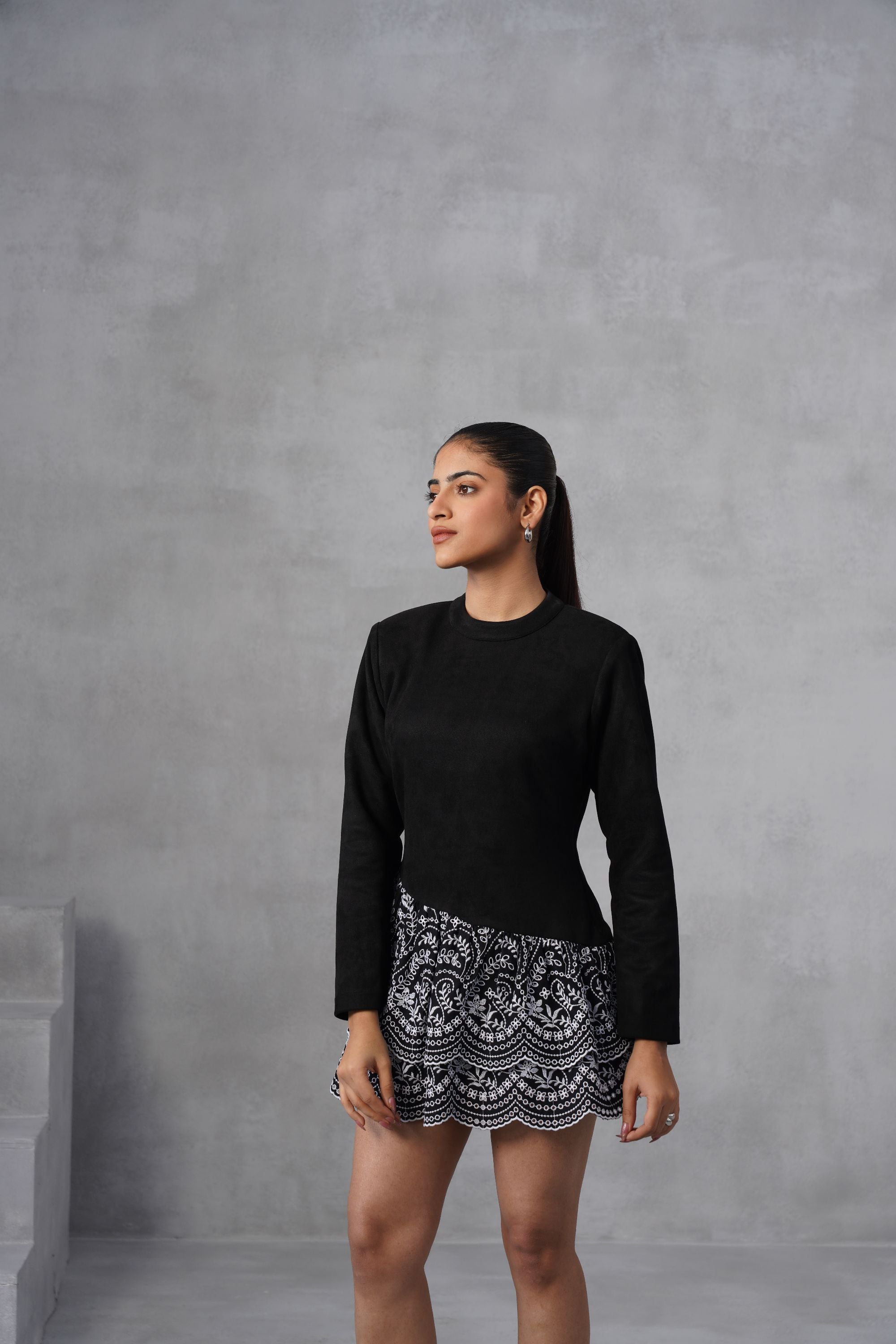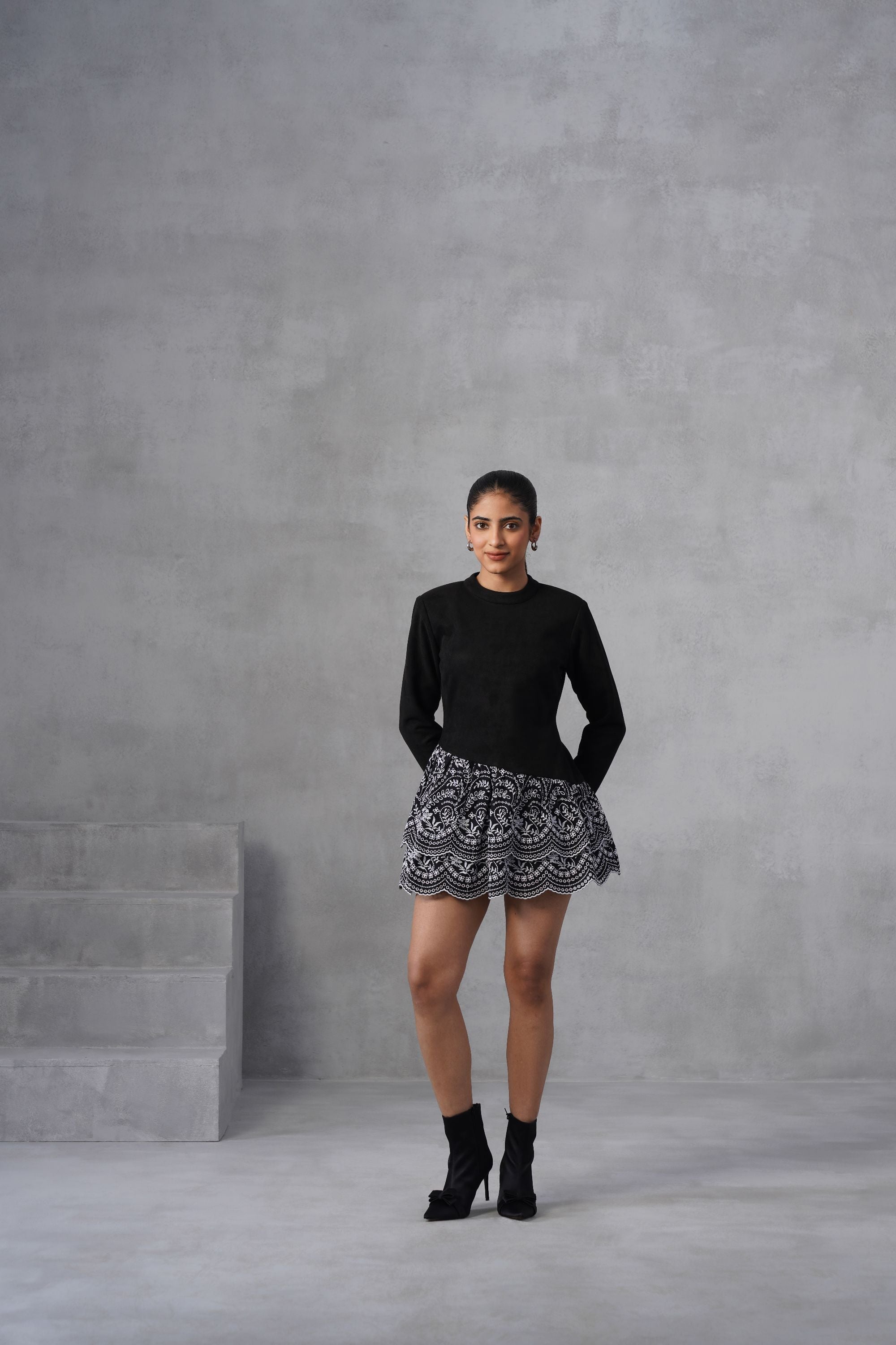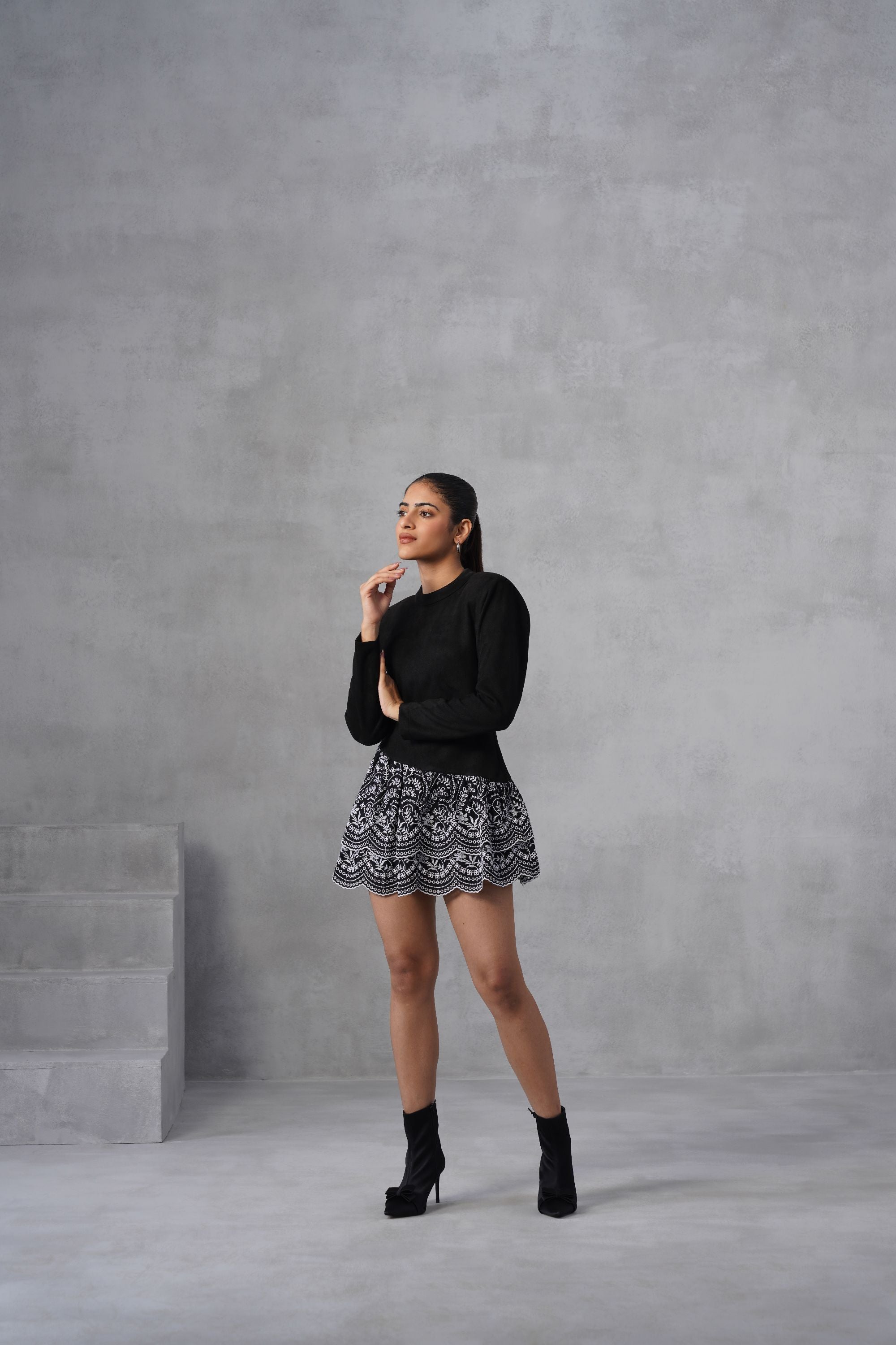 The Noir Filigree Mini Dress features intricate white embroidery and a playful scalloped hem. Perfect for a night out or a stylish casual look.