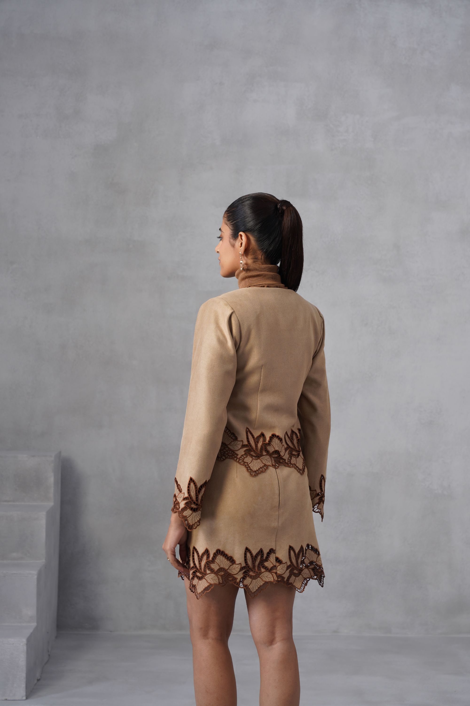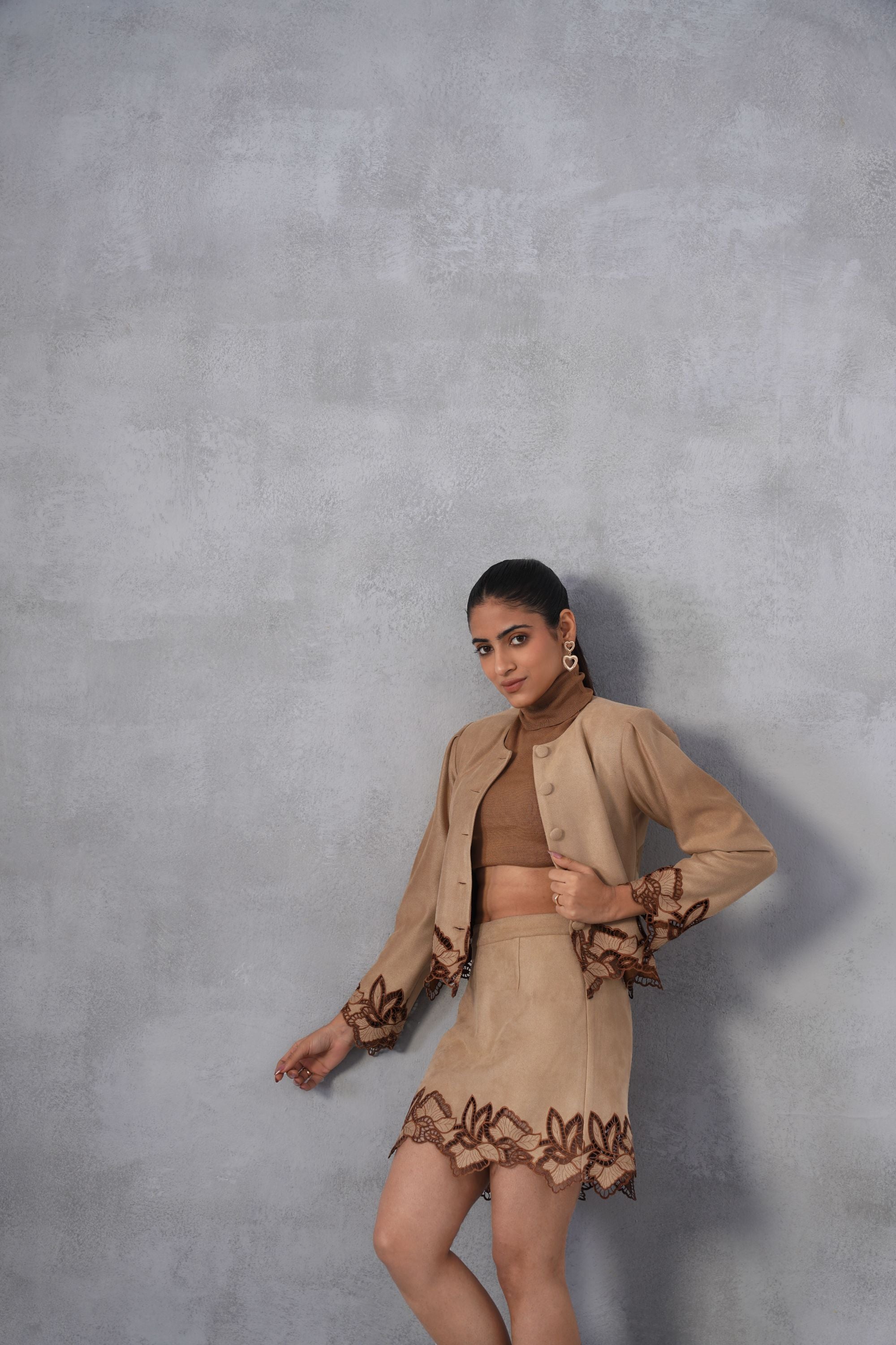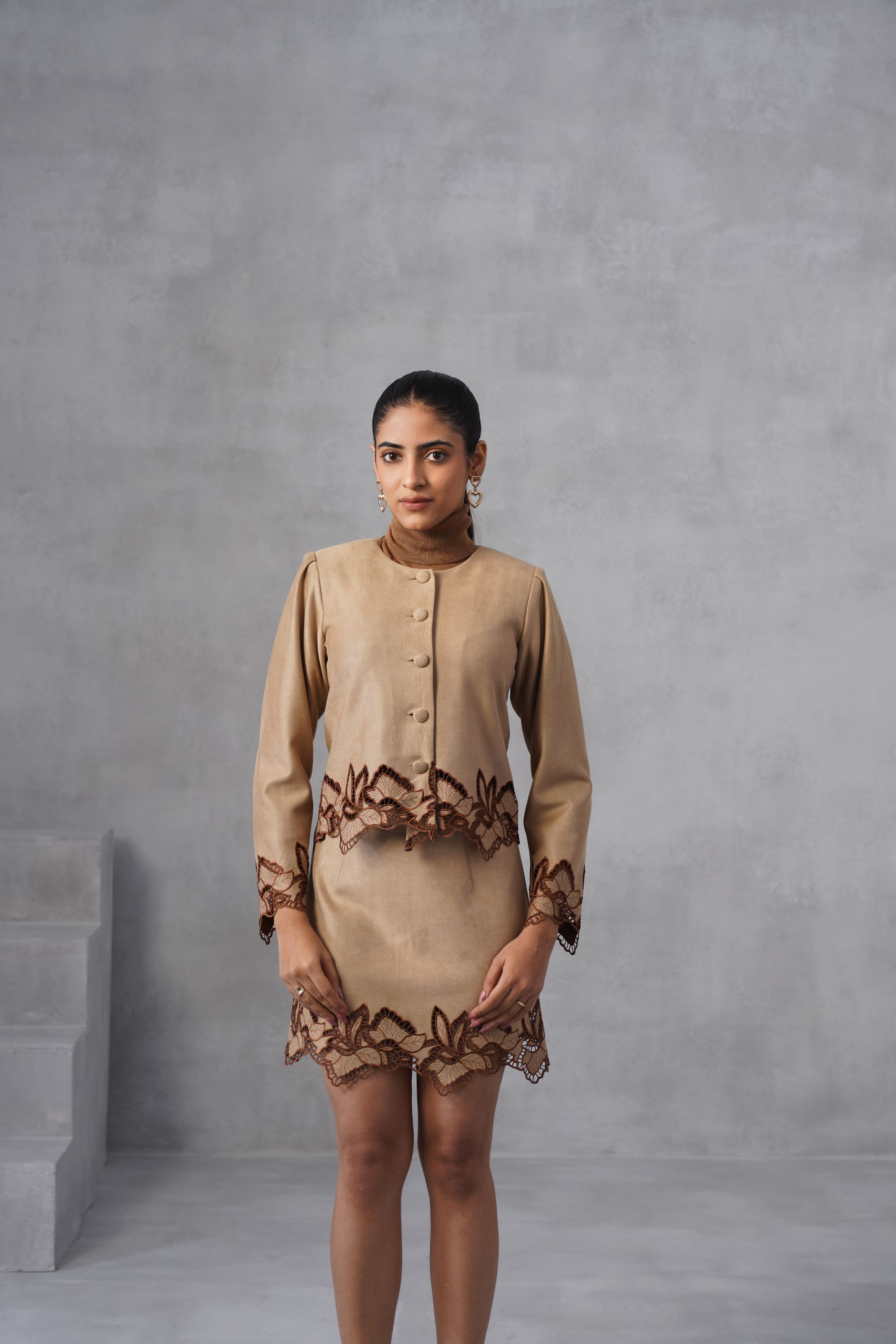 Our Petal Cutwork set features long-sleeved jacket top and a matching skirt, both featuring bold, scalloped cutwork embroidery that defines the look. Top: A button-down, long-sleeved jacket with puffed structed shoulders. The hem of the jacket features a distinctive, large scalloped/leaf-like border in a darker brown color. Bottom: A matching high-waisted mini-skirt. The hem of the skirt also features the same elaborate, dark brown scalloped/leaf-like embroidered border. High-neck inner not included