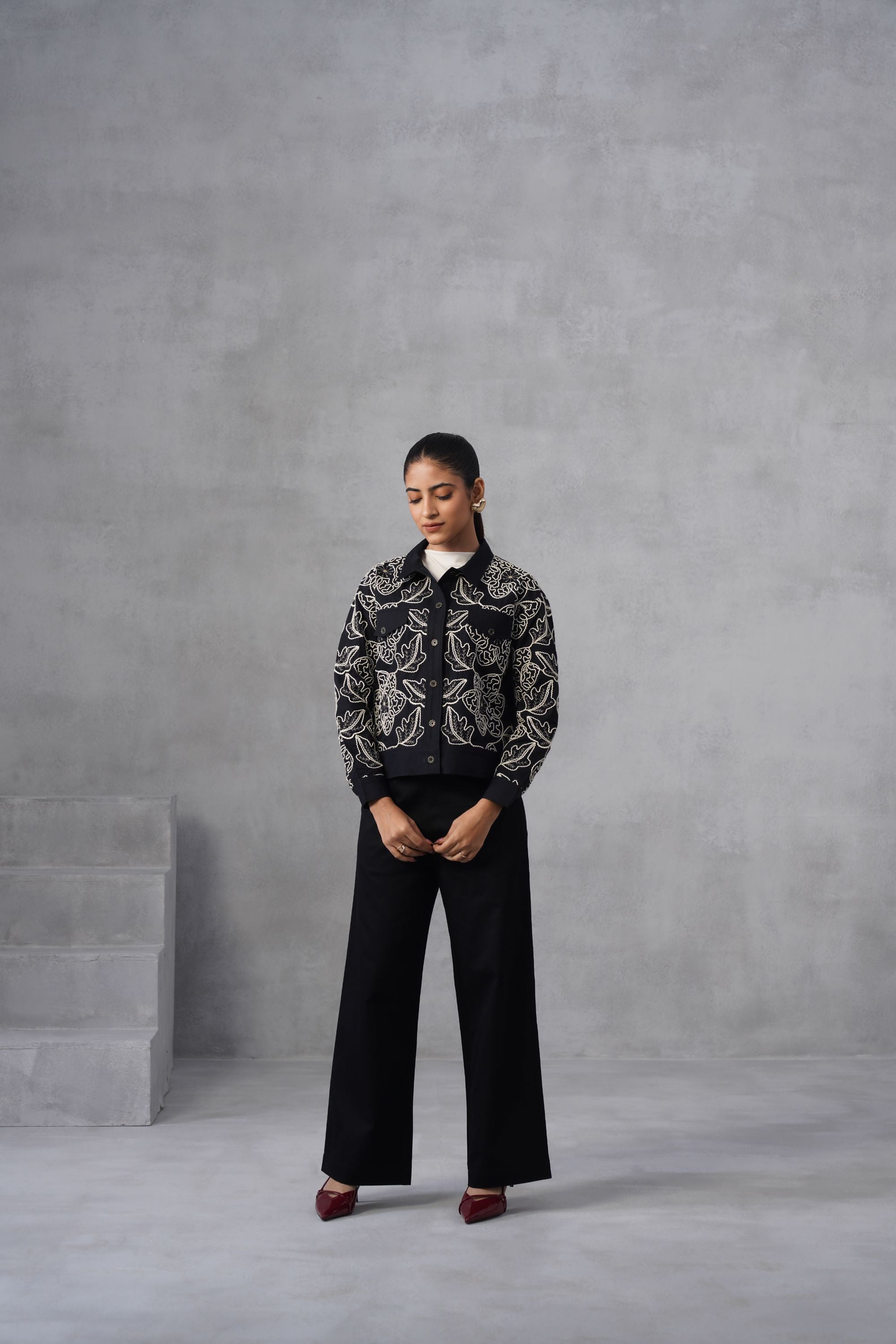 Embroidered Jacket, effortless style. The intricate white foliage pattern on this jacket adds a stunning artisanal texture to a classic silhouette. Top: The central piece is a cropped, black jacket with a classic collar and relaxed fit featuring elaborate and intricate white foliage embroidery. Bottom: The jacket is paired with black high-waisted shorts that have a clean, tailored look. Inner not included