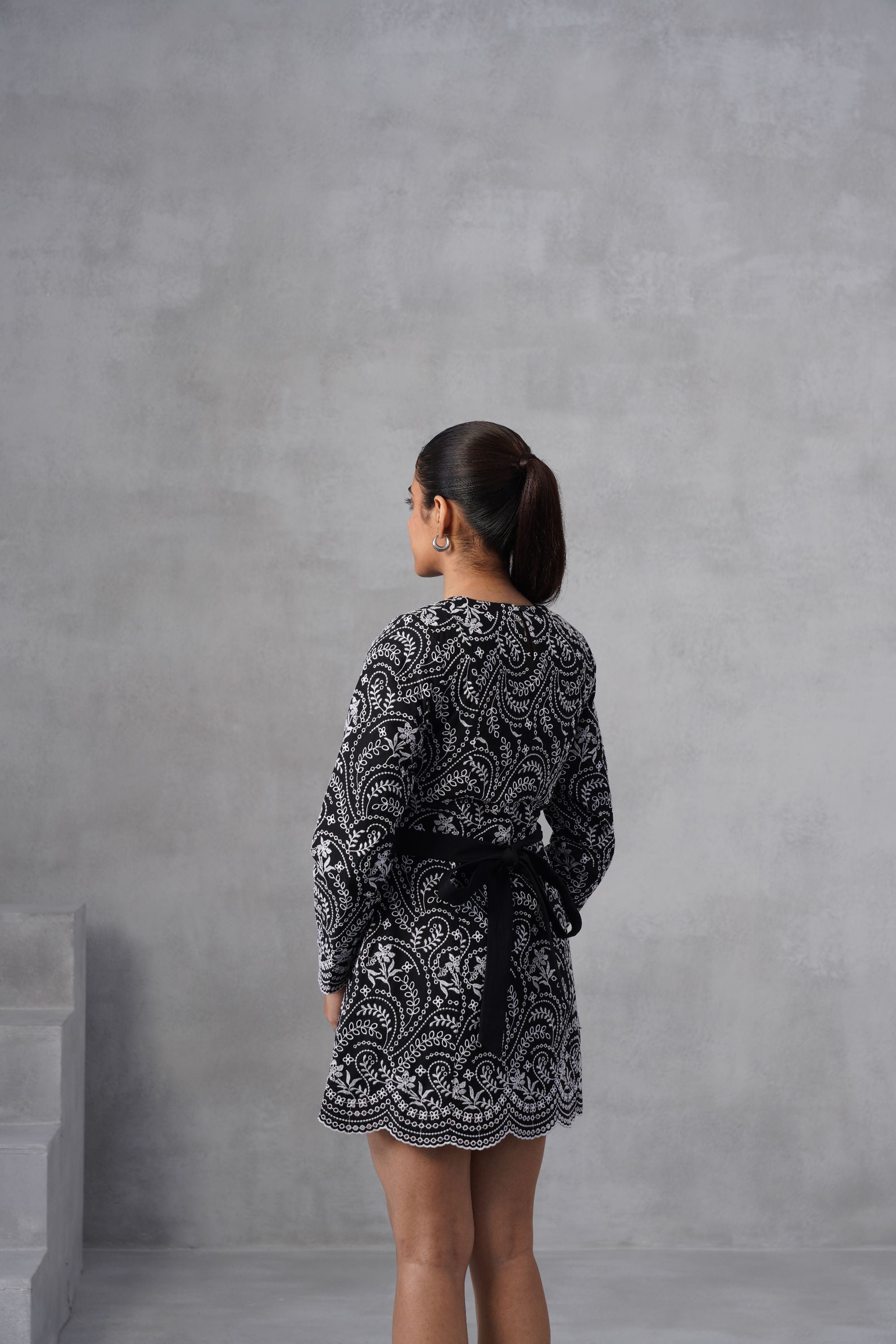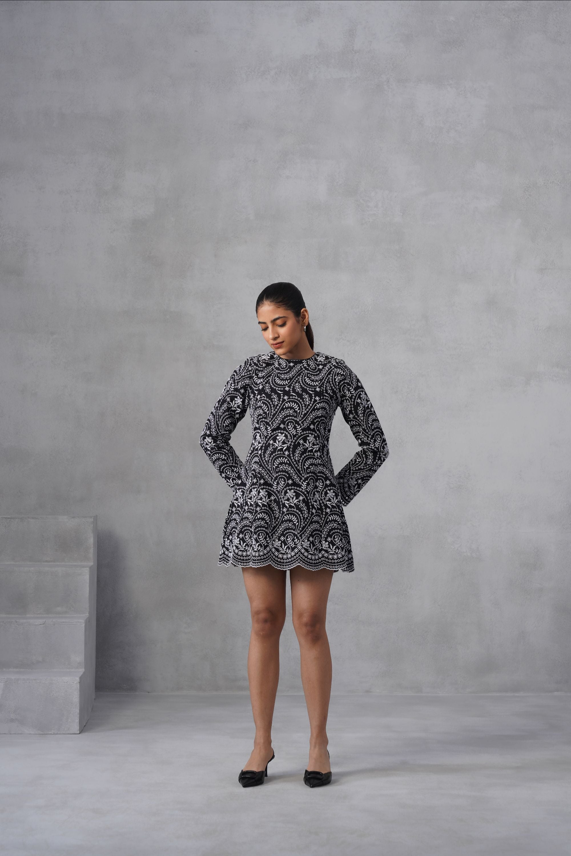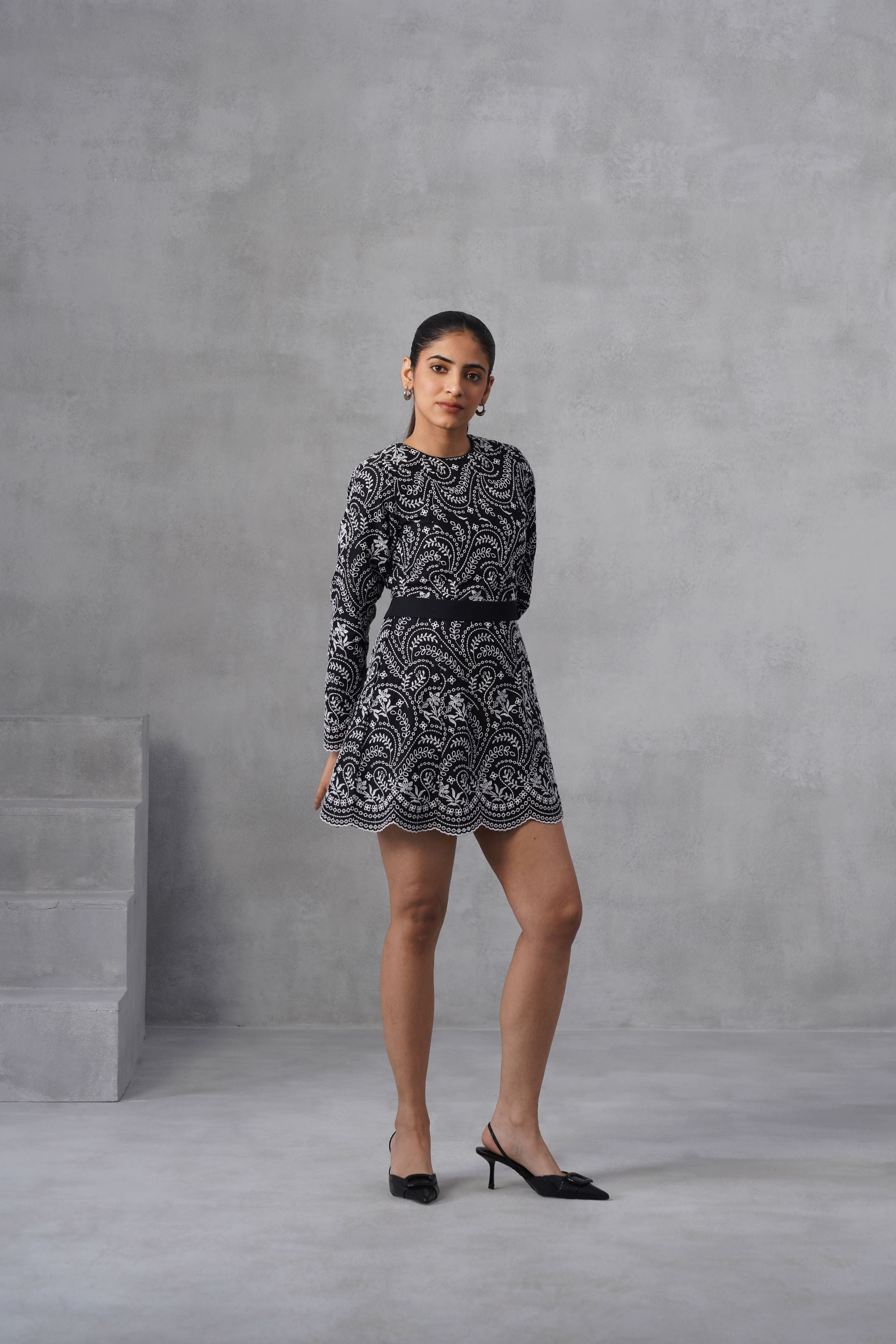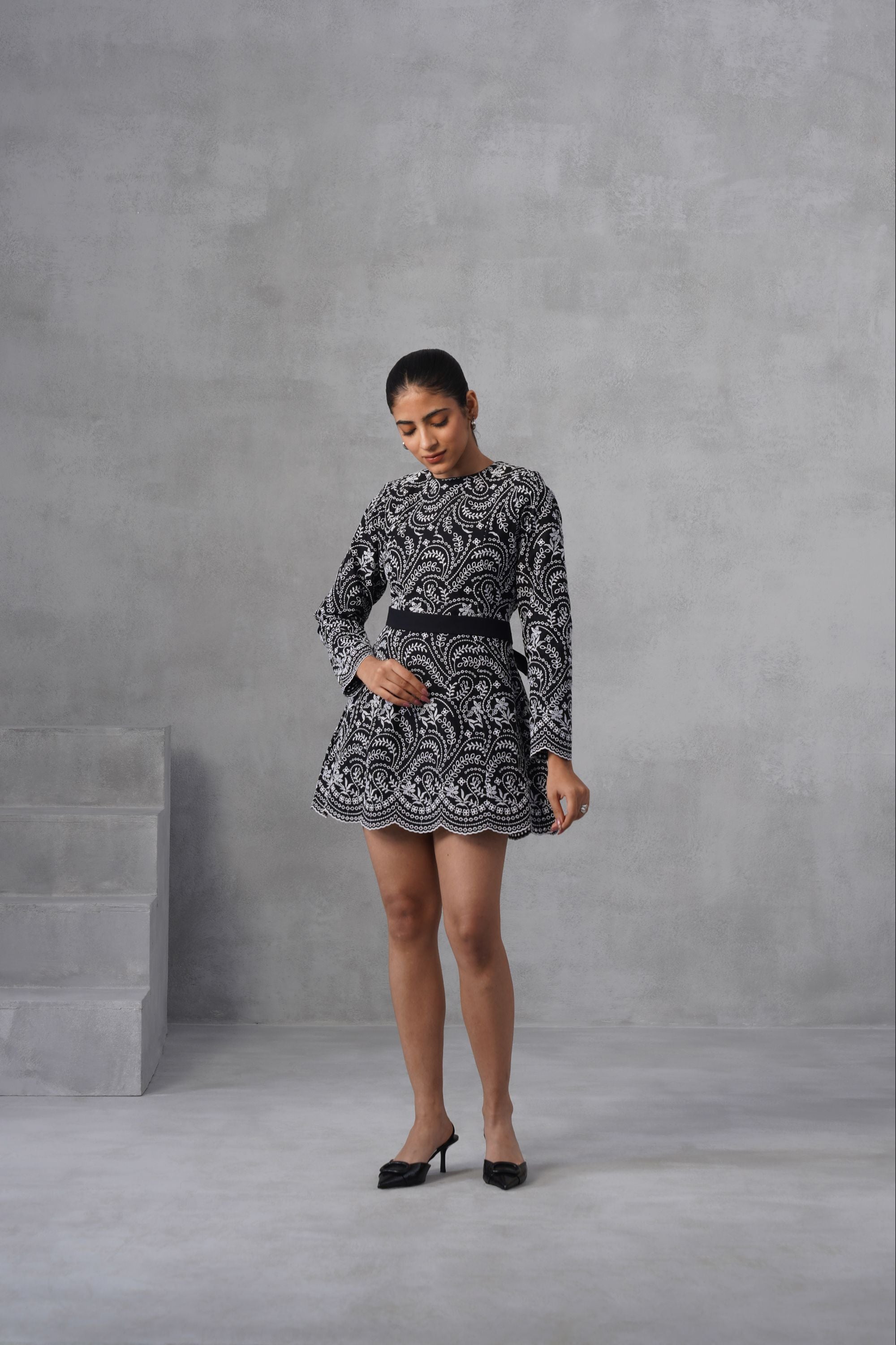 Long-sleeved, high-neck embellished fit-and-flare mini-dress featuring a striking monochrome floral design with a long belt at the waist. Perfect for an evening event.